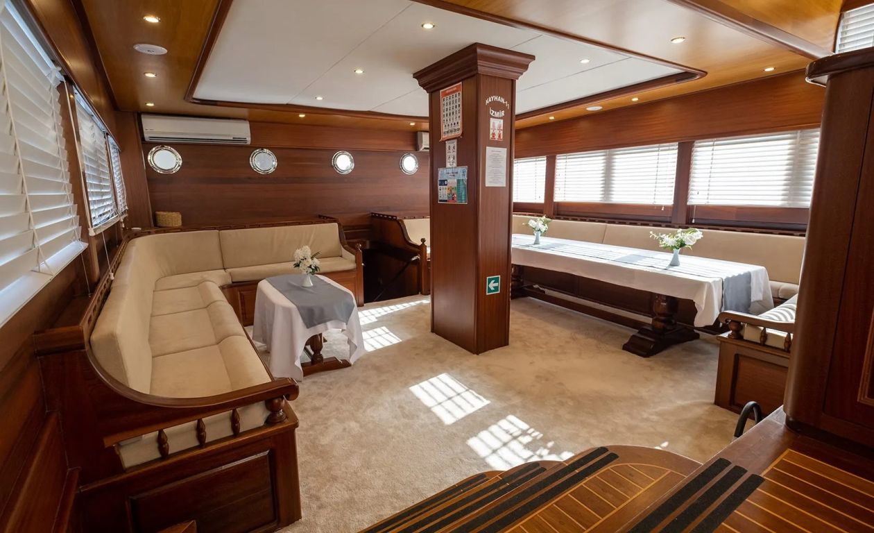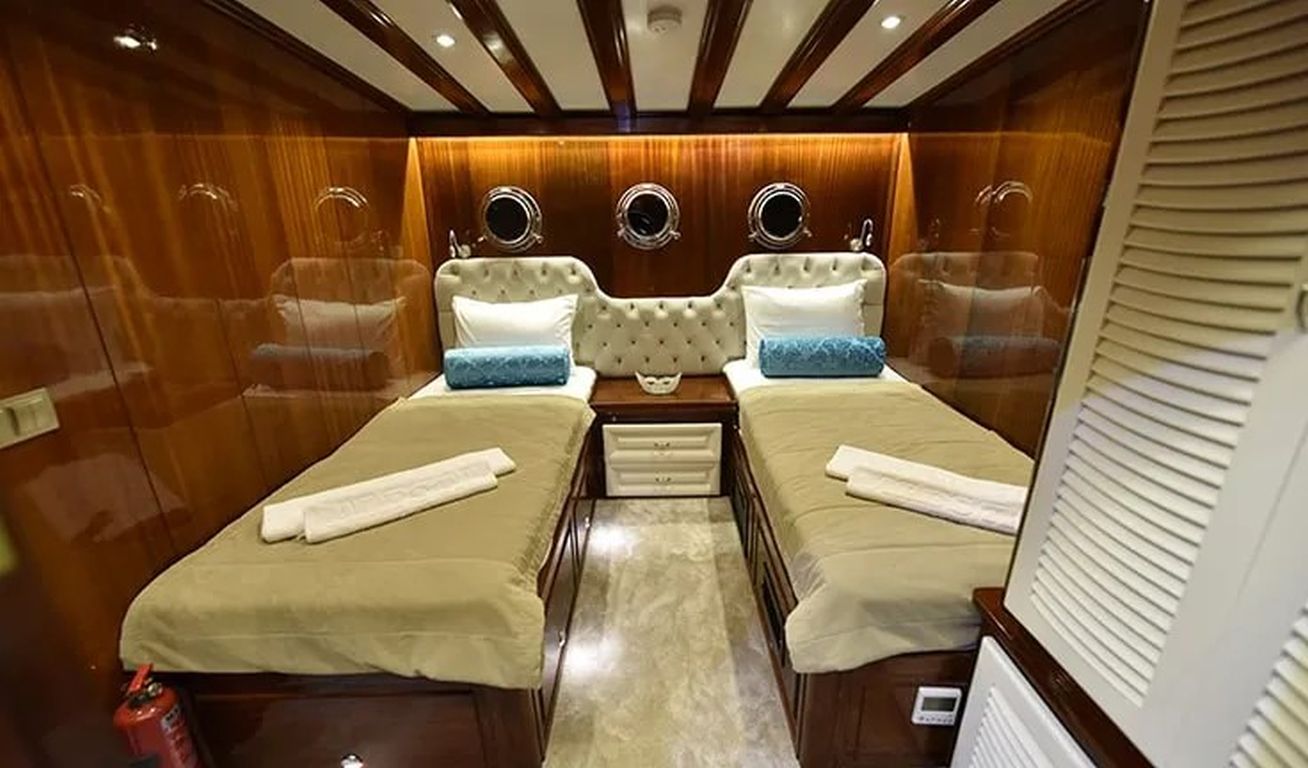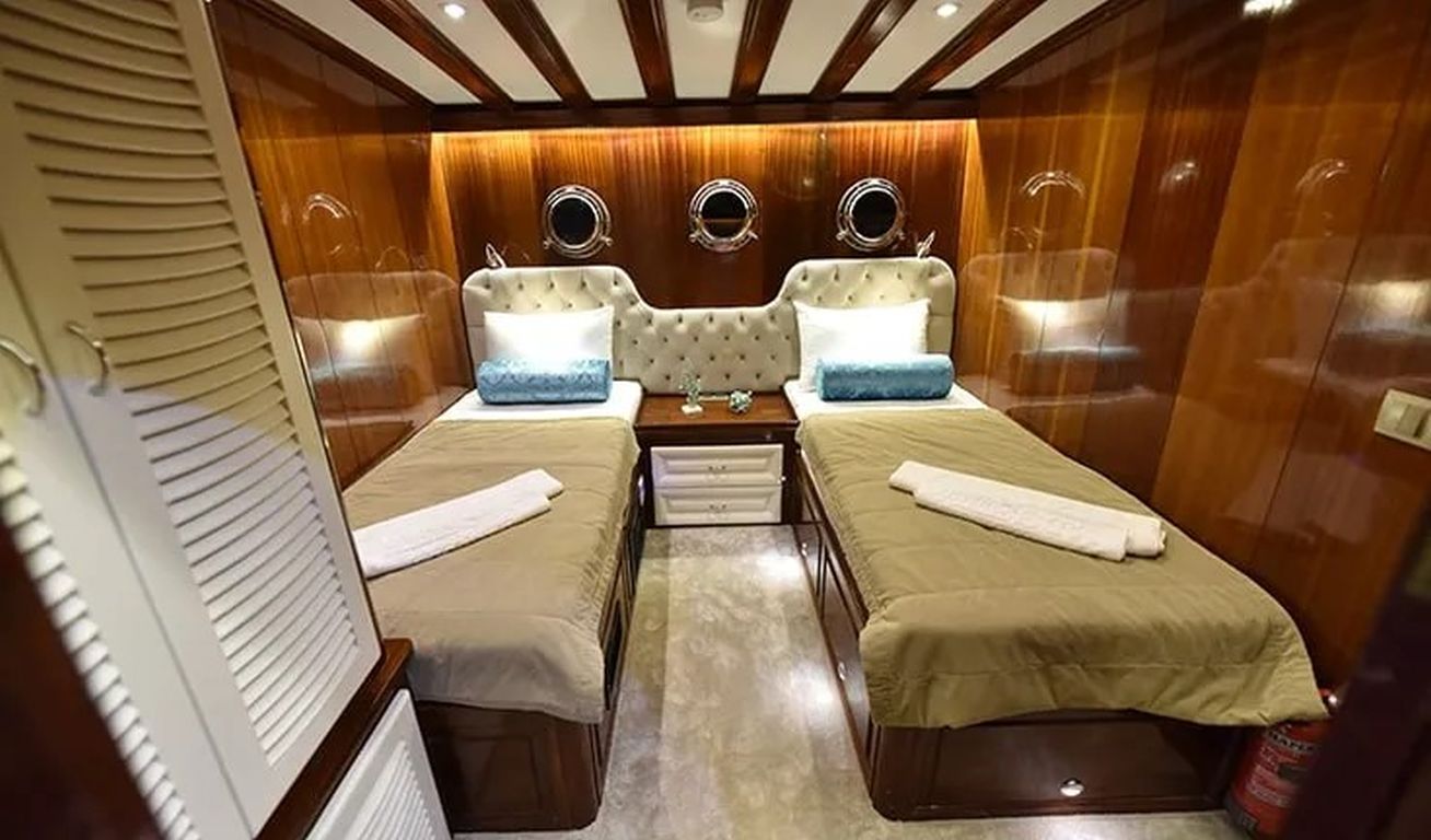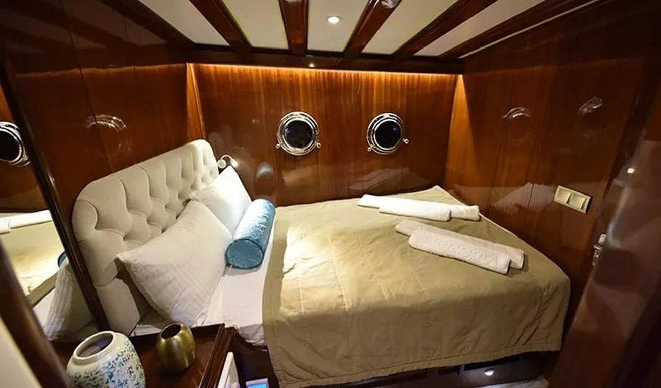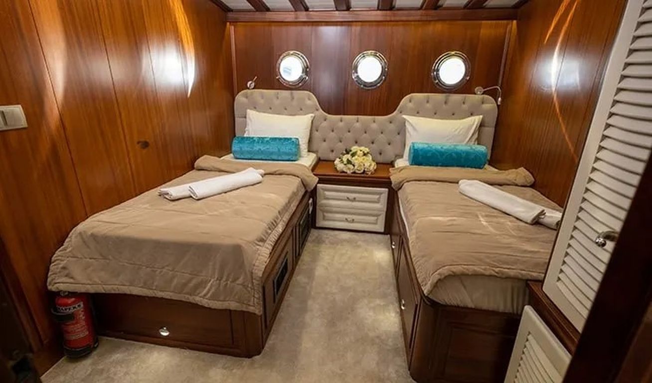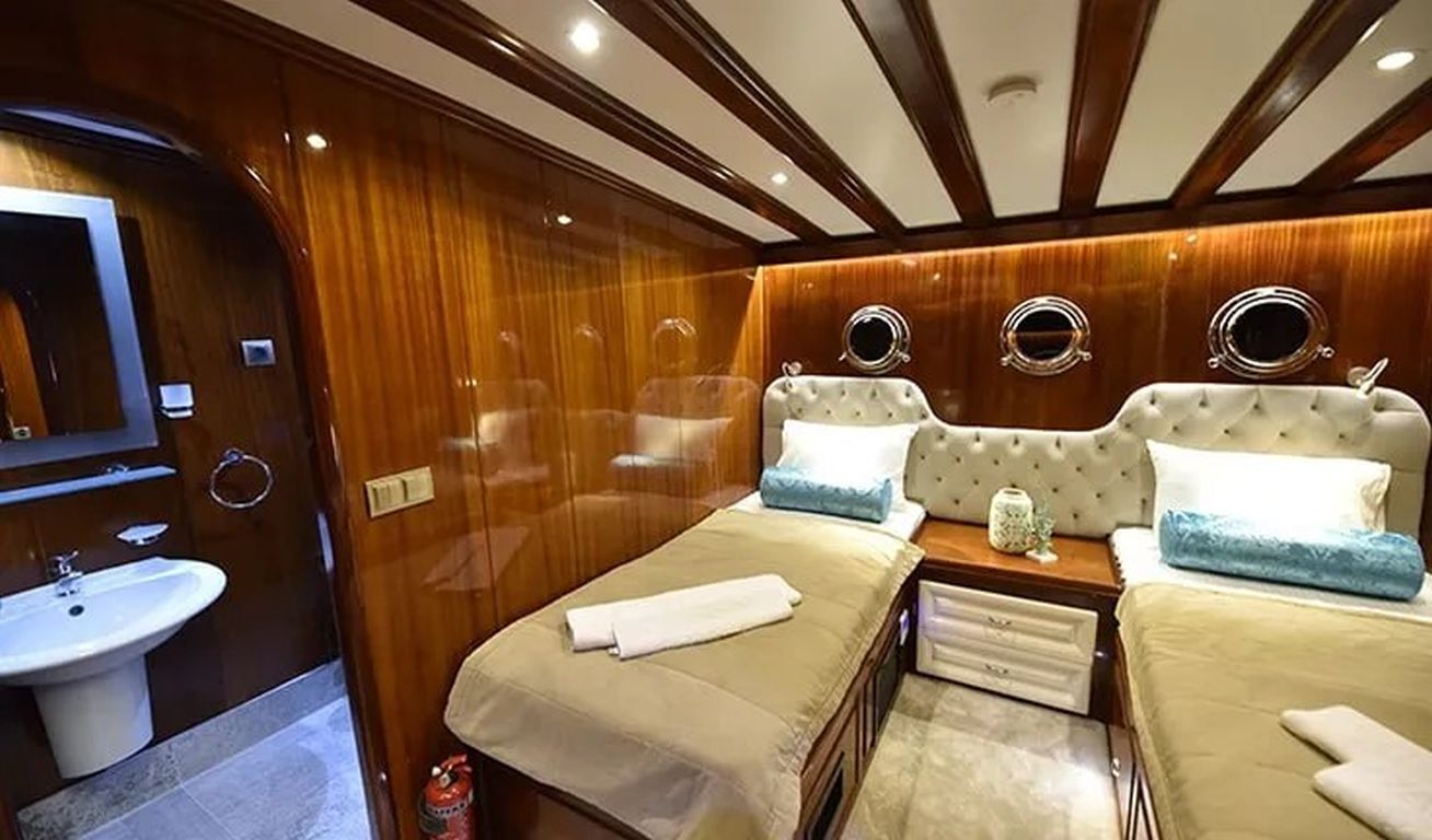 | Гулет Kayhan 11 — это 34-метровый кеч, построенный в 2002 году и капитально отреставрированный в 2017 году. На борту 10 кают: шесть двухместных и четыре с двумя односпальными кроватями, рассчитанные на 20 гостей. Каждая каюта оснащена кондиционером, отдельной ванной комнатой и душем. Кондиционер работает до 8 часов в день, с возможностью продления на ночь за дополнительную плату. Просторная палуба включает обеденные зоны под навесом, мягкие диваны и большие зоны для загара. Внутри салон оборудован обеденным столом, баром и удобными сиденьями. Среди водных развлечений: каноэ и водные лыжи. Дополнительно предлагаются вейкборд, ринго и сап-борды. Также доступны маски с трубками и рыболовные снасти. Судно оснащено двумя двигателями Iveco по 450 л.с. и двумя генераторами Onan по 45 кВт, что позволяет идти со скоростью 11 узлов. Kayhan 11 — отличный выбор для больших групп, предлагающий элегантный дизайн и профессиональное обслуживание. |