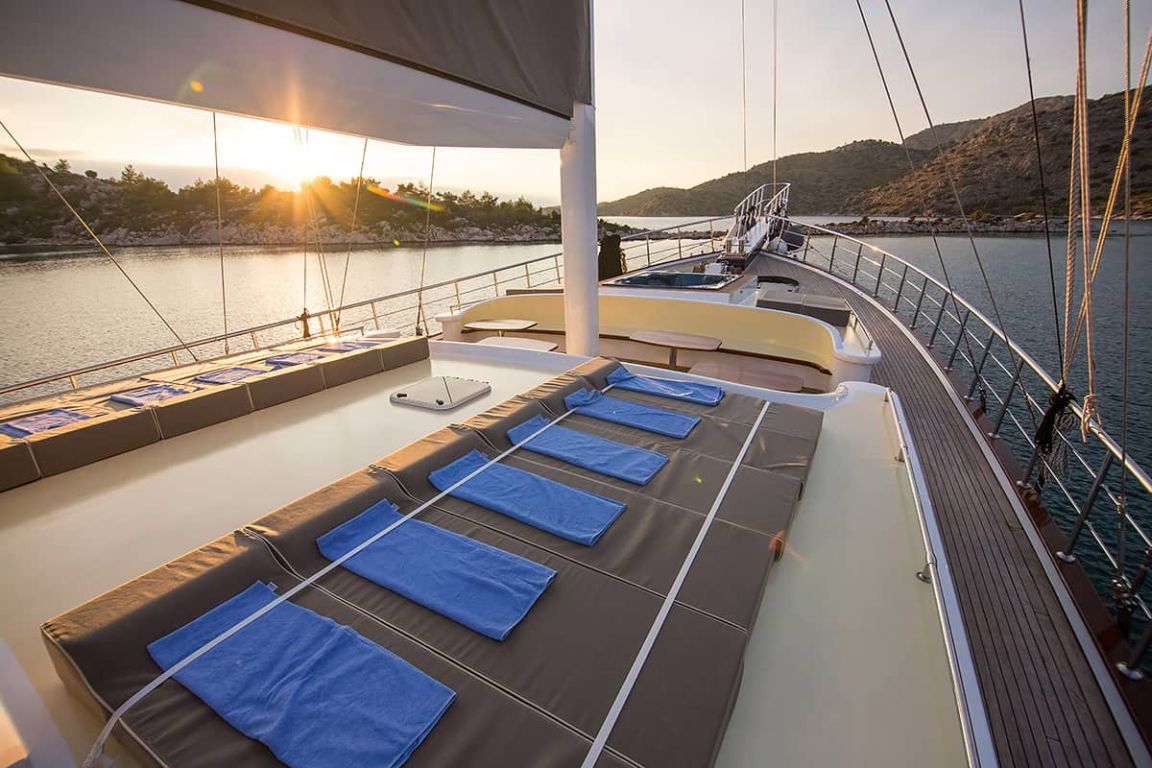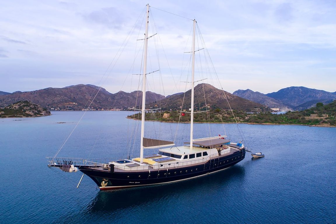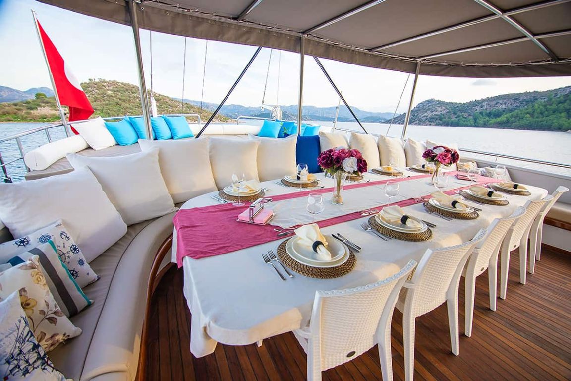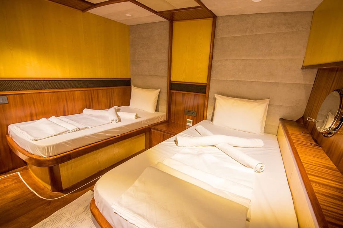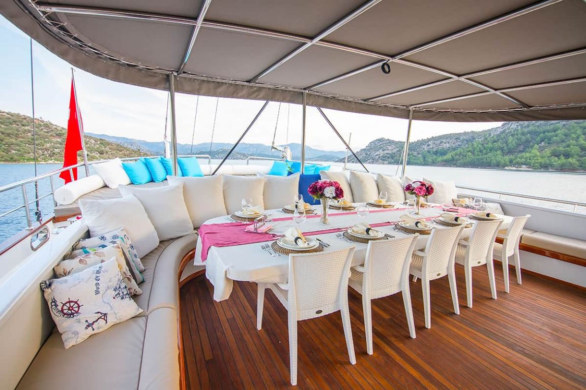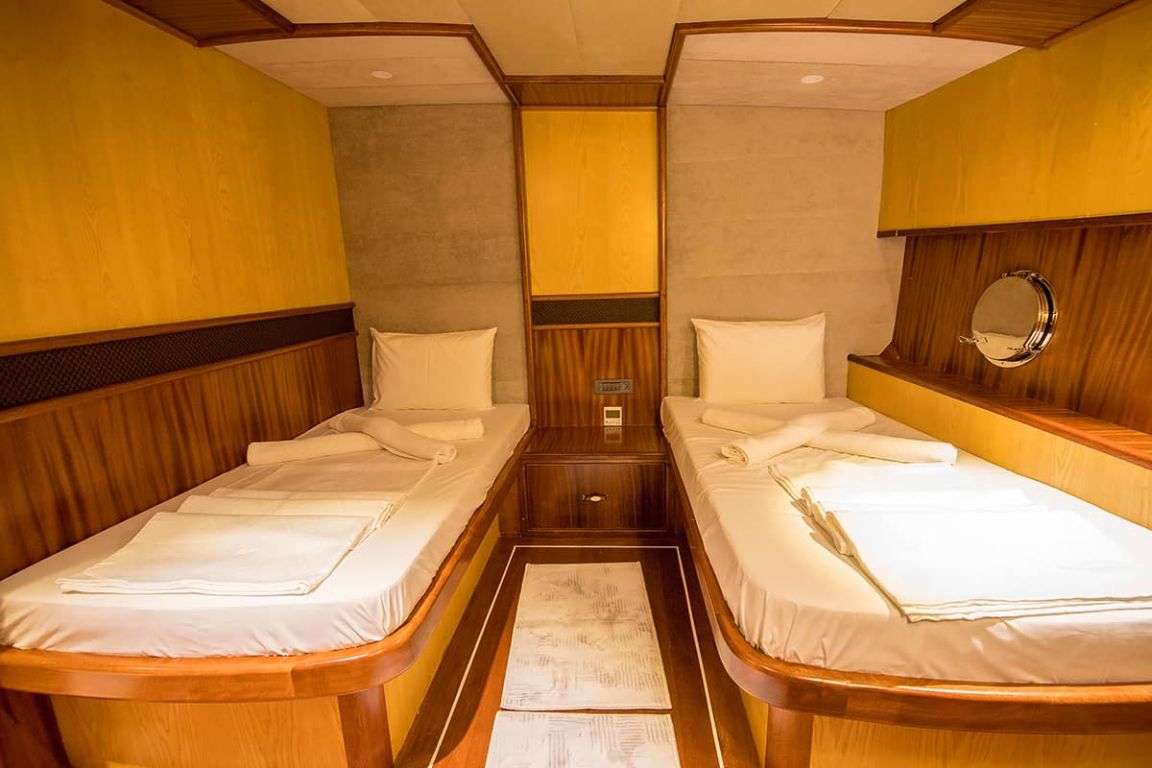 Наш гулет с 10 каютами имеет 2 мастер-каюты, 6 двухместных и 2 двухместные каюты с кондиционером, туалетом и душем в каждой каюте и может легко разместить в общей сложности 20 гостей. Большая и удобная гостиная оборудована таким оборудованием, как телевизор, спутниковое телевидение и CD-плеер, чтобы сделать ваше время вне моря более приятным. Пока вы наслаждаетесь блюдами, приготовленными на нашей полностью оборудованной кухне, вы также можете открыть для себя все оттенки синего.