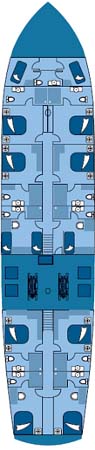 | До 20 гостей; 9 двухместных, 1 двухместная каюта, кондиционер, телевизор во всех каютах, душевая кабина и туалеты домашнего типа во всех каютах, отдельные каюты для экипажа |