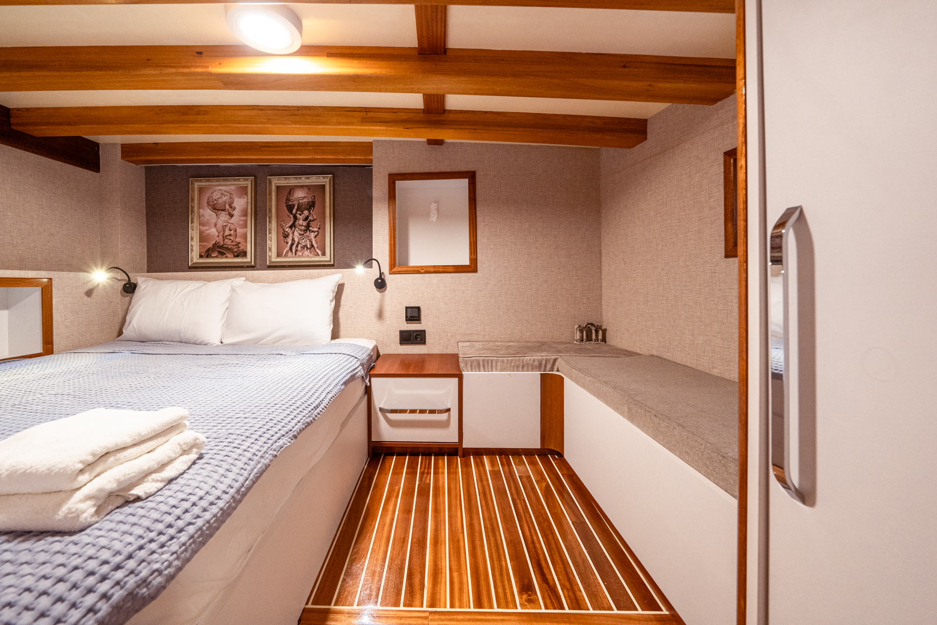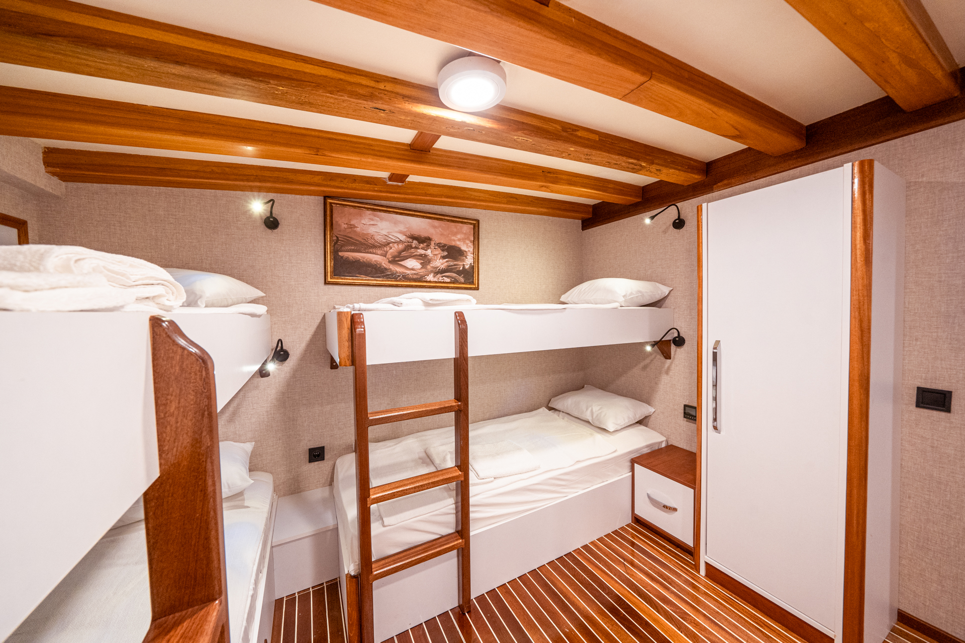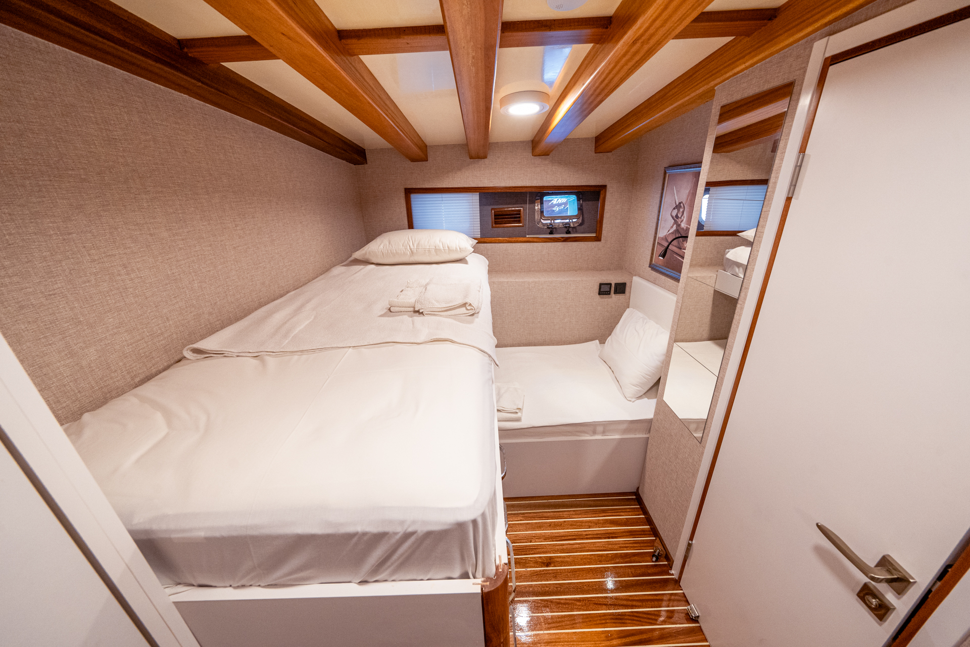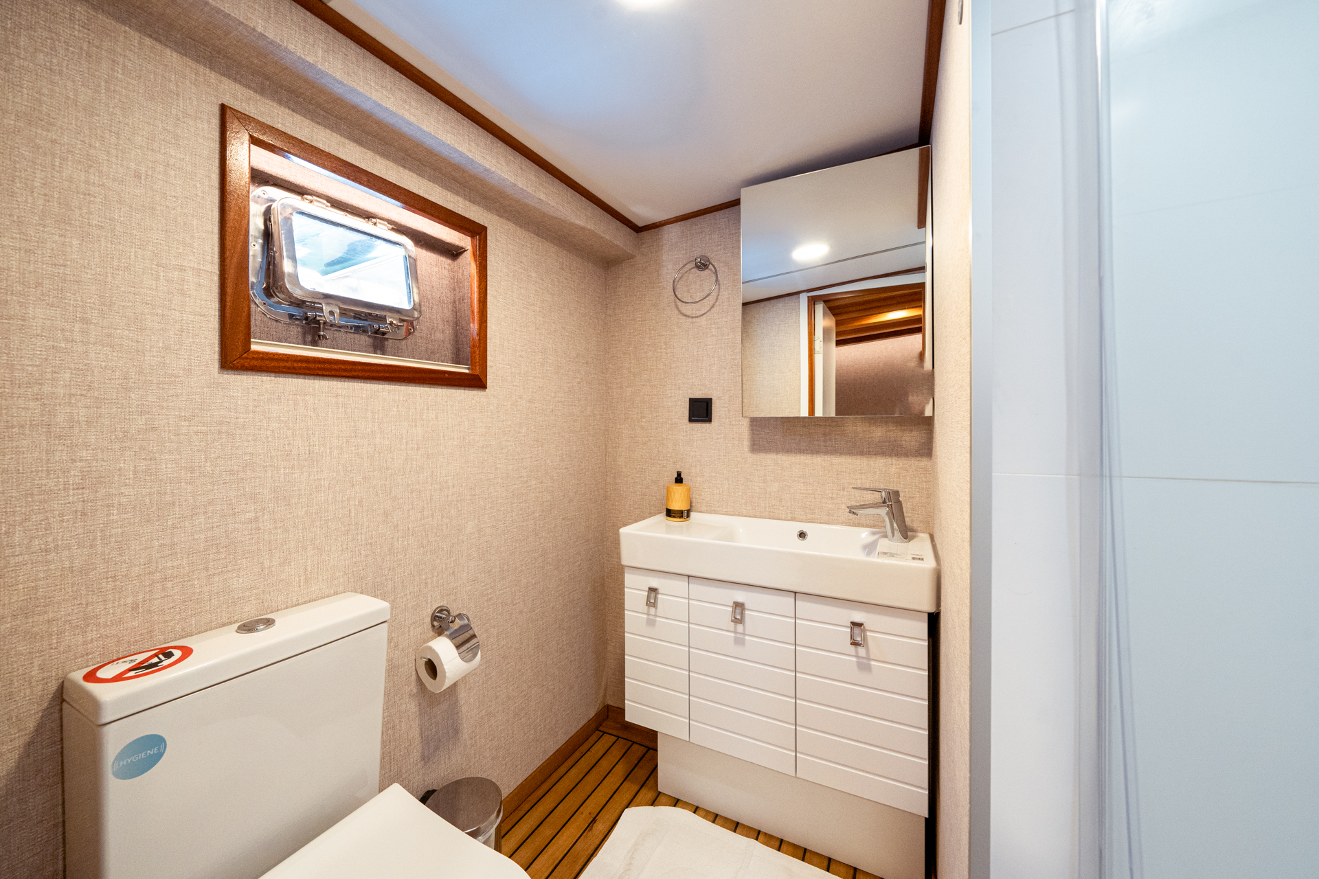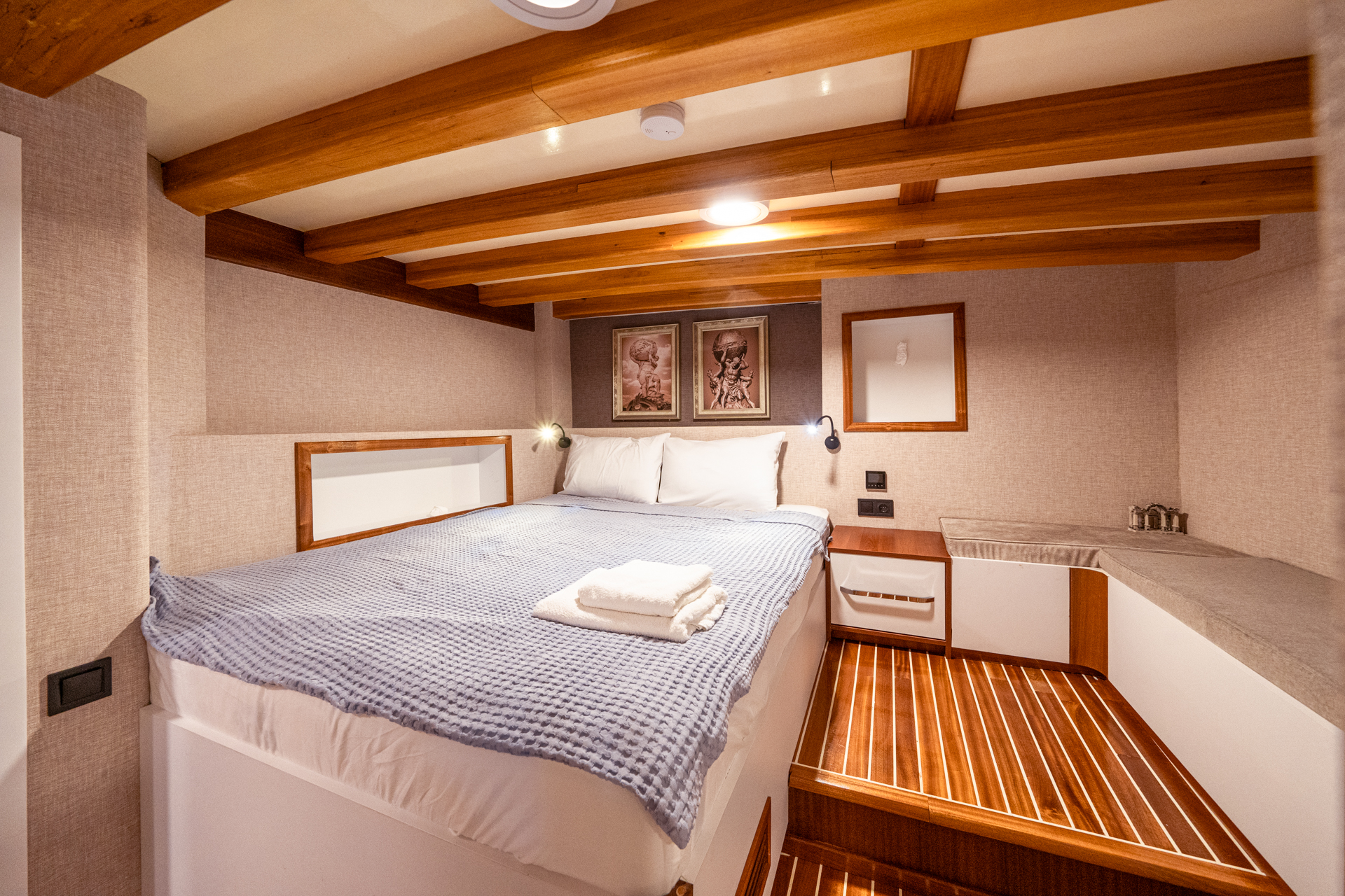 | Гулет Boreas — это 43-метровая яхта, построенная в 2010 году и обновлённая в 2023 году. На борту 16 кают: 8 двухместных, 6 трёхместных и 2 одноместные, всего до 36 гостей. Каждая каюта оснащена кондиционером и отдельной ванной комнатой. Кондиционер работает 18 часов в сутки. Ширина корпуса 10 метров обеспечивает просторные палубы, включающие обеденные зоны с навесом, мягкие лаундж-зоны и обширные места для загара. Интерьер салона оформлен со вкусом и включает зону отдыха и обеденный стол. Boreas предлагает разнообразные водные развлечения: тендер мощностью 50 л.с., SUP-борд, водные лыжи, ринго, каноэ, снаряжение для сноркелинга и рыбалки. Яхта оснащена двумя двигателями Cummins мощностью по 450 л.с., а также генераторами 115 кВА, 41 кВА и 13 кВА, что позволяет развивать скорость 10 узлов. Boreas идеально подойдёт для больших компаний, которые хотят насладиться комфортным и увлекательным «Голубым круизом». |