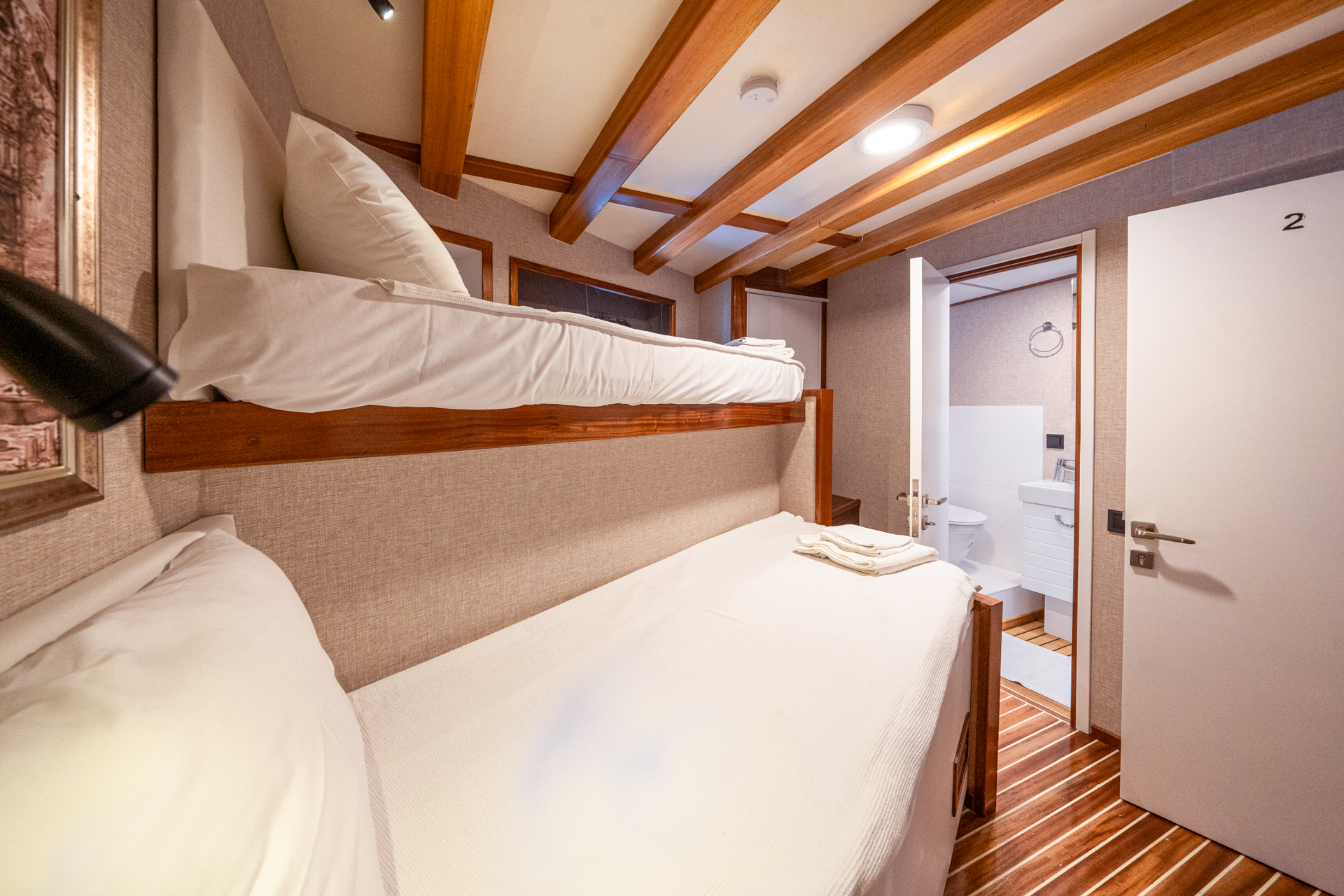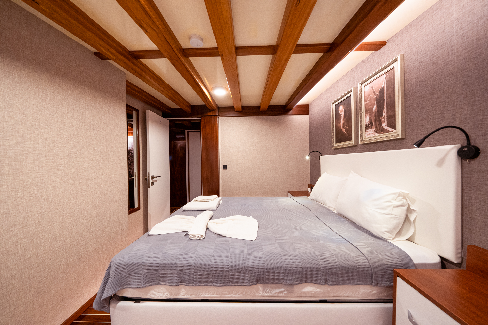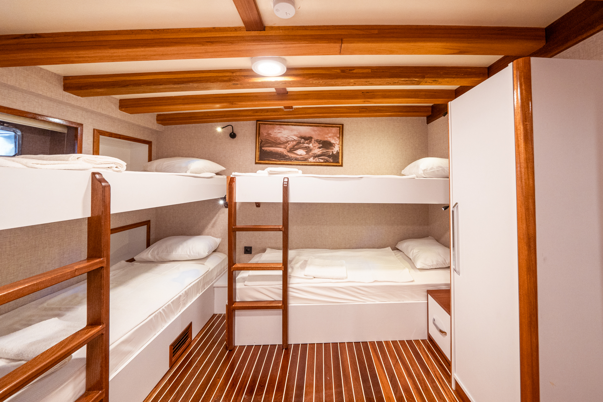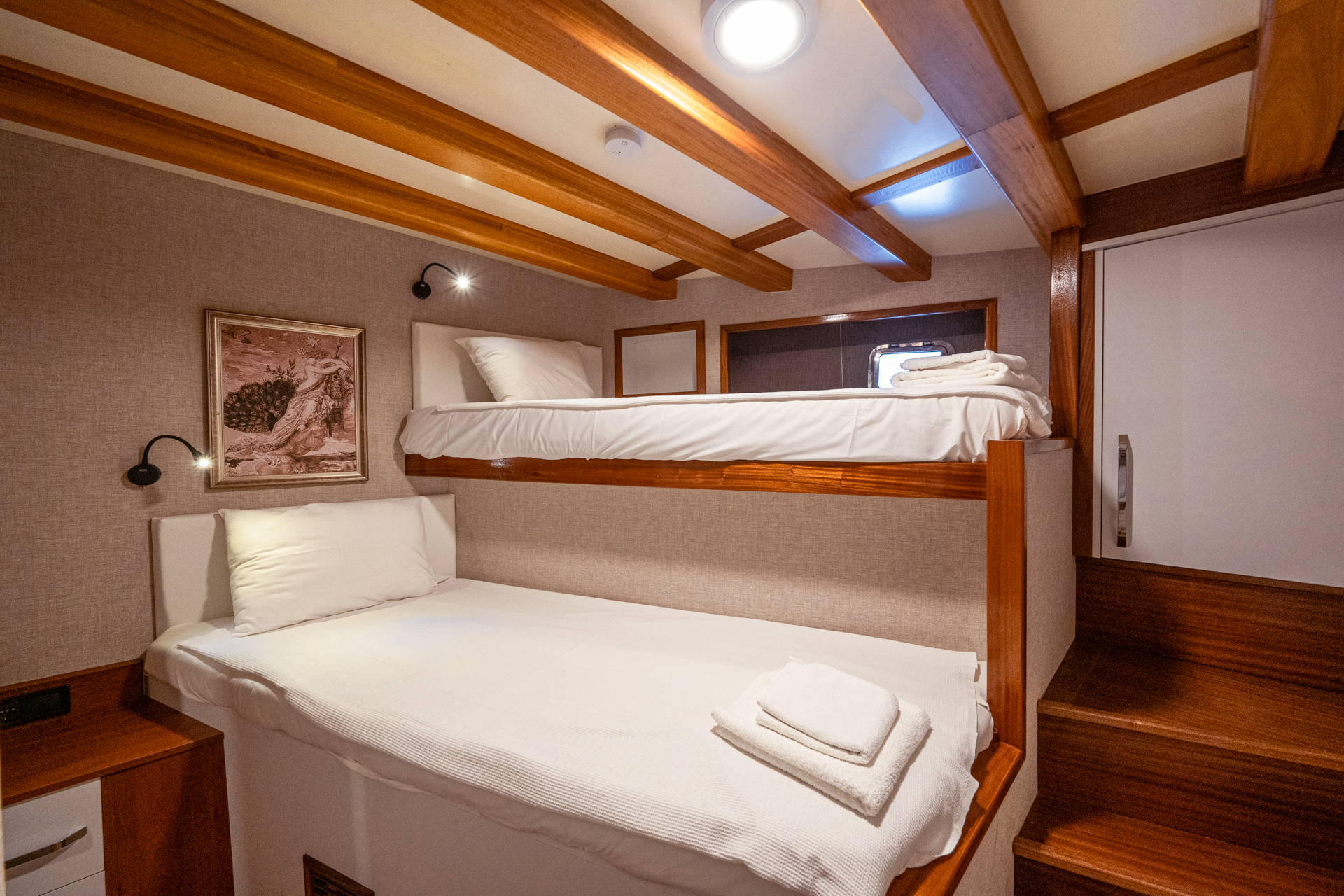 | 16 кают, до 36 гостей; 4 мастер-каюты, 8 двухместных кают, 4 каюты с четырьмя кроватями, кондиционер в салоне и во всех каютах, телевизор во всех каютах, душевая кабина и туалеты домашнего типа во всех каютах, отдельные каюты для экипажа |