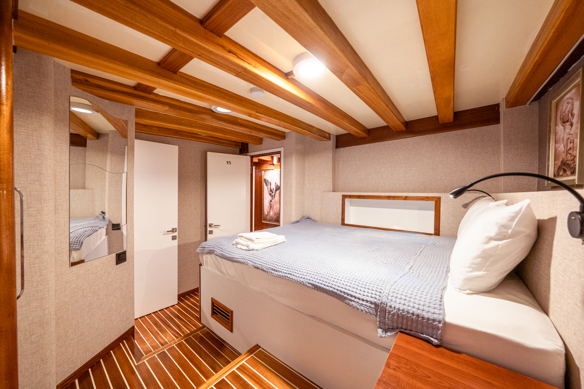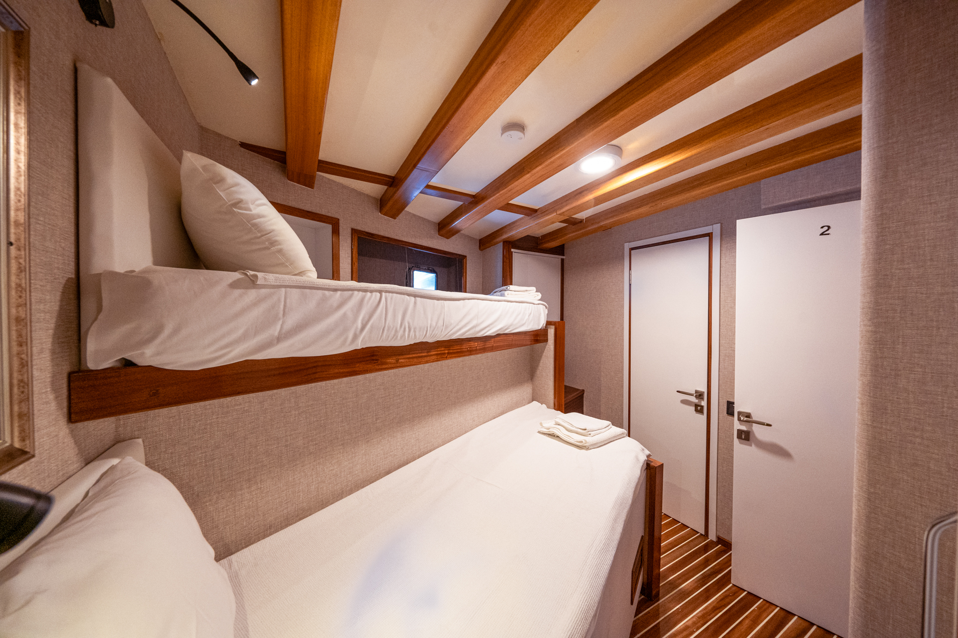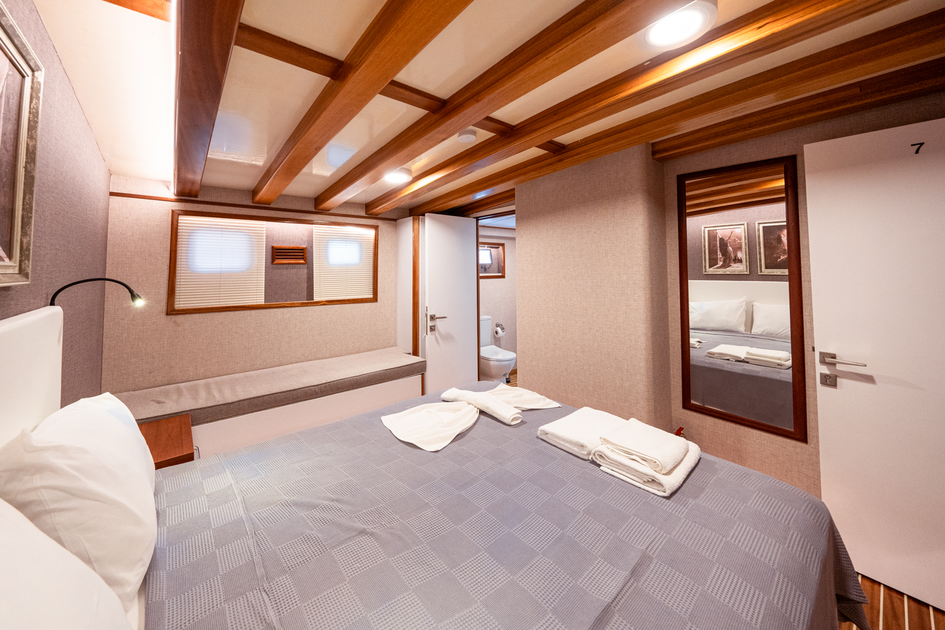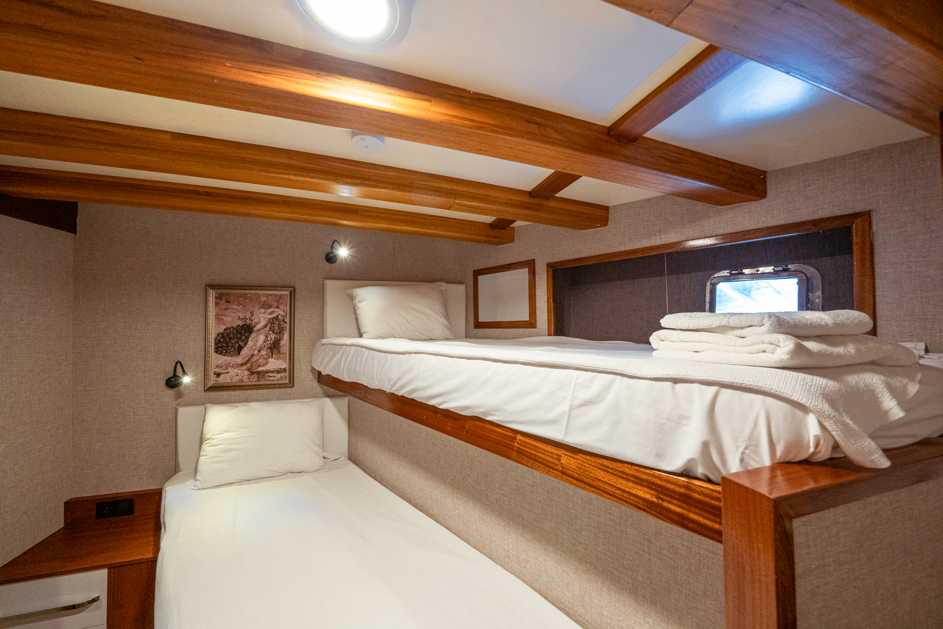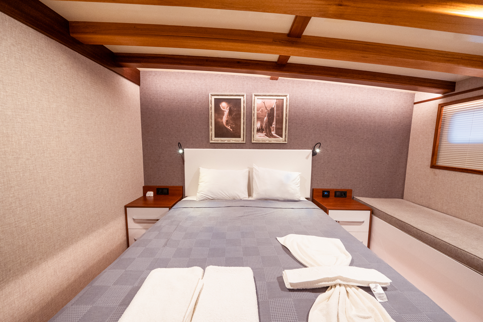| 16 кают, до 36 гостей; 4 мастер-каюты, 8 двухместных кают, 4 каюты с четырьмя кроватями, кондиционер в салоне и во всех каютах, телевизор во всех каютах, душевая кабина и туалеты домашнего типа во всех каютах, отдельные каюты для экипажа |