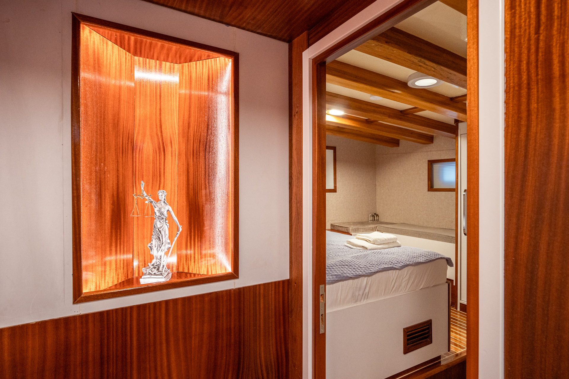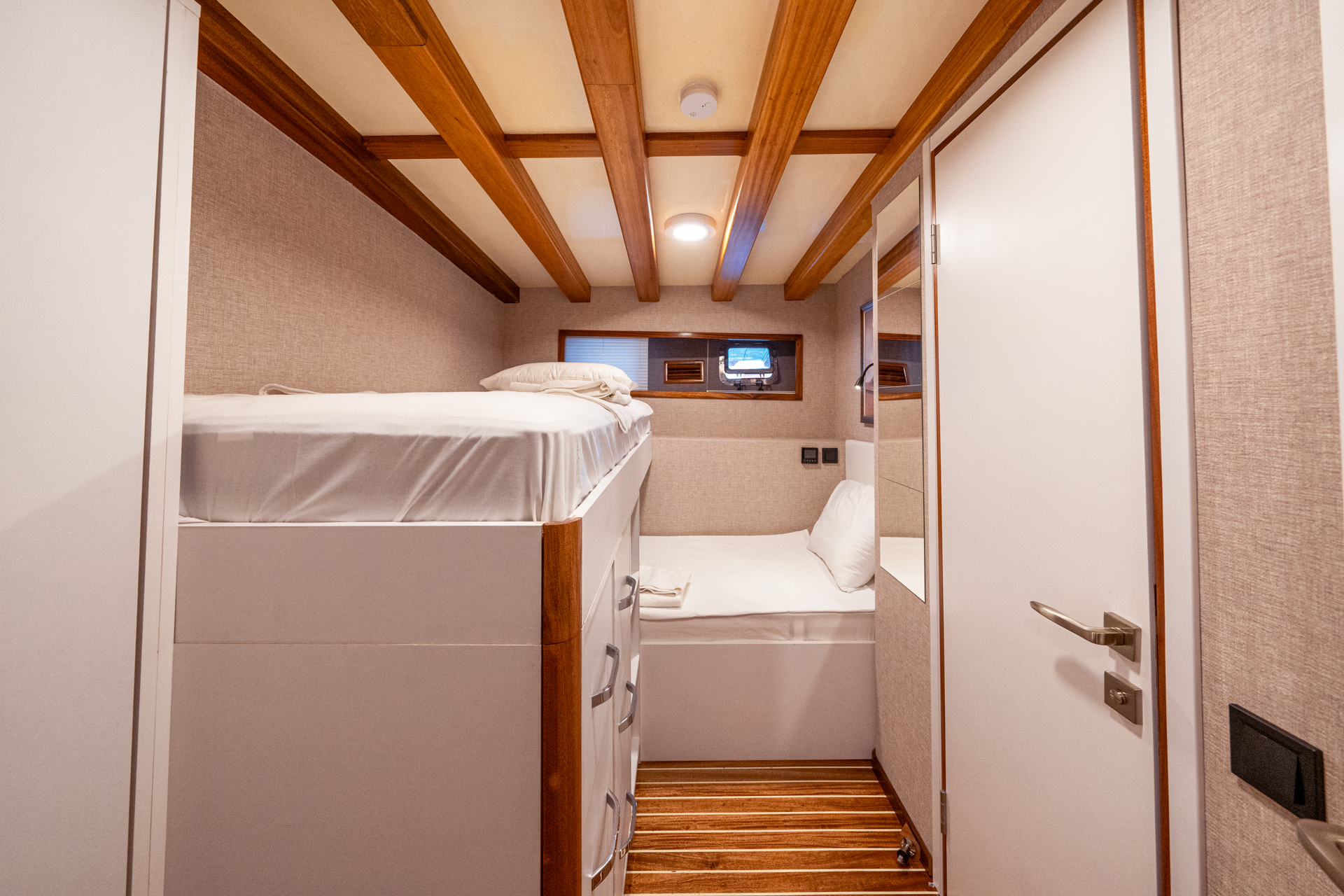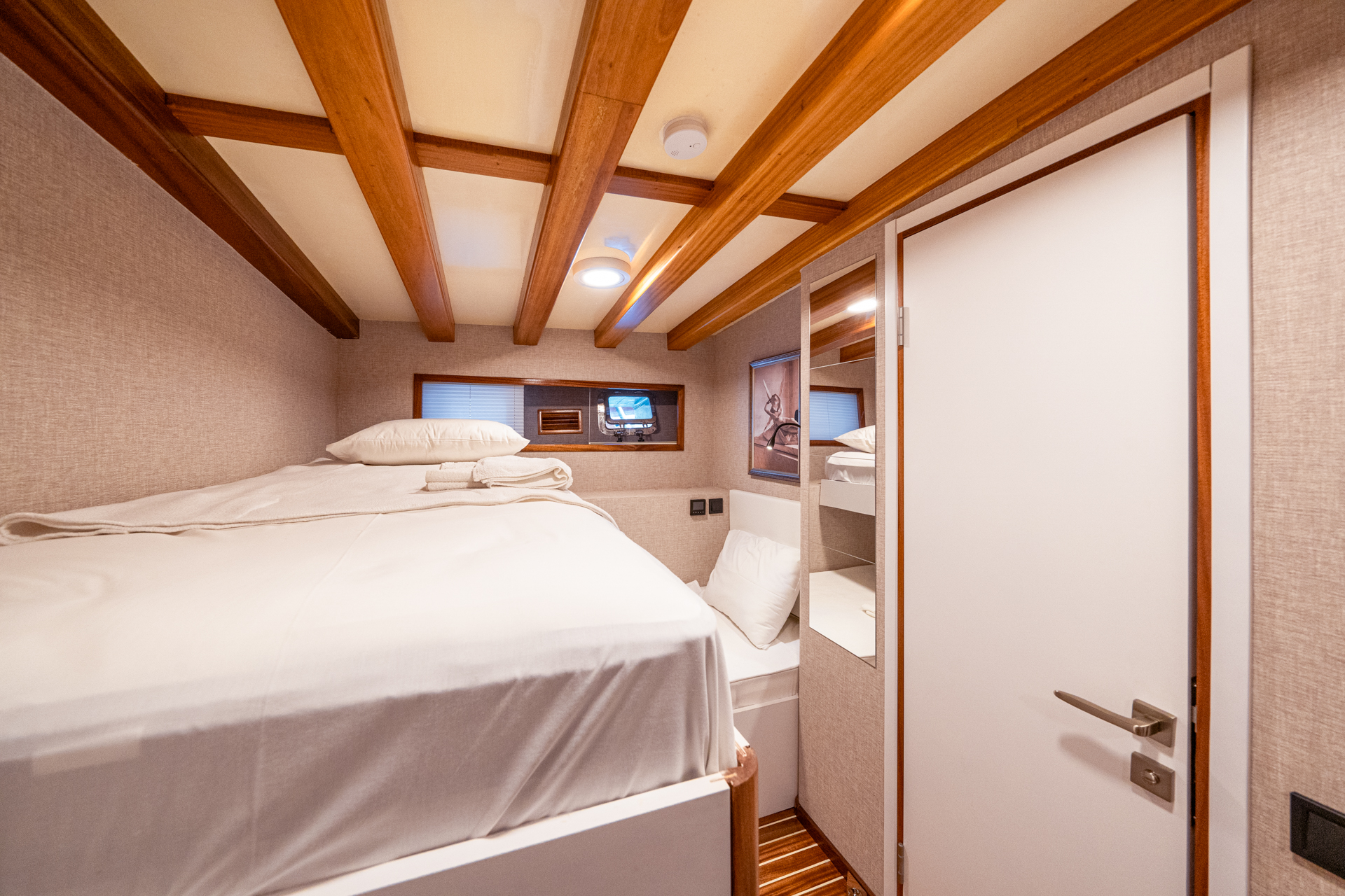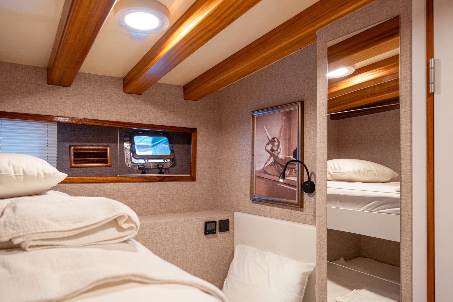 | 16 кают, до 36 гостей; 4 мастер-каюты, 8 двухместных кают, 4 каюты с четырьмя кроватями, кондиционер в салоне и во всех каютах, телевизор во всех каютах, душевая кабина и туалеты домашнего типа во всех каютах, отдельные каюты для экипажа |