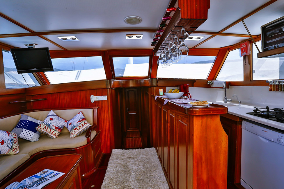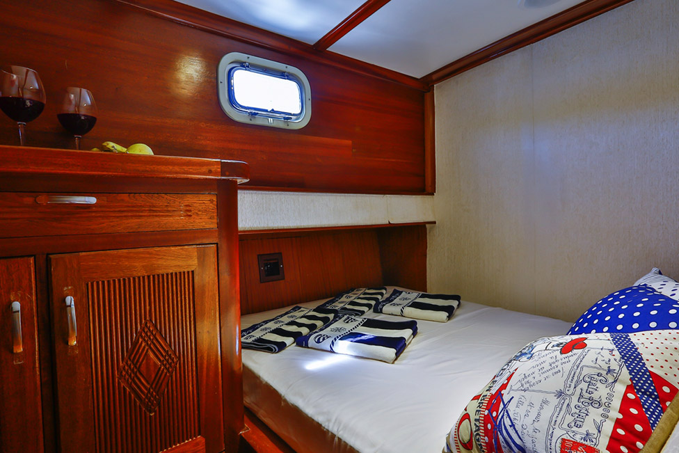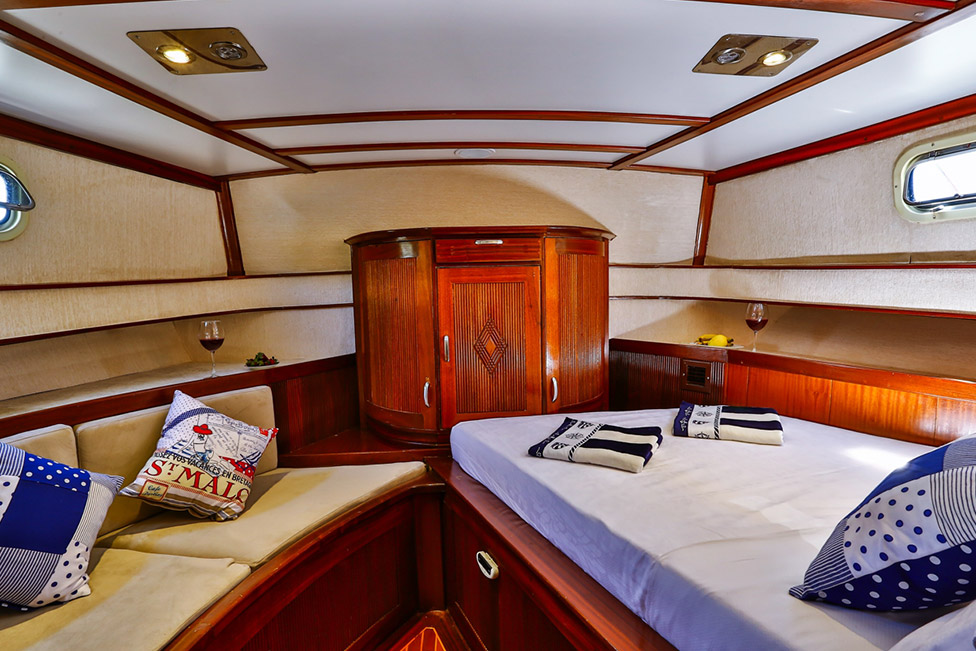 Гулет Evita предлагает размещение в общей сложности для 6 гостей в 3 двухместных каютах. Каюты нашего гулета с кондиционером оснащены удобным душем и туалетом. Внутренние и внешние помещения, гостиная, палуба и кухня нашего гулета были со вкусом оформлены с использованием высококачественных материалов.