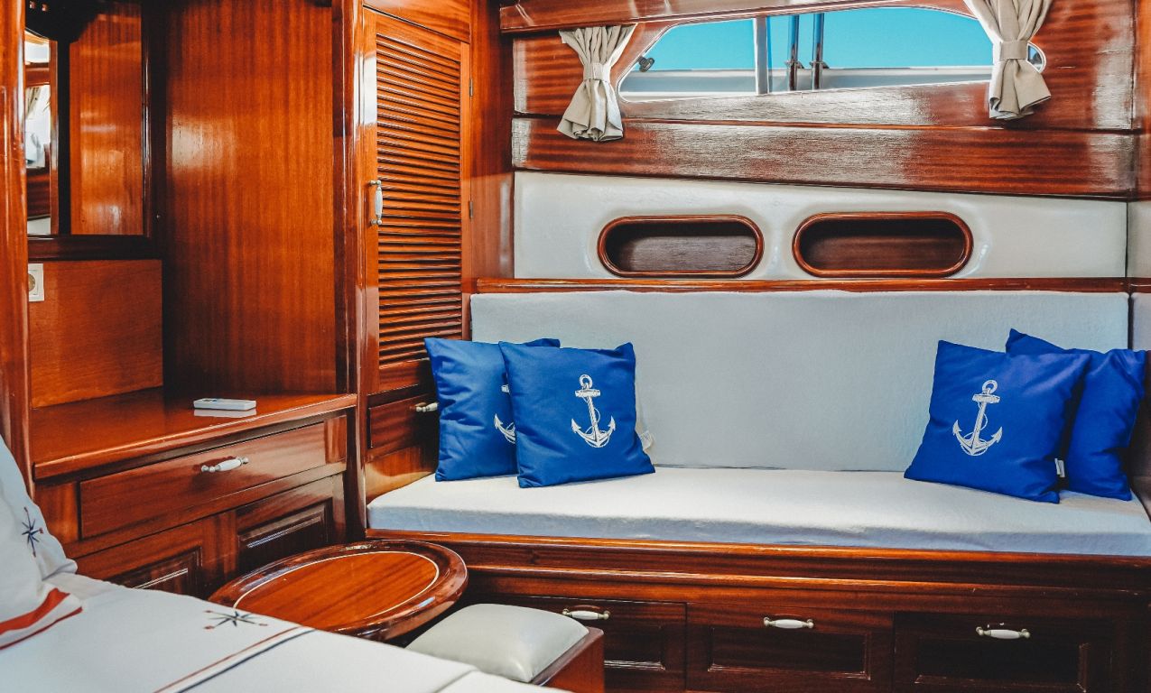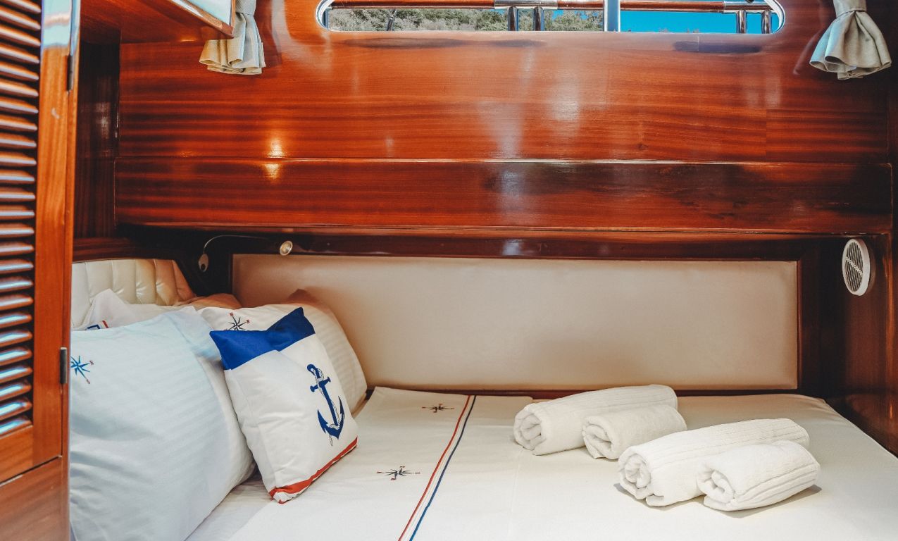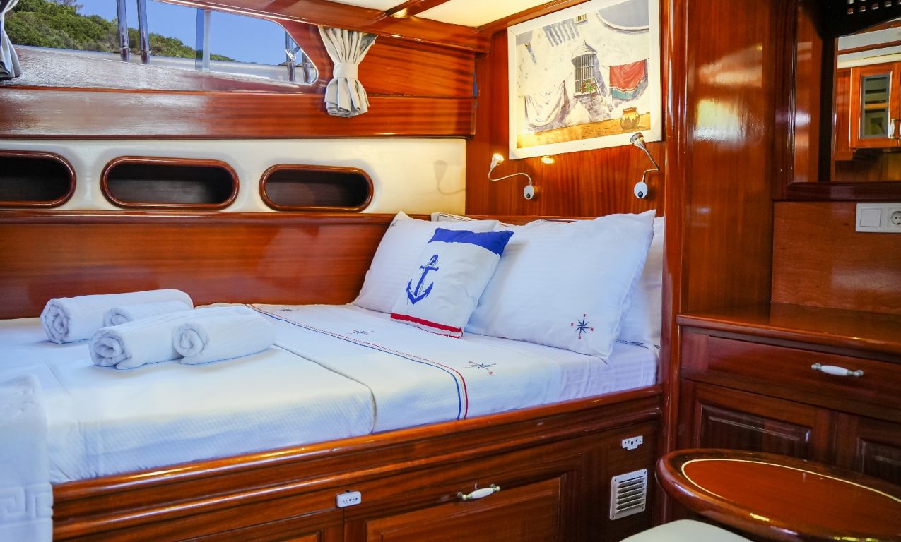 | Вместимость до 8 гостей; 1 главная каюта, 2 двухместные каюты, душевая кабина и туалеты во всех каютах, отдельные каюты для экипажа. |