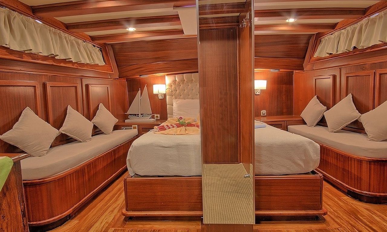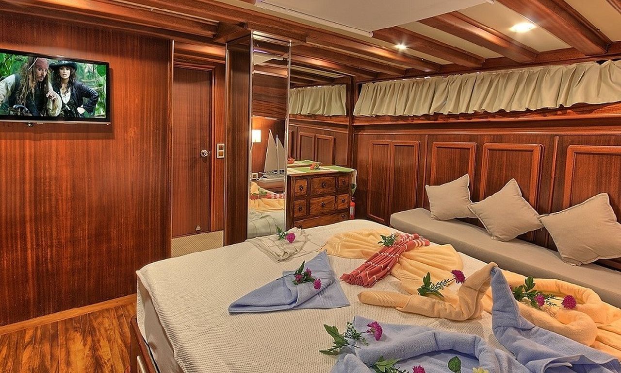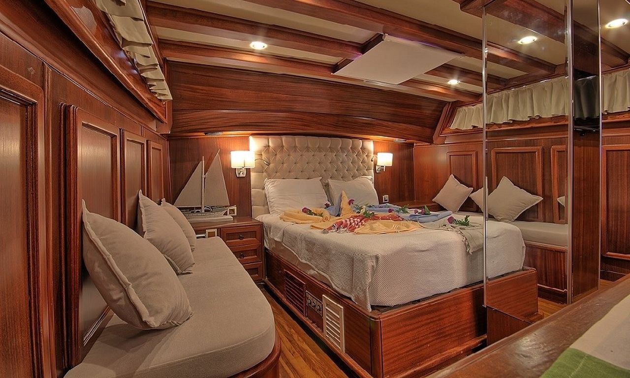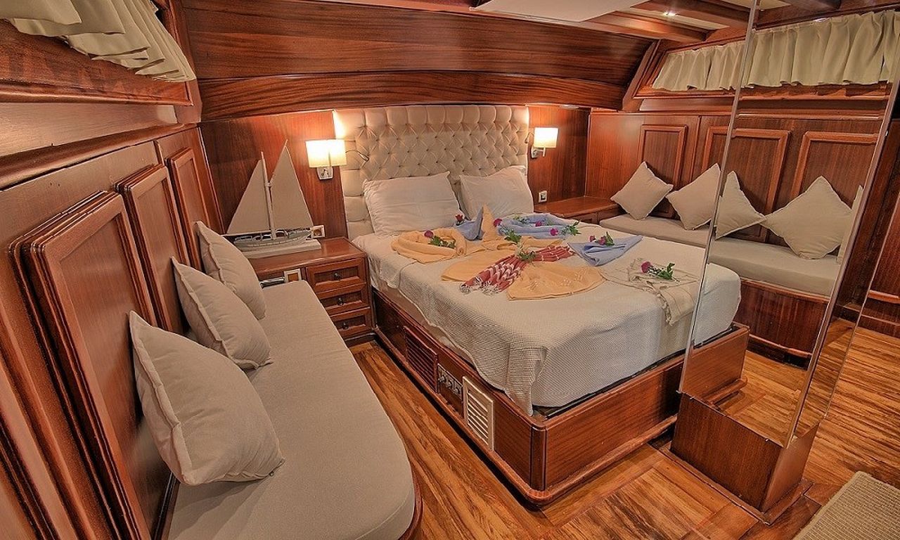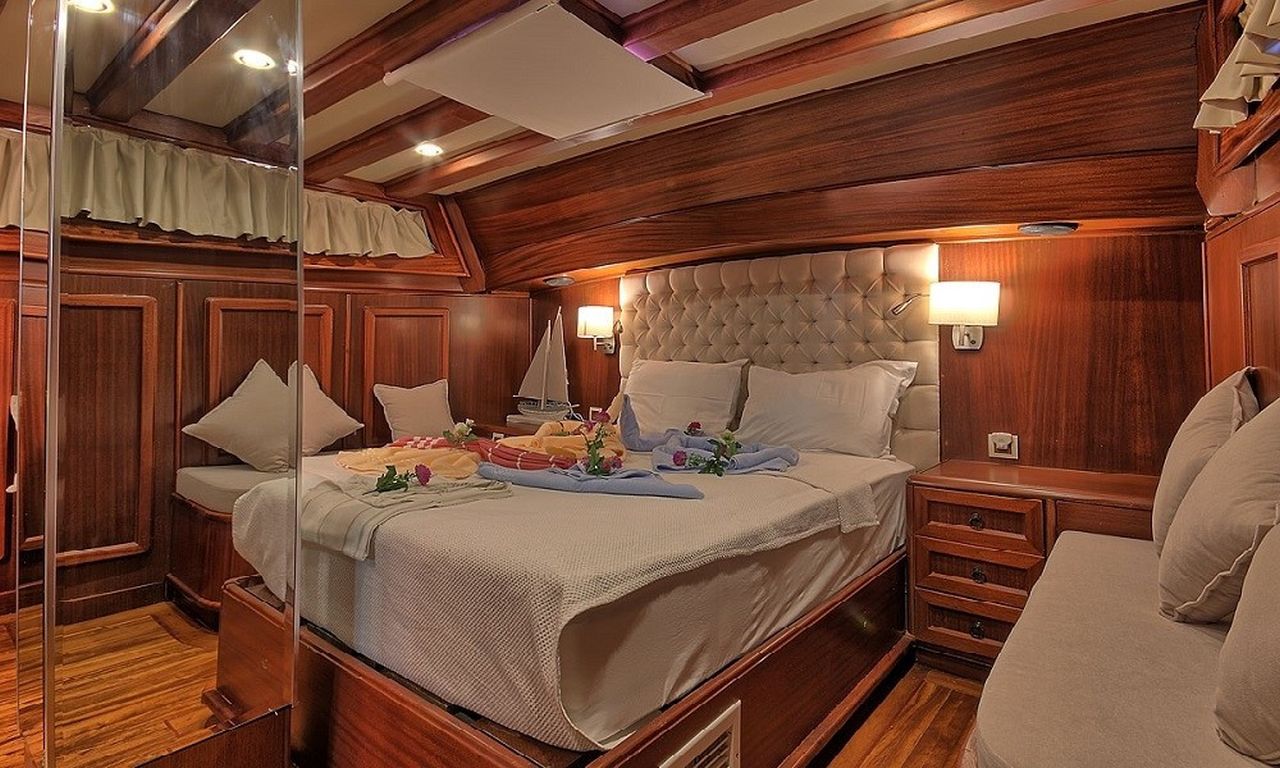 Гулет Romance предлагает размещение в общей сложности для 6 гостей в 3 двухместных каютах. Каюты нашего гулета с кондиционером оснащены удобным душем и туалетом. Внутренние и внешние помещения, гостиная, палуба и кухня нашего гулета Romance со вкусом оформлены с использованием высококачественных материалов.