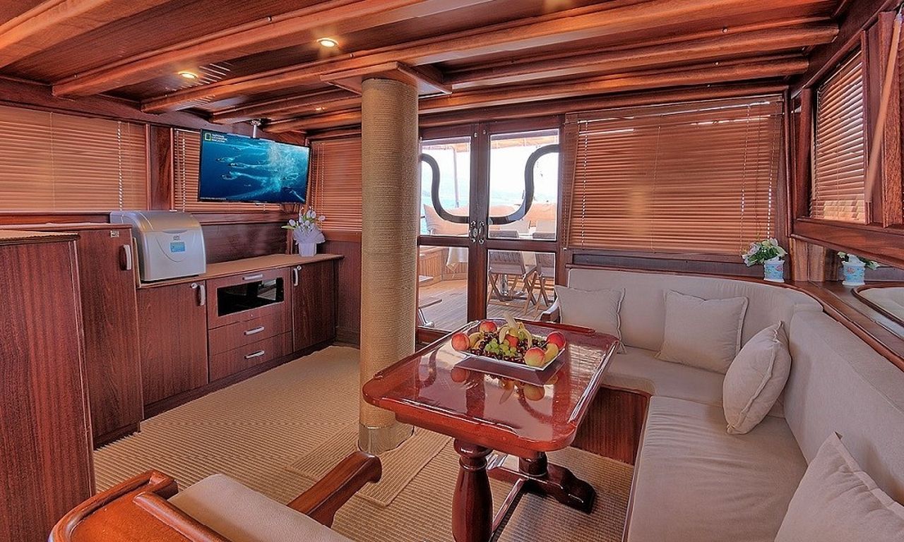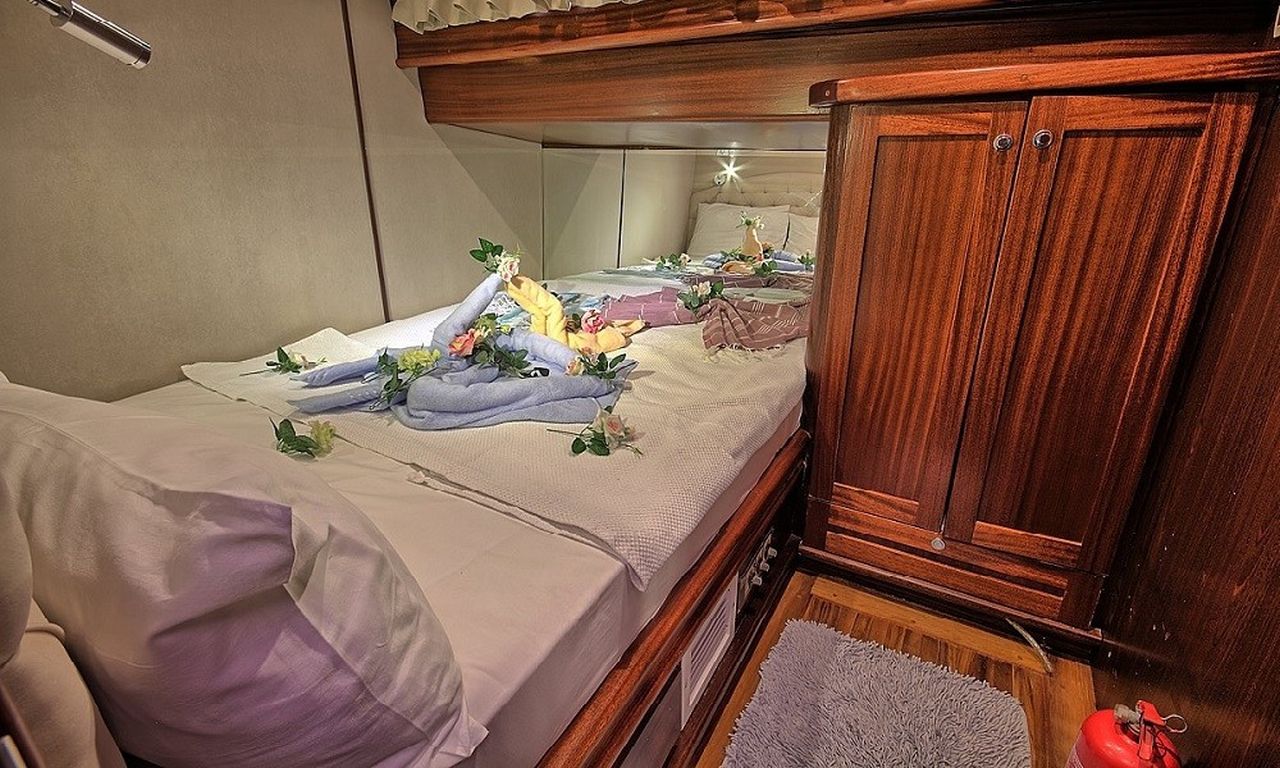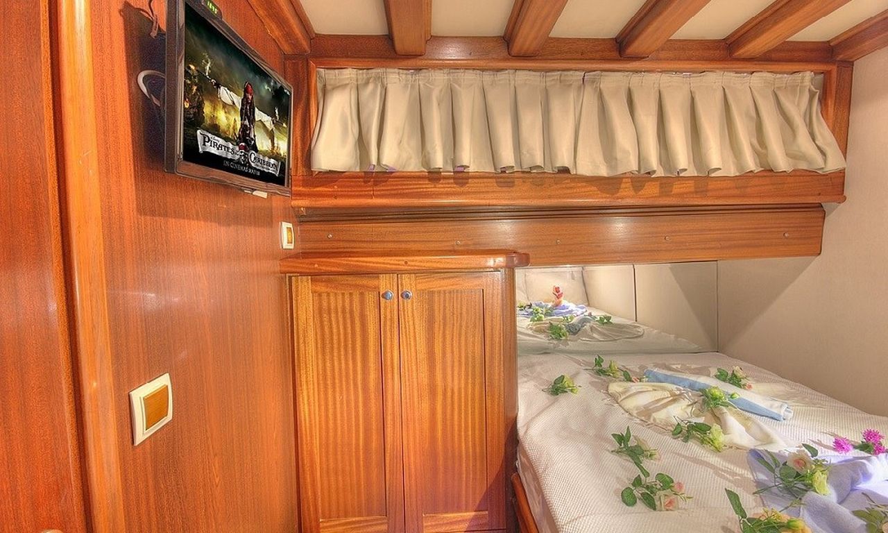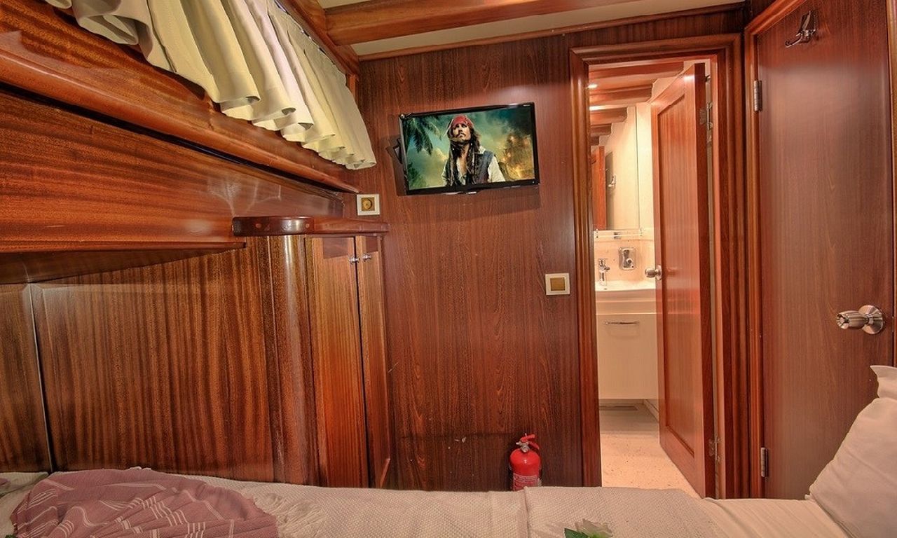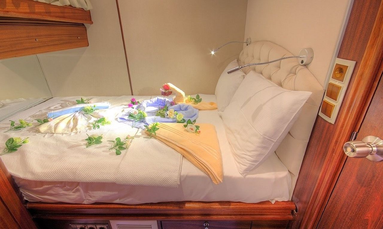 Гулет Romance предлагает размещение в общей сложности для 6 гостей в 3 двухместных каютах. Каюты нашего гулета с кондиционером оснащены удобным душем и туалетом. Внутренние и внешние помещения, гостиная, палуба и кухня нашего гулета Romance со вкусом оформлены с использованием высококачественных материалов.