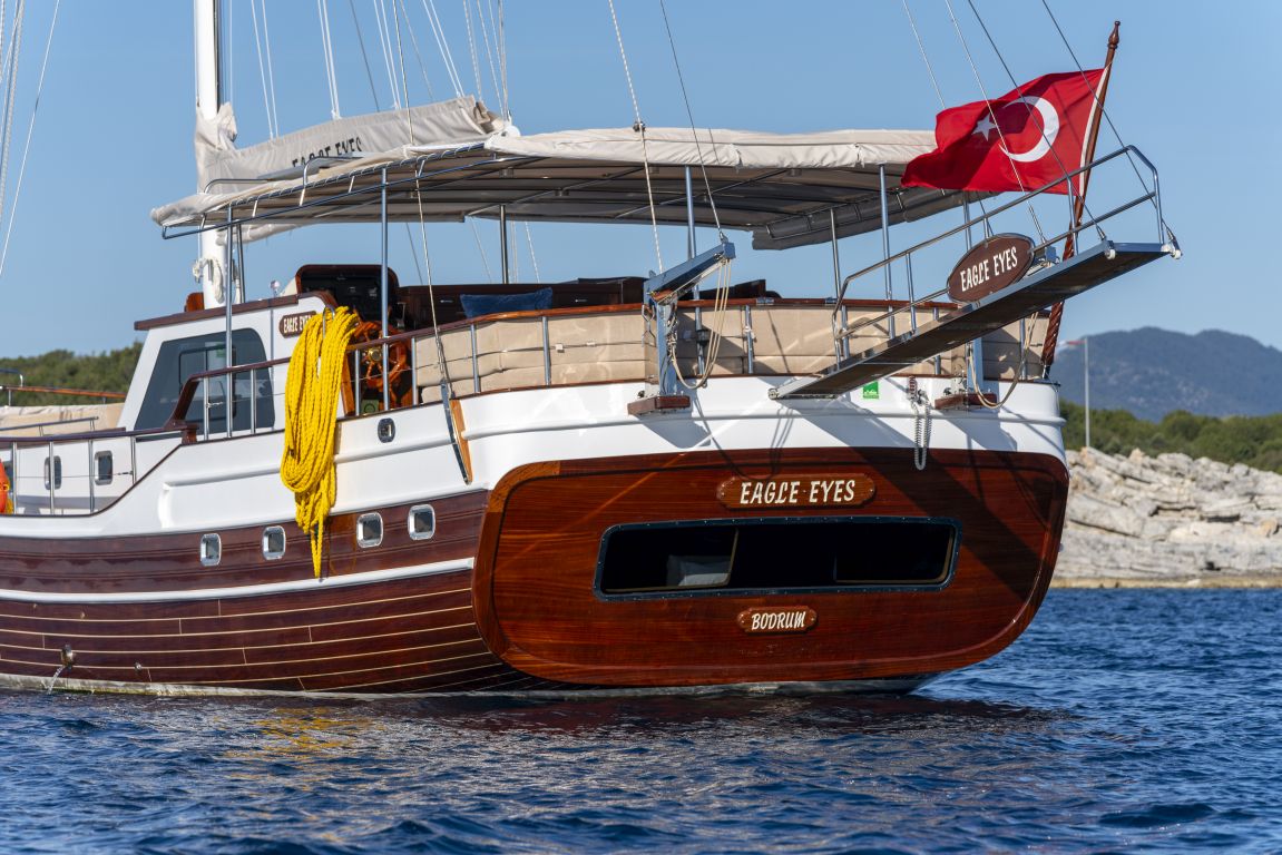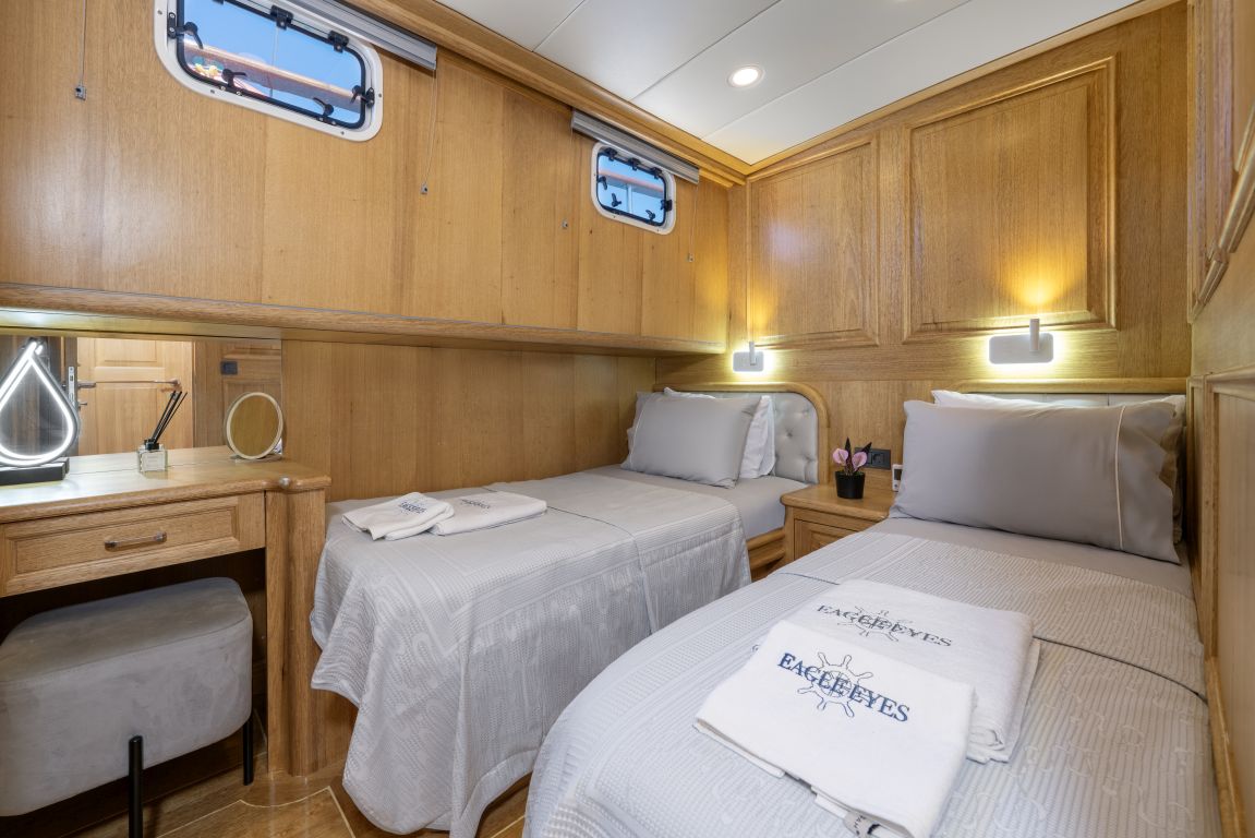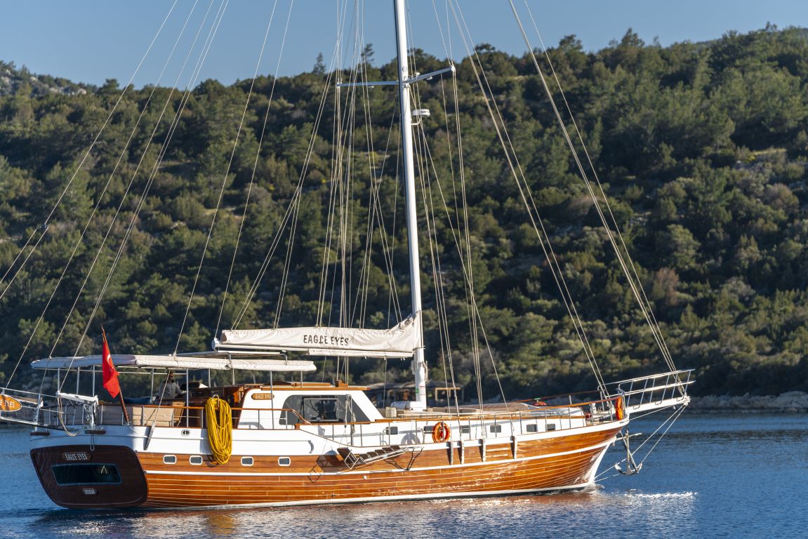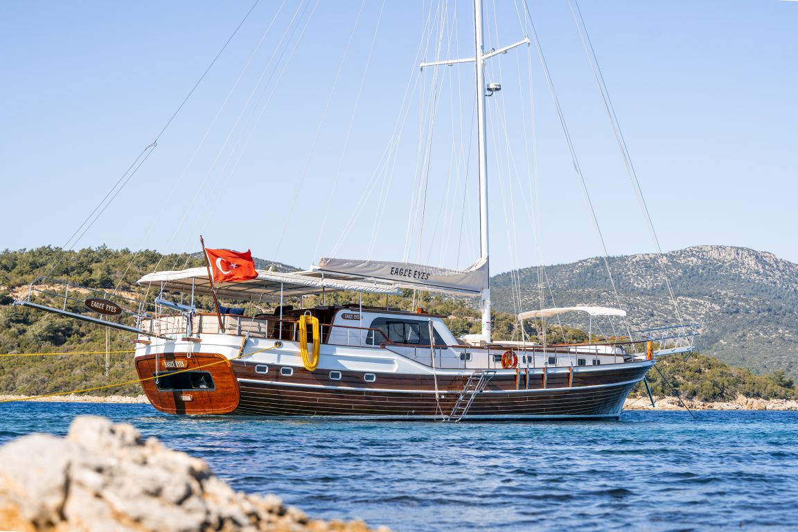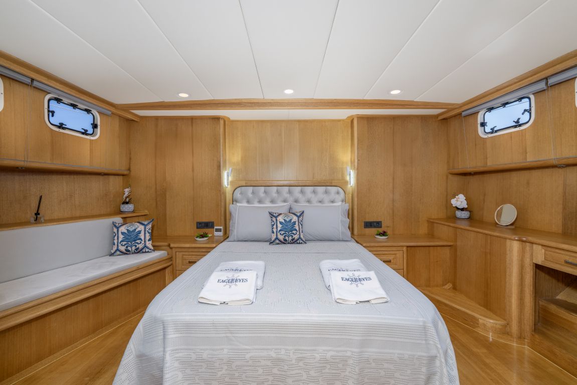 | Гулет Eagle Eyes — выразительный традиционный деревянный гулет длиной 20 м, новострой 2024 года; свежая работа мастеров и современная роскошь. Четыре каюты: две мастер, одна дабл и одна твин — все с отдельными санузлами; до восьми гостей. Ширина 5,80 м повышает комфорт и пространственность на борту. Палуба — для отдыха и общения: зоны сидений, тенистые места для обедов, солярии. Внутри — стильный салон и полностью оборудованная кухня. Для активных гостей — тузик с мотором 40 л.с., SUP-доски, каноэ, маски/трубки и рыбалка. Техника: двигатель Baudouin 360 л.с., два генератора по 19 кВА; крейсерская ~8 узлов. Сети 12/24/220 В; кондиционирование 12 часов в сутки. Маршруты — вдоль юго-западного побережья Турции: бирюзовые бухты, спокойные лагуны и живописные острова — запоминающийся «голубой круиз» с комфортом, приключениями и приватностью. |