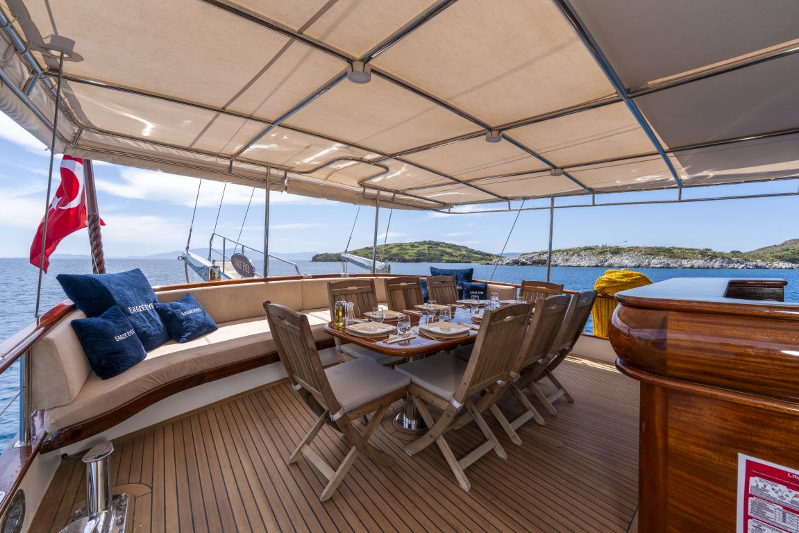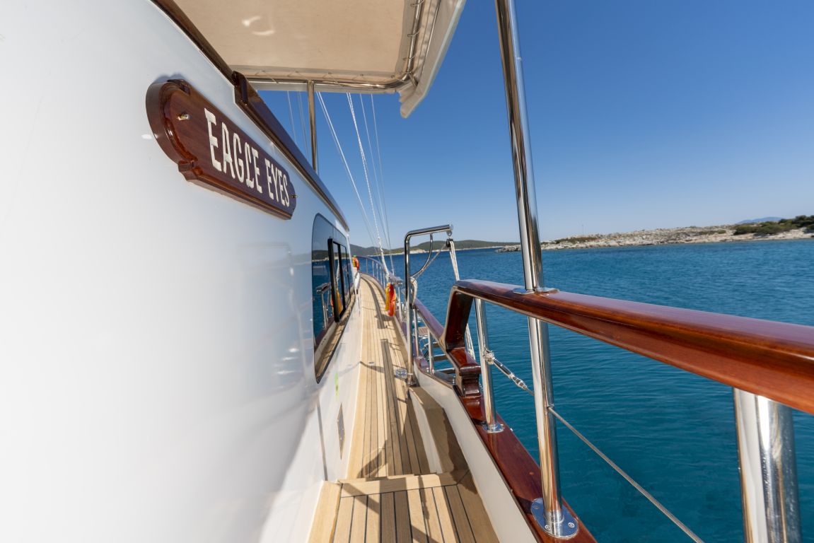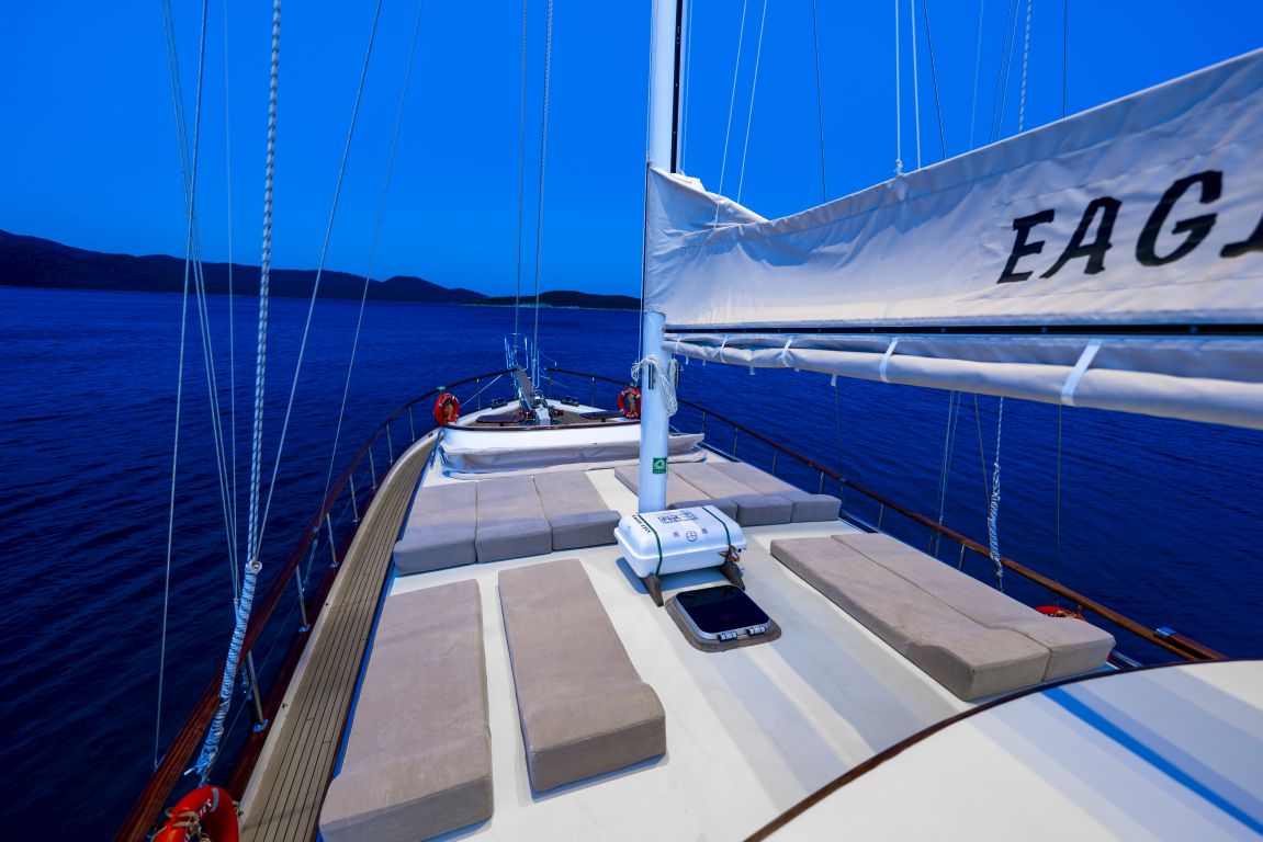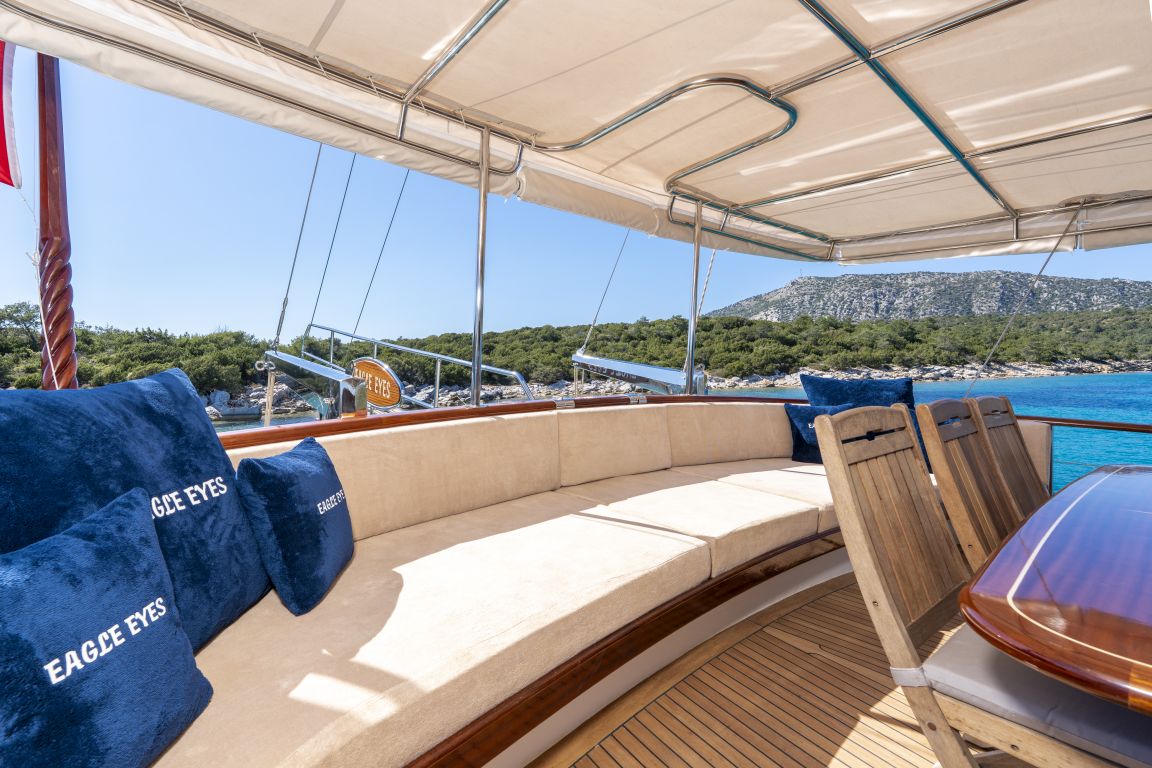 | Гулет Eagle Eyes — выразительный традиционный деревянный гулет длиной 20 м, новострой 2024 года; свежая работа мастеров и современная роскошь. Четыре каюты: две мастер, одна дабл и одна твин — все с отдельными санузлами; до восьми гостей. Ширина 5,80 м повышает комфорт и пространственность на борту. Палуба — для отдыха и общения: зоны сидений, тенистые места для обедов, солярии. Внутри — стильный салон и полностью оборудованная кухня. Для активных гостей — тузик с мотором 40 л.с., SUP-доски, каноэ, маски/трубки и рыбалка. Техника: двигатель Baudouin 360 л.с., два генератора по 19 кВА; крейсерская ~8 узлов. Сети 12/24/220 В; кондиционирование 12 часов в сутки. Маршруты — вдоль юго-западного побережья Турции: бирюзовые бухты, спокойные лагуны и живописные острова — запоминающийся «голубой круиз» с комфортом, приключениями и приватностью. |