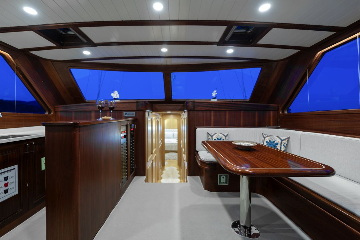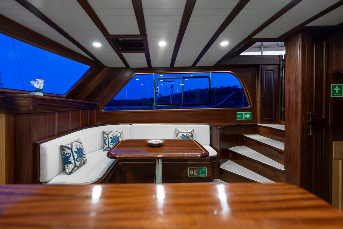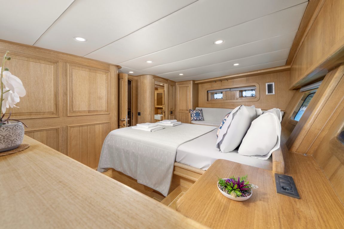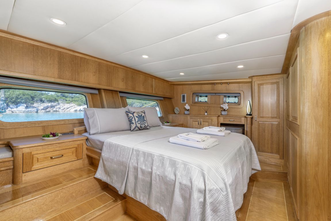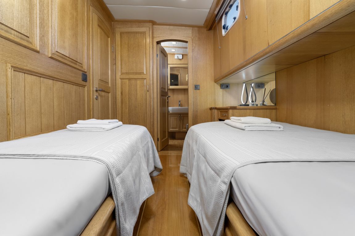 | Вместимость до 8 гостей: 2 главные каюты, 1 двухместная каюта с двуспальной кроватью, 1 каюта с двумя односпальными кроватями, душевая кабина и туалеты во всех каютах, отдельные каюты для экипажа. |