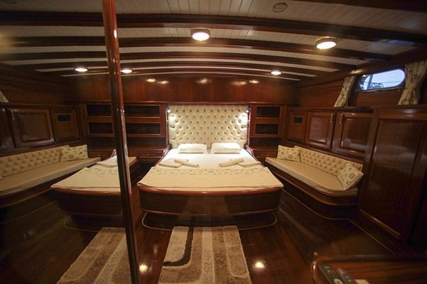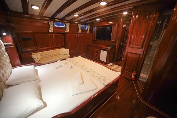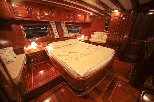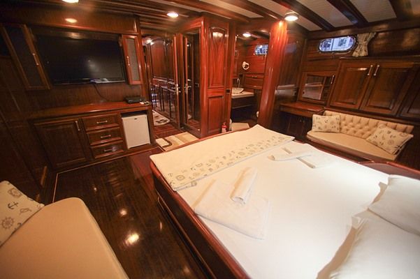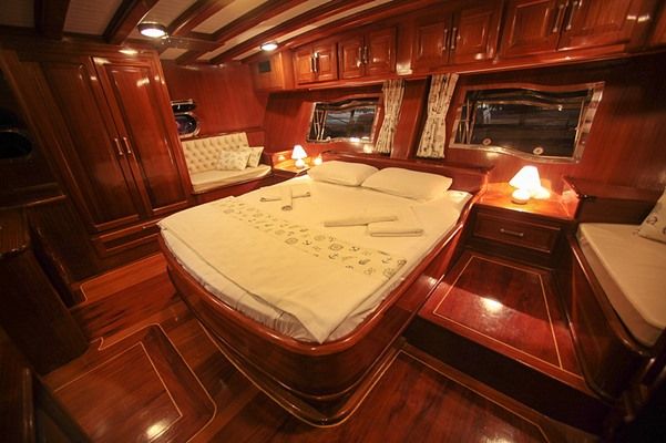 Наш 24-метровый гулет Furkan был построен в 2010. На нашей лодке 4 каюты: 2 Master, 1 Double и 1 Twin, каждая более стильная и удобная, с собственным душем, туалетом и кондиционером. 3 отдельные жилые зоны, полностью оборудованная кухня, обеденные зоны внутри и снаружи и зоны отдыха для экипажа.
