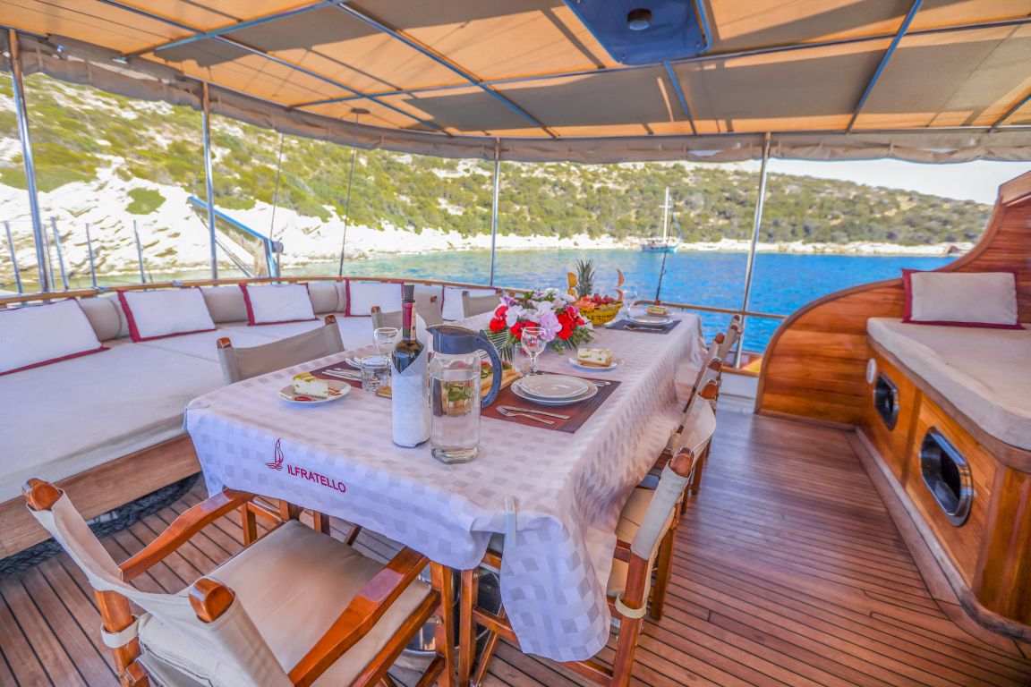 Имеются подушки для загара, стулья и сервировочные наборы, достаточные для всех гостей. Гулет и яхта Il Fratello, благодаря своему полноценному беспроводному, GSM телефонному навигационному оборудованию; Бодрум, Гёджек, Мармарис, Фетхие и т. д., вы можете безопасно плавать в наших синих круизных направлениях.
