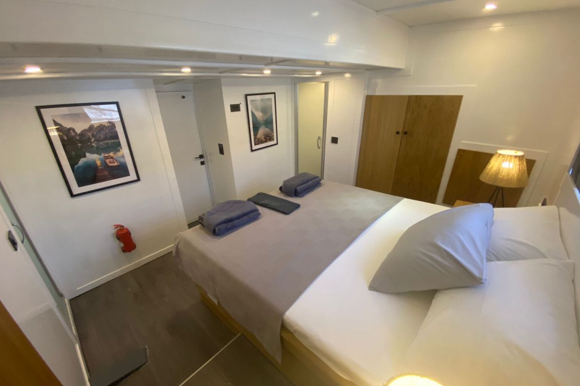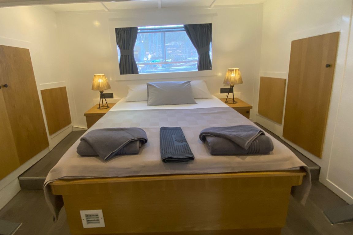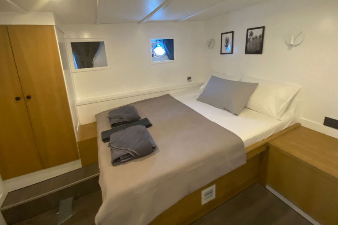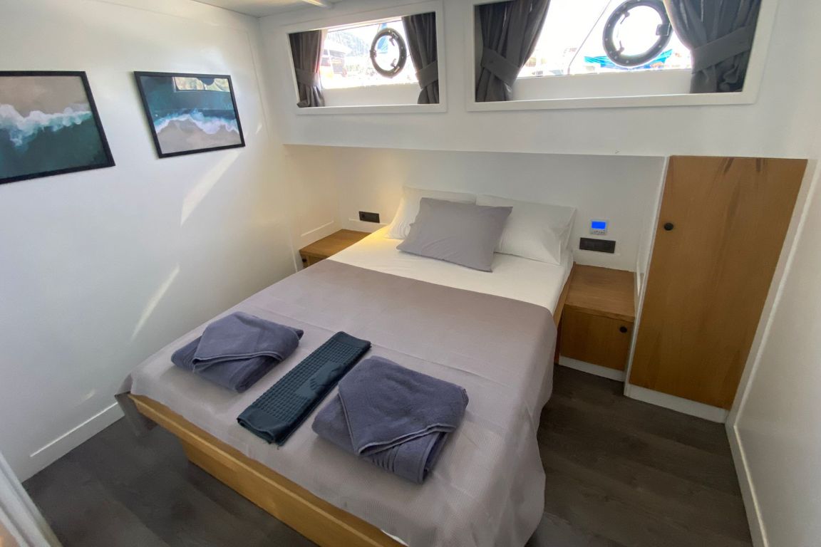 Вместимость до 10 гостей; 1 мастер-каюта, 4 двухместные каюты, кондиционер, шкаф для одежды, душевая кабина и туалеты домашнего типа во всех каютах, отдельные каюты для экипажа. |