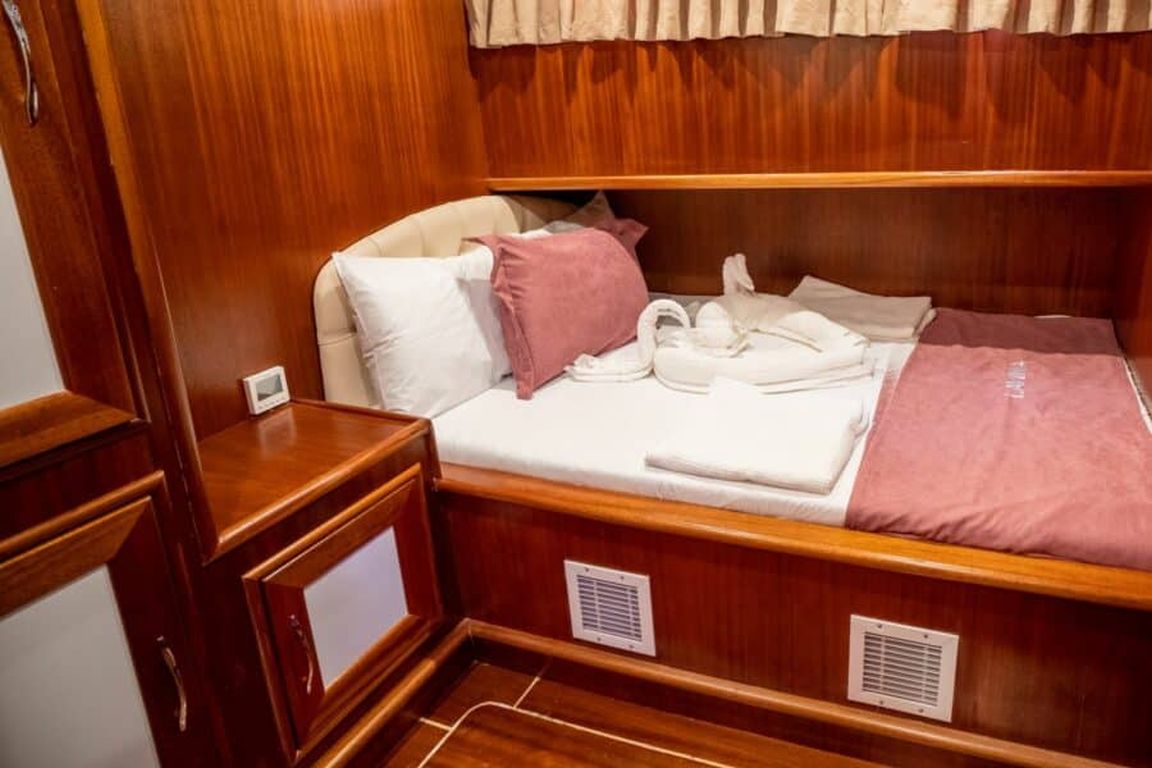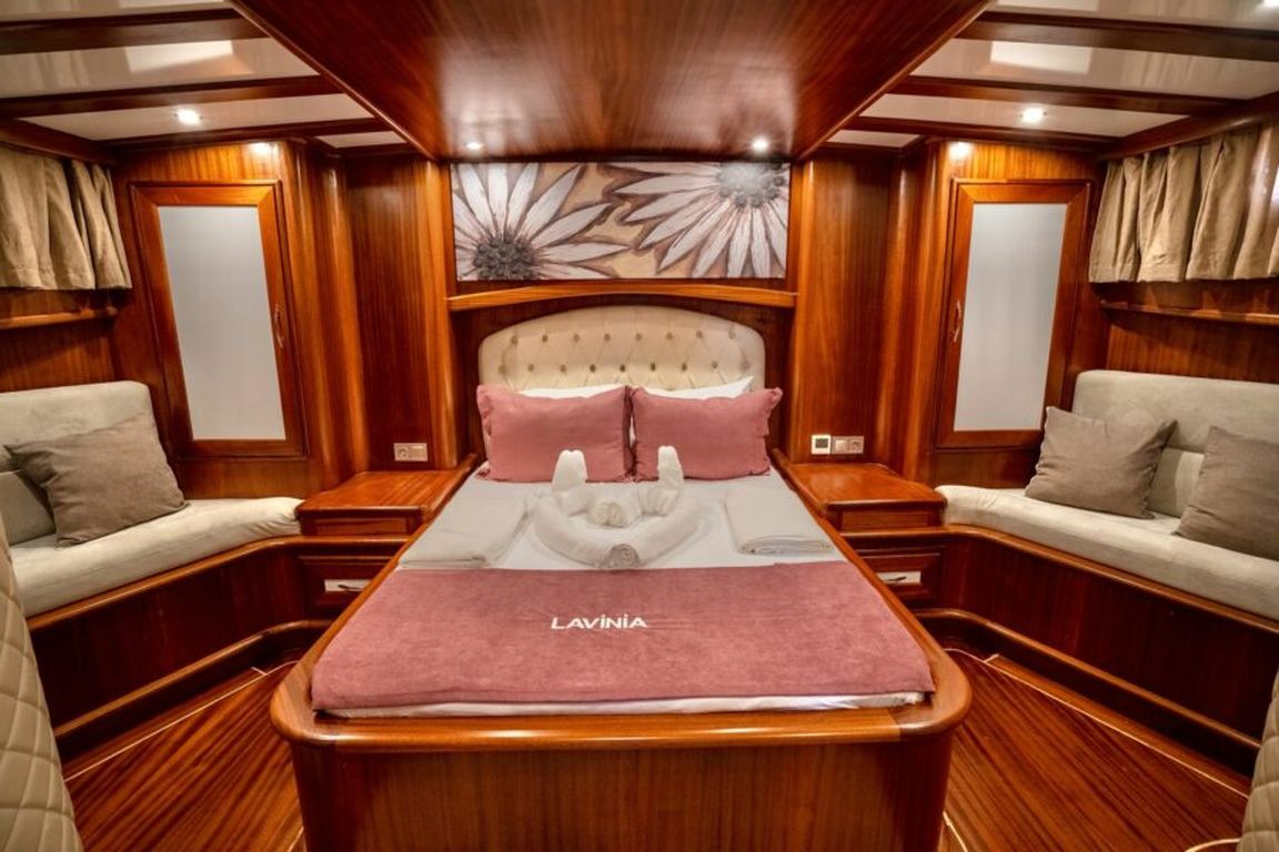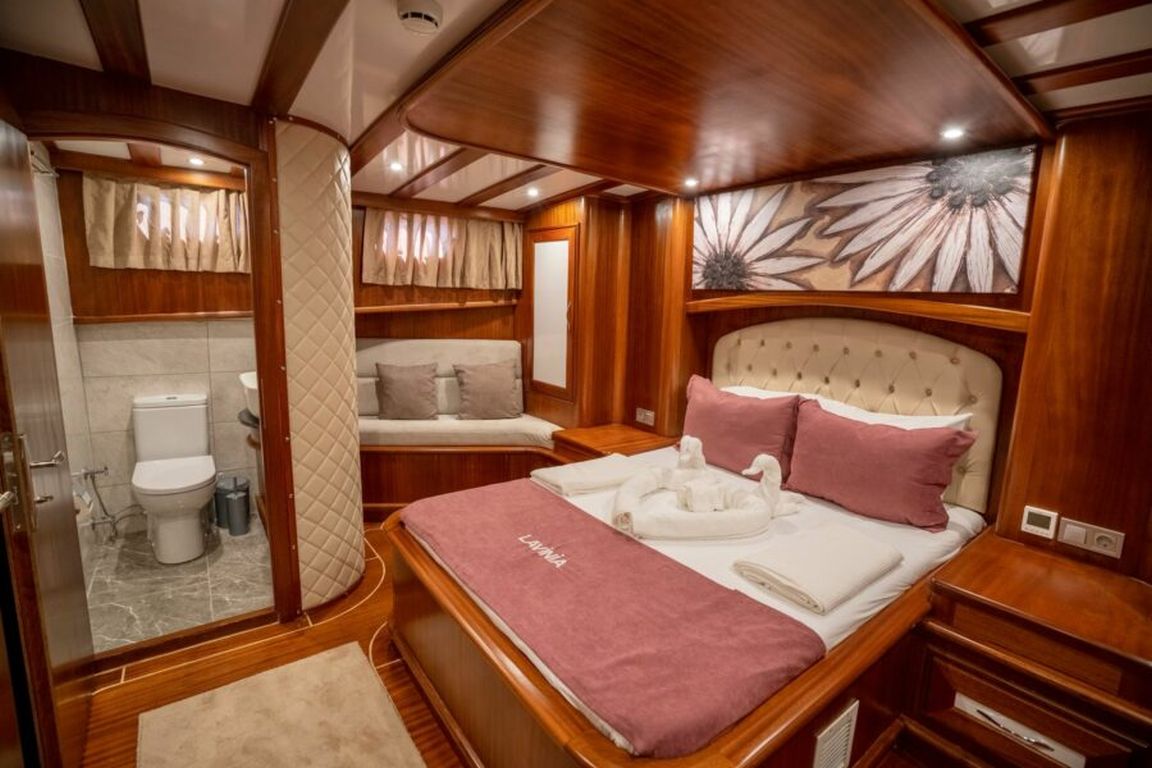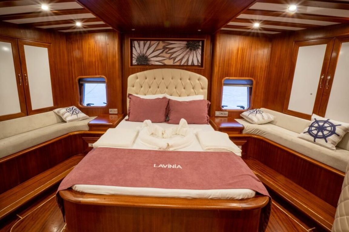 | Гулет Lavinia — современный 21-метровый гулет 2022 года постройки, предлагающий комфортную роскошь для частного «голубого круиза». Пять кают — две мастер и три дабл — на 10 гостей. Ширина 6,50 м даёт много места для удобных жилых зон и хорошо спроектированных кают. На палубе — теневые столовые зоны, лаунж-сиденья и мягкие солярии; в салоне — современный дизайн, обеденный стол, сидячая группа и полностью оснащённый камбуз. Для водного досуга: тузик 20 л.с., SUP-доски, каноэ, маски/трубки и рыболовное снаряжение — разнообразные активности для всех возрастов. Силовая установка: двигатель Baudouin 450 л.с. и два генератора по 18 кВА; крейсерская скорость 10 узлов. Кондиционер работает 4 часа в день; электросети 12V/24V/220V. Lavinia идеально подойдёт семьям и группам, ищущим современный гулет с комфортом, водными активностями и очарованием бирюзового турецкого побережья. |