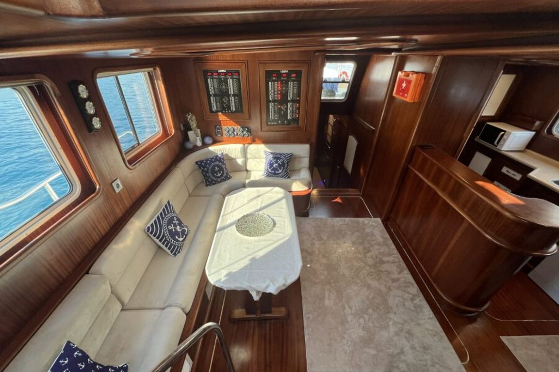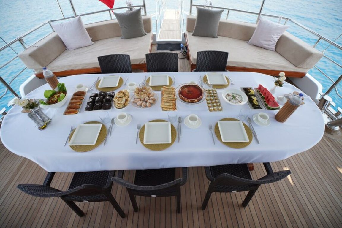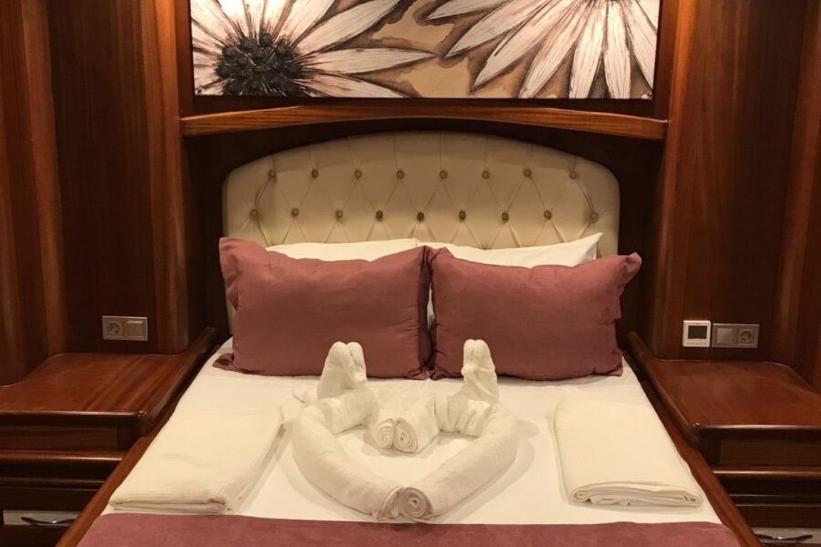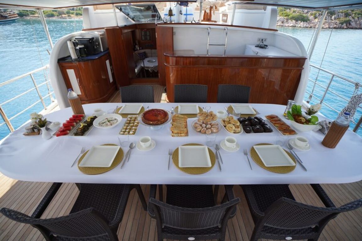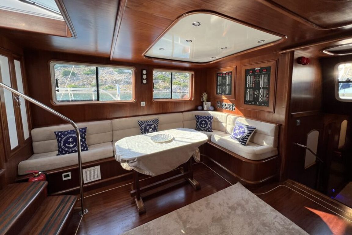 | Гулет Lavinia — современный 21-метровый гулет 2022 года постройки, предлагающий комфортную роскошь для частного «голубого круиза». Пять кают — две мастер и три дабл — на 10 гостей. Ширина 6,50 м даёт много места для удобных жилых зон и хорошо спроектированных кают. На палубе — теневые столовые зоны, лаунж-сиденья и мягкие солярии; в салоне — современный дизайн, обеденный стол, сидячая группа и полностью оснащённый камбуз. Для водного досуга: тузик 20 л.с., SUP-доски, каноэ, маски/трубки и рыболовное снаряжение — разнообразные активности для всех возрастов. Силовая установка: двигатель Baudouin 450 л.с. и два генератора по 18 кВА; крейсерская скорость 10 узлов. Кондиционер работает 4 часа в день; электросети 12V/24V/220V. Lavinia идеально подойдёт семьям и группам, ищущим современный гулет с комфортом, водными активностями и очарованием бирюзового турецкого побережья. |