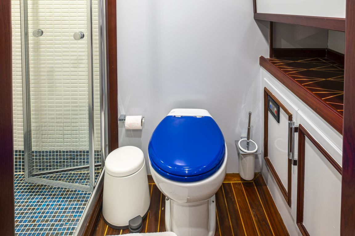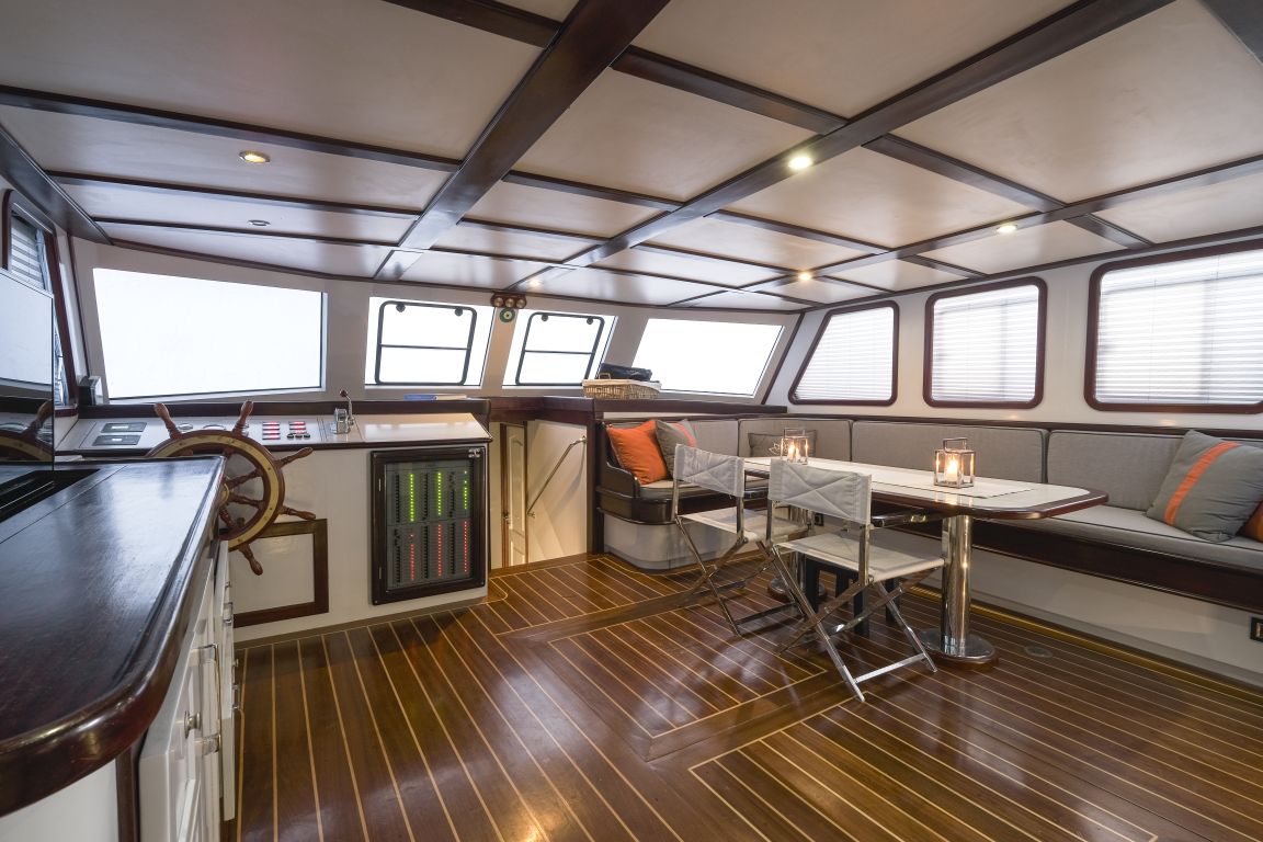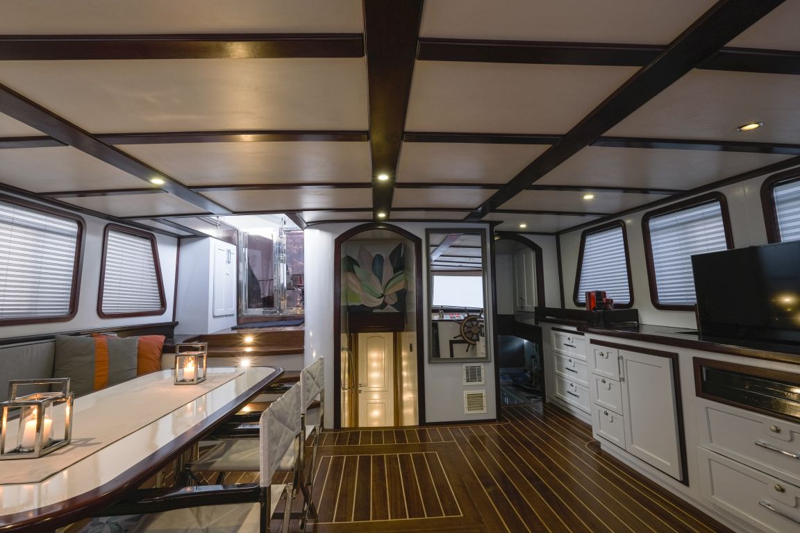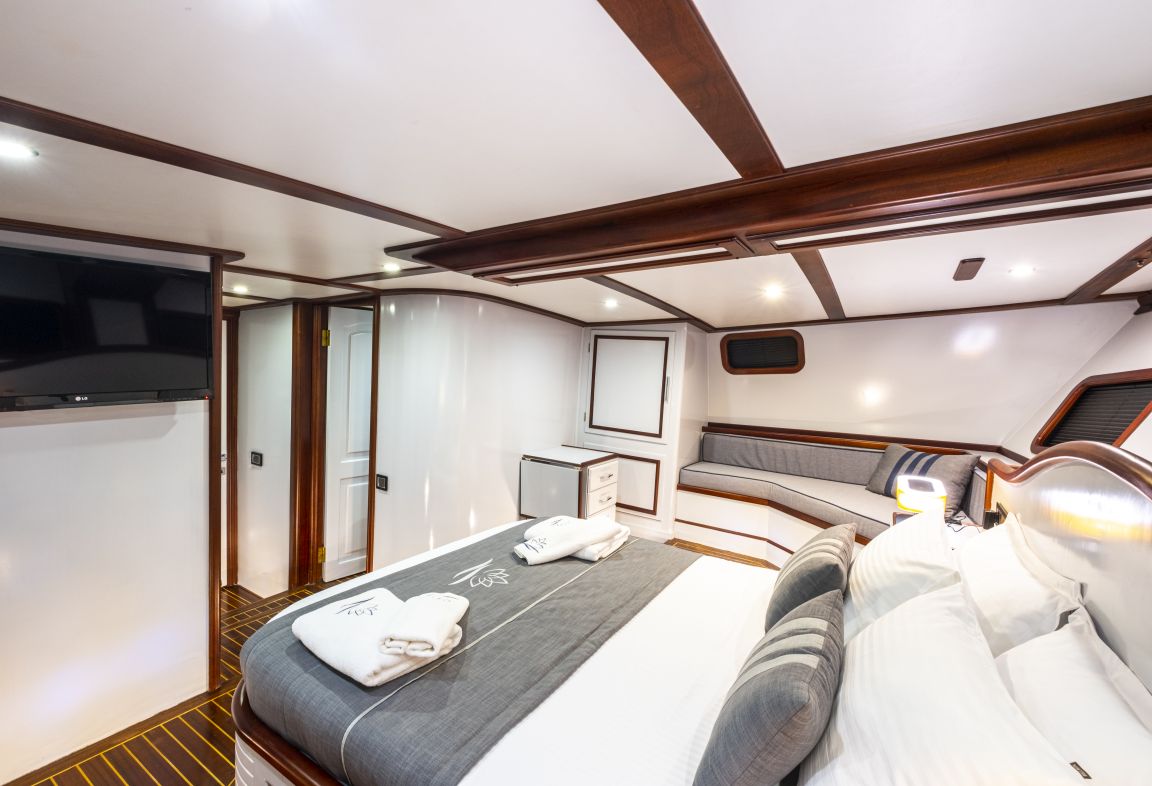 каждая с отдельной душевой, туалетом и кондиционером. Она оборудована двумя двигателями MAN мощностью 450 л.с. и двумя генераторами Kohler мощностью 24 кВт. К услугам гостей отдельные жилые зоны для экипажа, полностью оборудованная кухня, обеденные зоны внутри и снаружи, круглосуточное кондиционирование воздуха, зоны отдыха и американский бар. Для всех гостей предусмотрено достаточное количество подушек для загара, стульев,