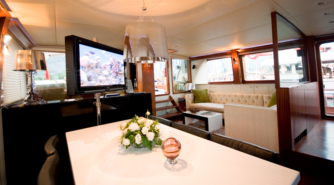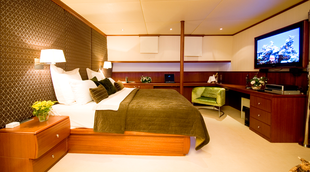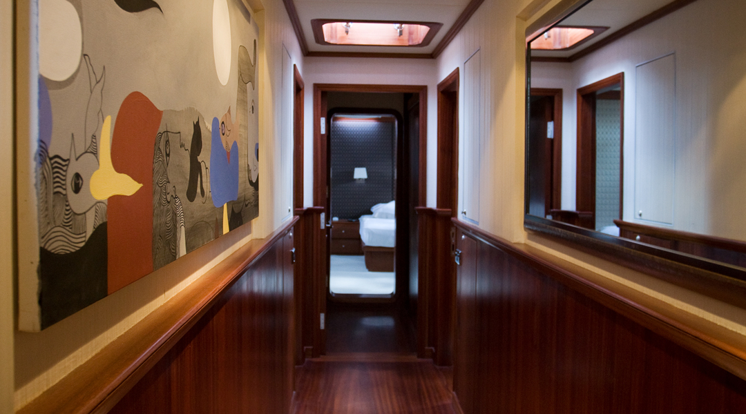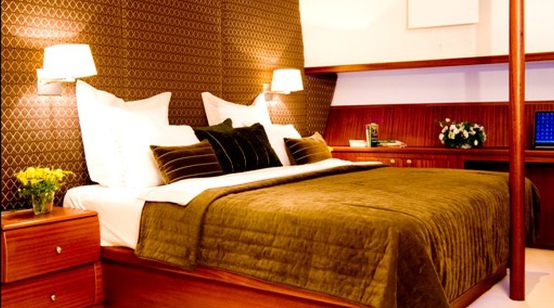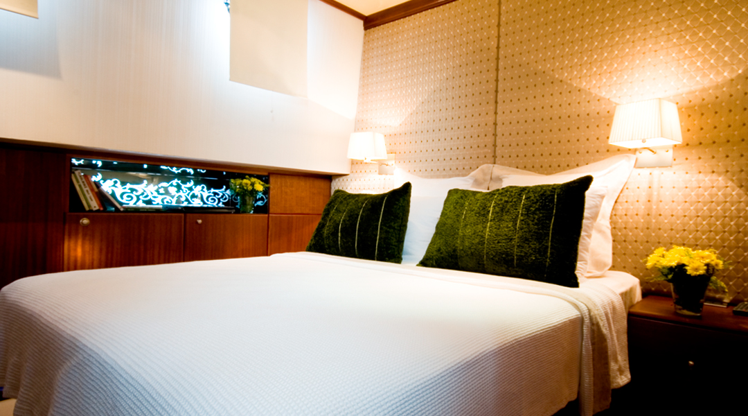 | Вместимость до 10 гостей; 5 кают, 1 главная каюта с кроватью размера «king-size», 4 гостевые каюты с кроватями размера «queen-size», все каюты оборудованы индивидуальными ванными комнатами, отдельные каюты для экипажа. |