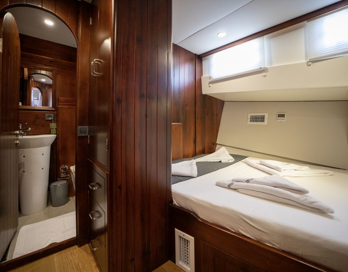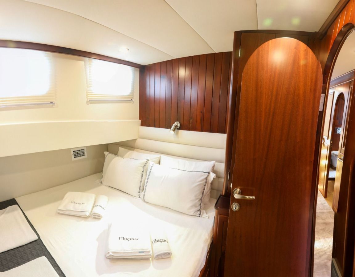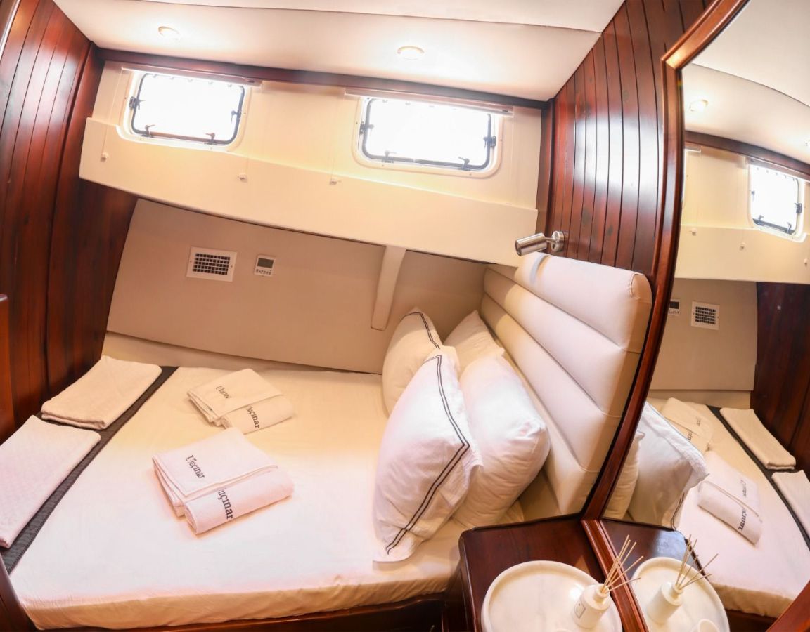 | Гулет Queen of Sea — делюкс-гулет длиной 26,1 м, построен в 2007 году, со вкусом обновлён в 2022-м. Пять кают — две мастер, две дабл и одна твин — на 10 гостей. Ширина 7,40 м обеспечивает щедрые пространства внутри и под открытым небом. Снаружи — теневые столовые зоны, удобные сиденья и солярии; в салоне — обеденный стол, лаунж и современный камбуз. Водные активности: тузик 50 л.с., SUP-доски, водные лыжи, вейкборд, каноэ, снасти для сноркелинга и рыбалки. Механика: два двигателя Daewoo по 360 л.с., два генератора по 27 кВА; крейсерская 9 узлов. Кондиционирование 24/7; сети 12V/24V/220V. Queen of Sea — идеальный выбор для семей и компаний друзей, ищущих современный люксовый гулет с полным набором удобств и водных активностей. |