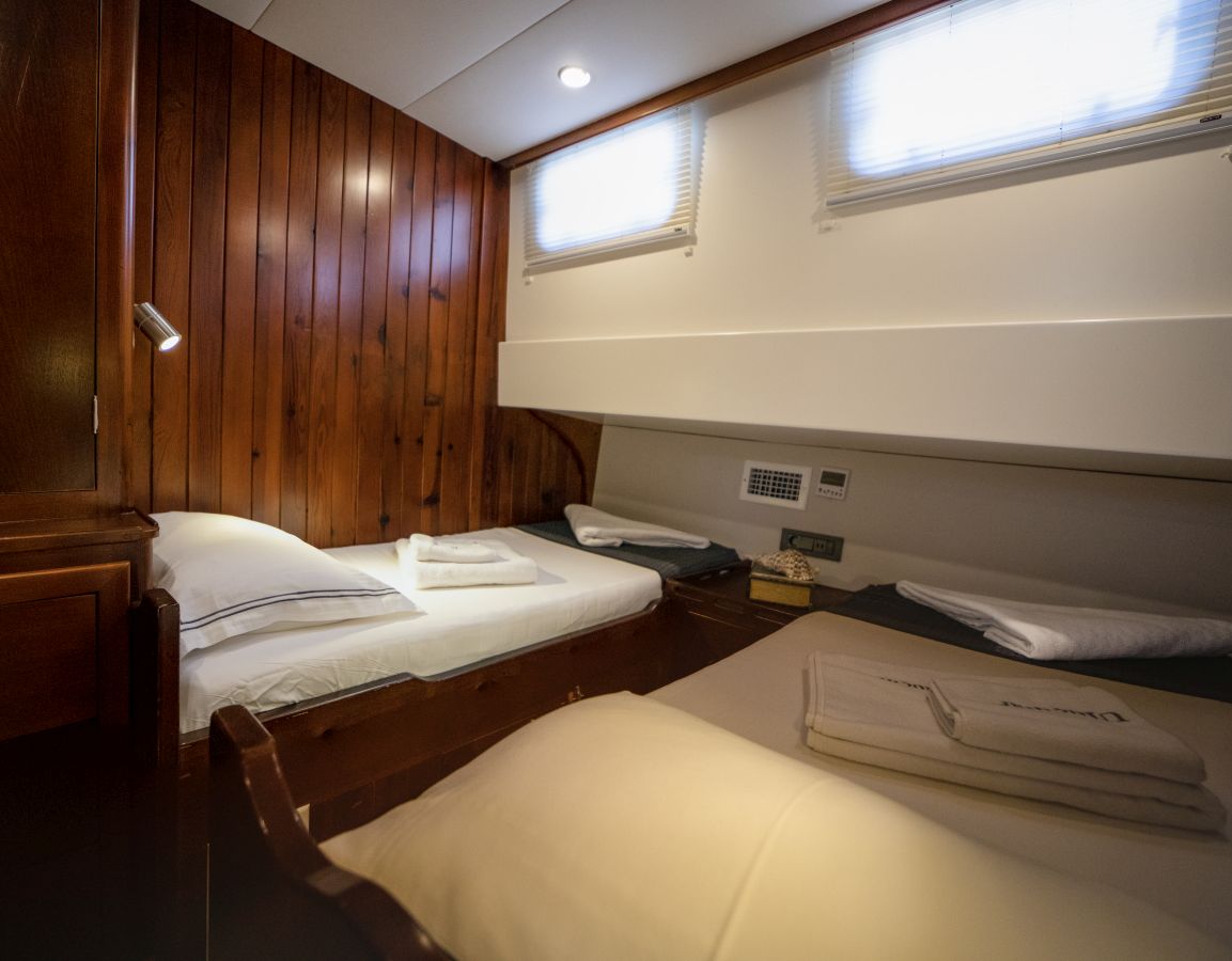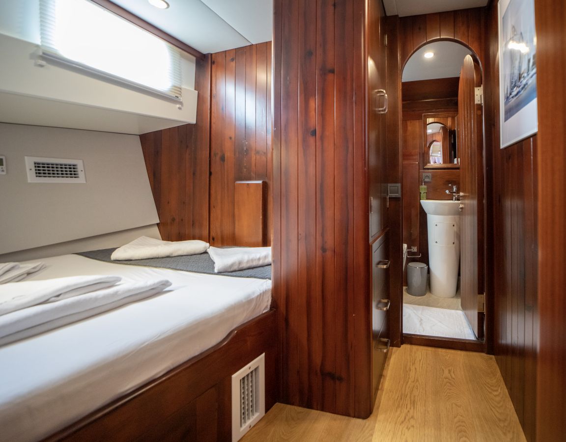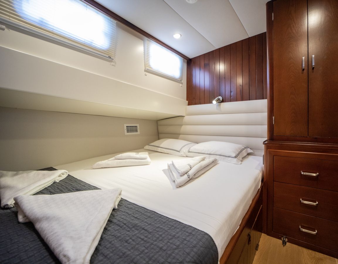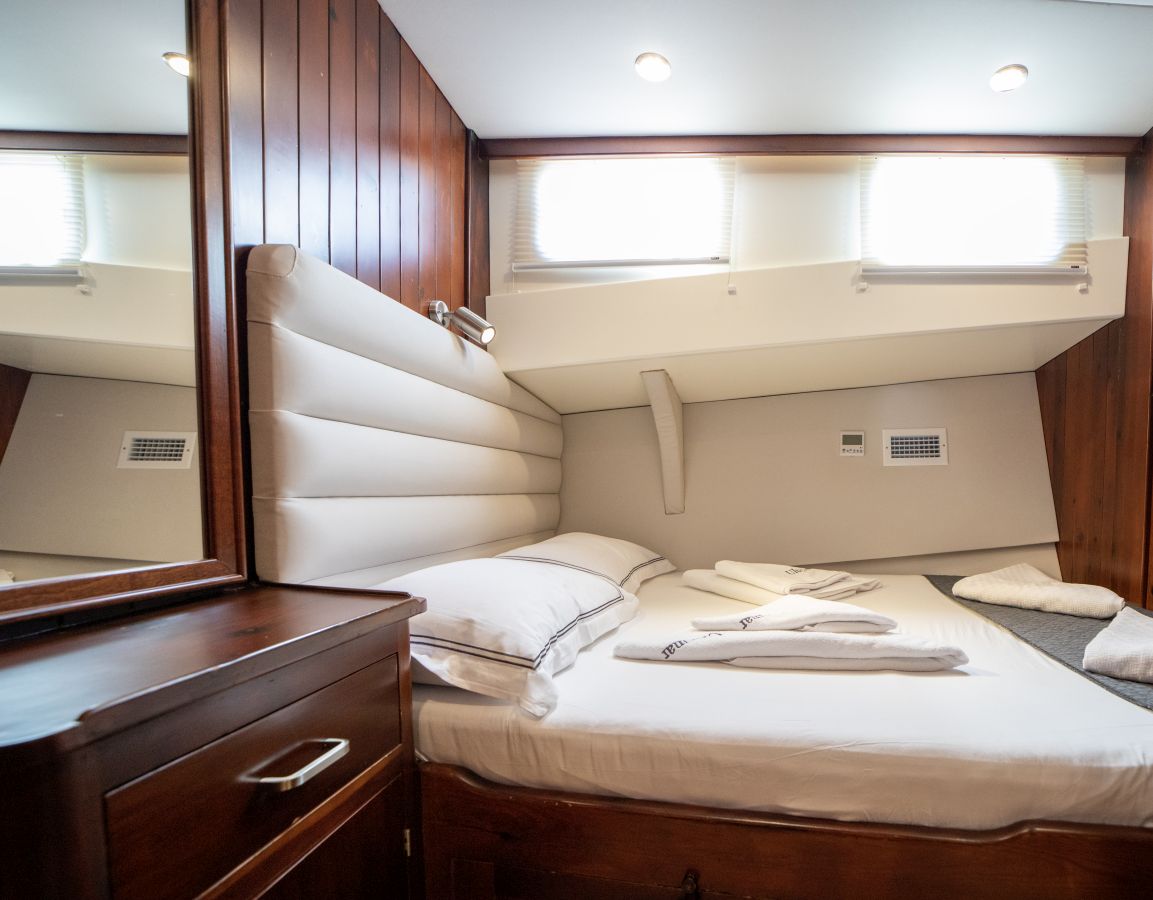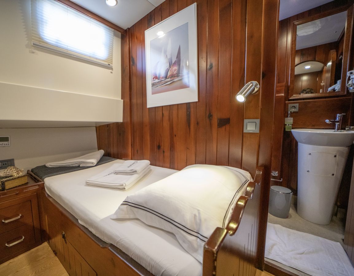 До 10 гостей; 2 главные, 2 двухместные, 1 двухместная каюта, кондиционер, душевая кабина и туалеты домашнего типа во всех каютах, отдельные каюты для экипажа. |