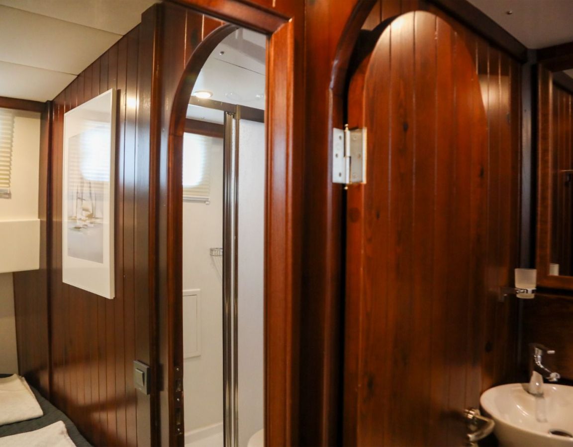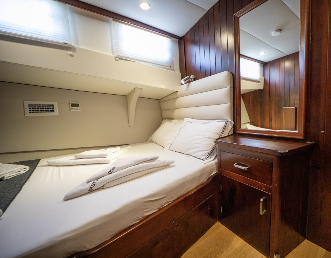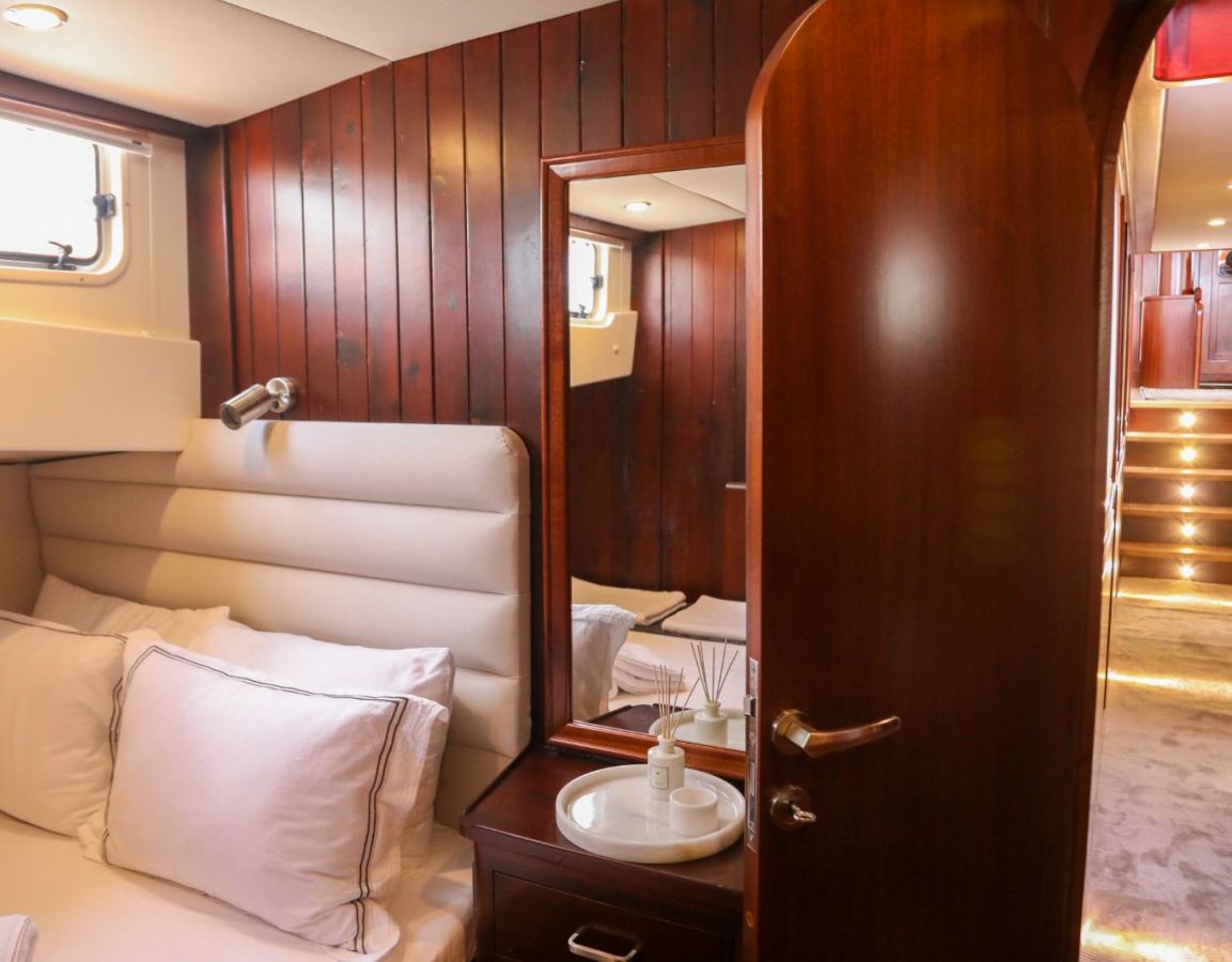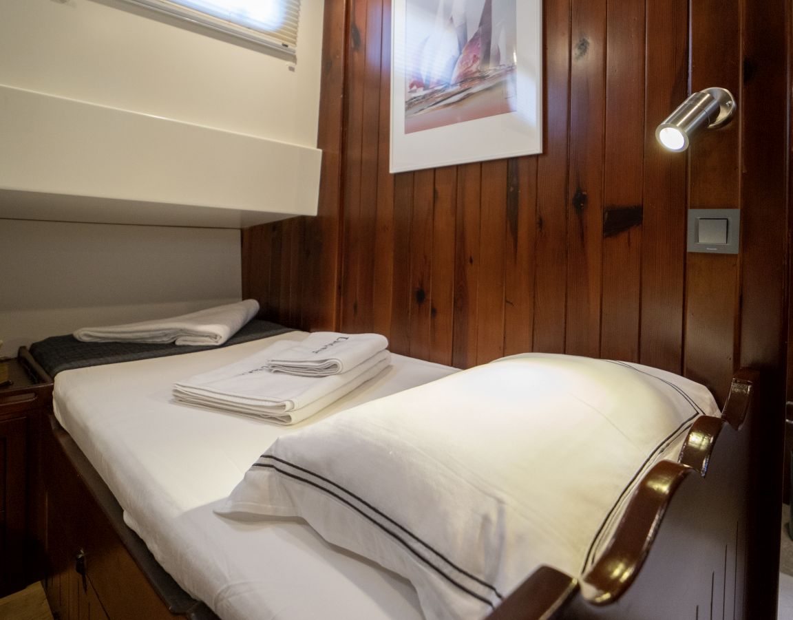 До 10 гостей; 2 главные, 2 двухместные, 1 двухместная каюта, кондиционер, душевая кабина и туалеты домашнего типа во всех каютах, отдельные каюты для экипажа. |