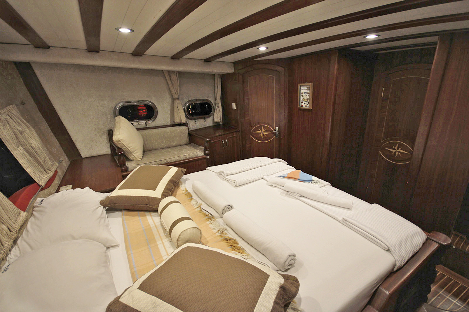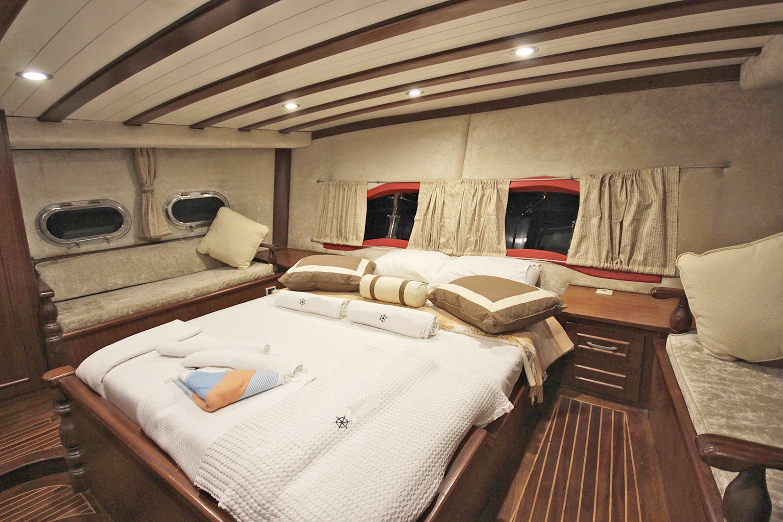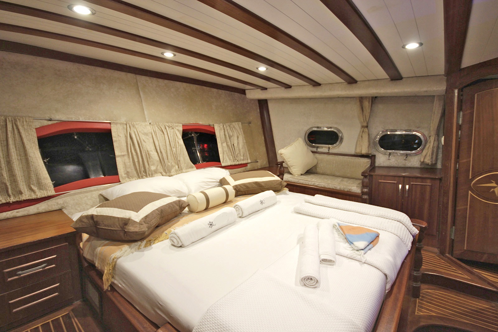 | Вместимость до 10 гостей; 2 главные каюты, 3 двухместные каюты, кондиционер, все с ванной комнатой, отдельные каюты для экипажа. |
