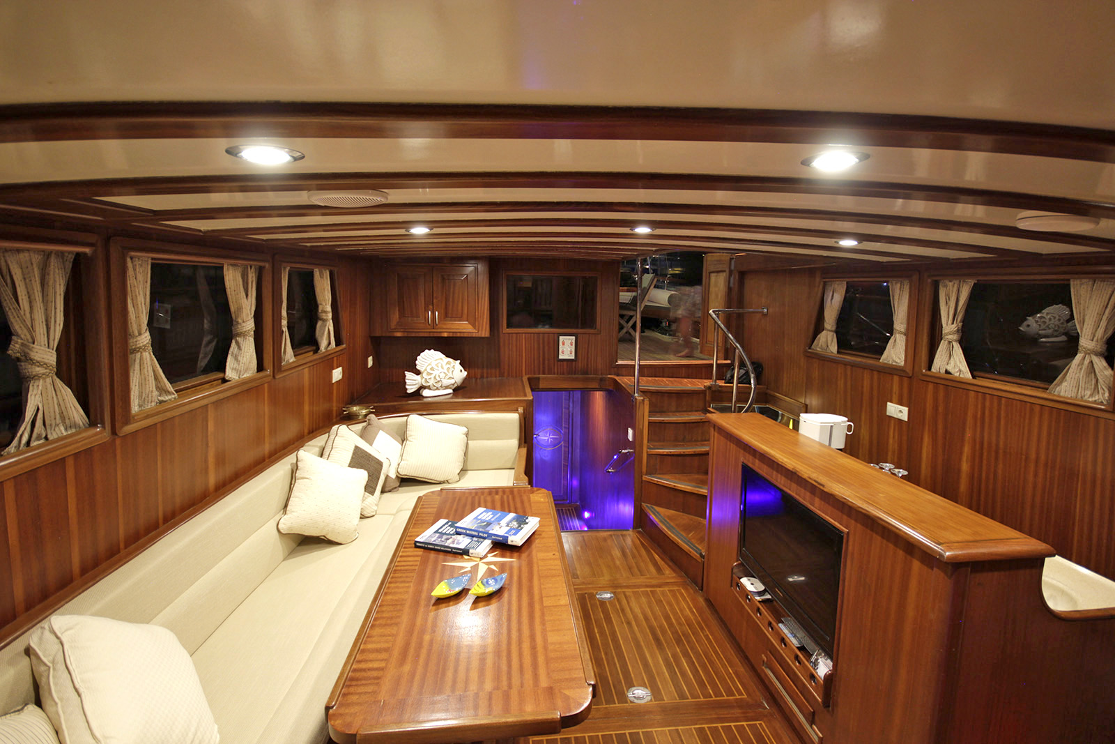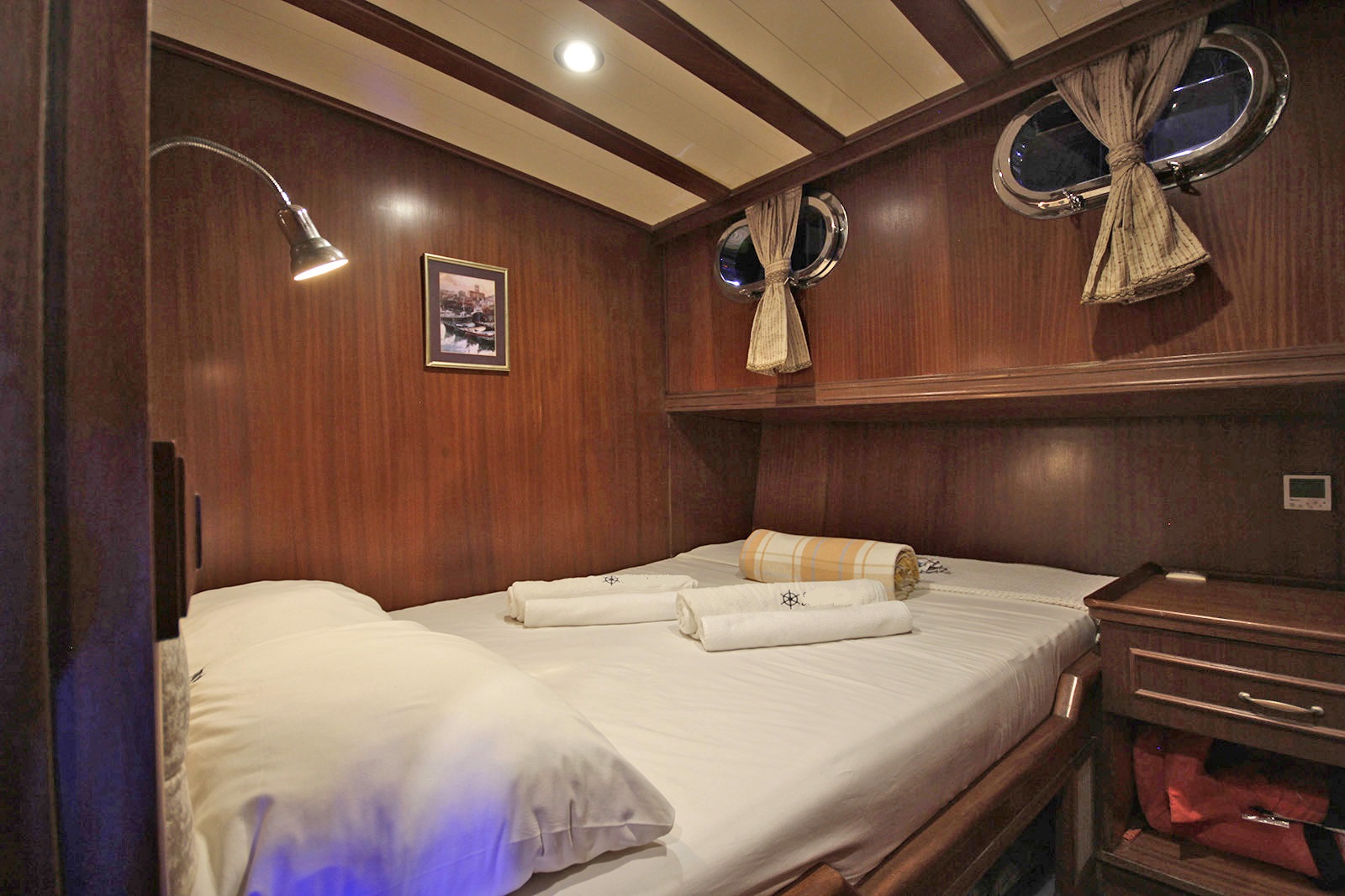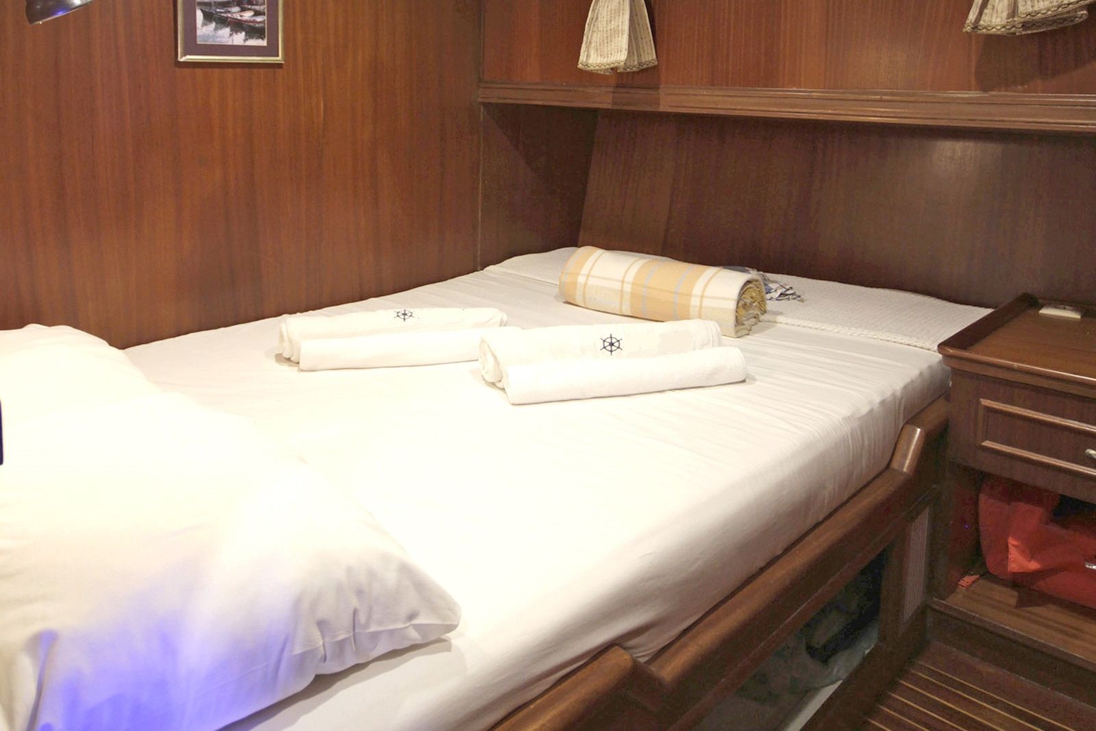 | Вместимость до 10 гостей; 2 главные каюты, 3 двухместные каюты, кондиционер, все с ванной комнатой, отдельные каюты для экипажа. |