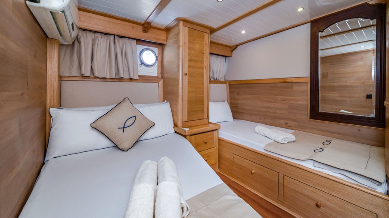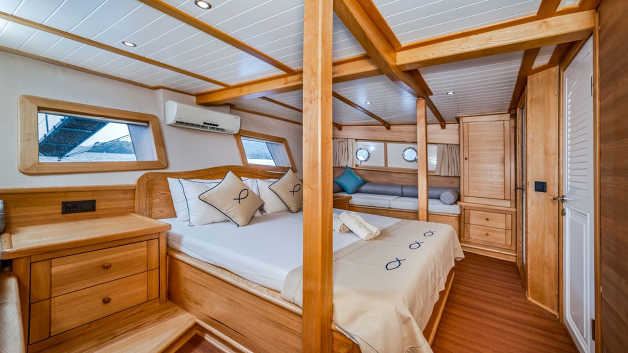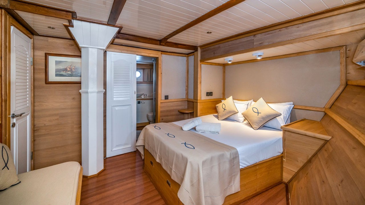 Вместимость до 12 гостей; 2 главные каюты, 2 двухместные каюты с двуспальной кроватью, 2 каюты с двумя односпальными кроватями, душевая кабина и туалеты во всех каютах, отдельные каюты для экипажа. |