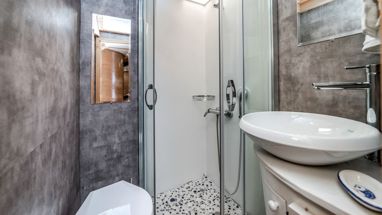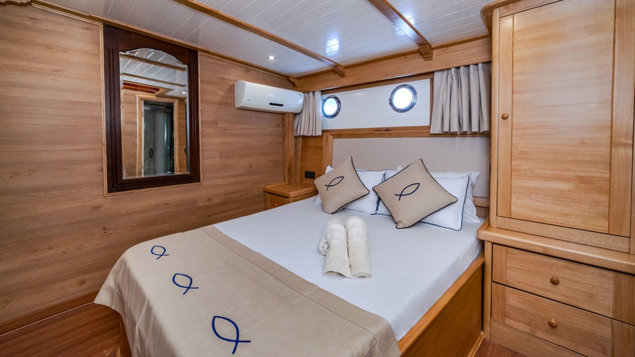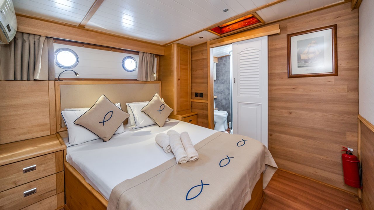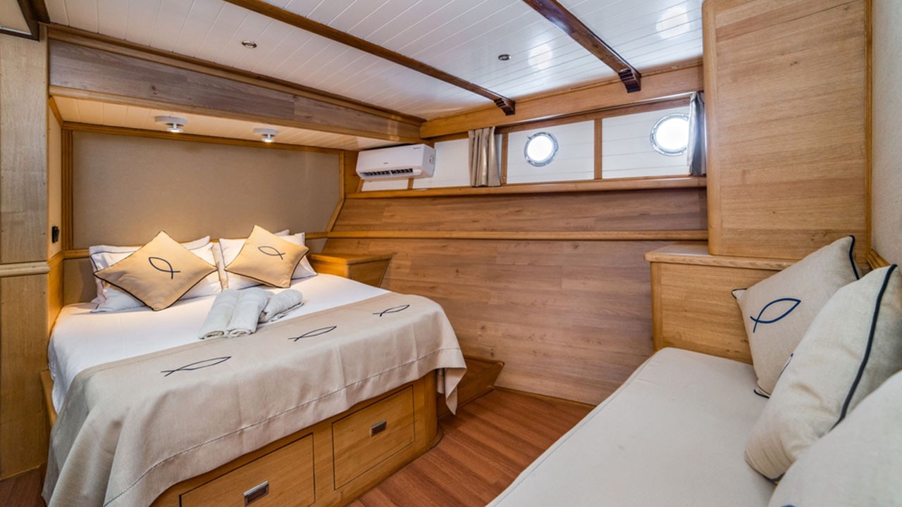 Вместимость до 12 гостей; 2 главные каюты, 2 двухместные каюты с двуспальной кроватью, 2 каюты с двумя односпальными кроватями, душевая кабина и туалеты во всех каютах, отдельные каюты для экипажа. |