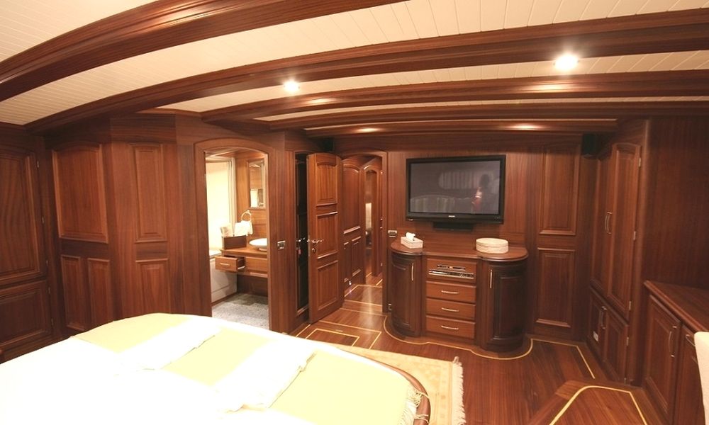 Вместимость до 12 гостей; 1 главная каюта: музыкальная система со спутниковым телевидением, размер кровати: 2,00 м x 2,10 м, 1 главная каюта: музыкальная система со спутниковым телевидением, размер кровати: 1,80 м x 2,10 м, 2 двухместные и 1 одноместная каюты: музыкальная система со спутниковым телевидением, размер кровати: 1,50 м x 2,10 м и 90 м x 2,10 м, 2 двухместные каюты: музыкальная система со спутниковым телевидением, размер кровати: 1,60 м x 2,10 м, в каждой каюте есть фен и сейф. Кондиционер, душевая кабина и туалеты домашнего типа во всех каютах, отдельные каюты для экипажа. |