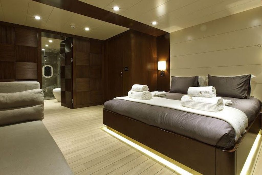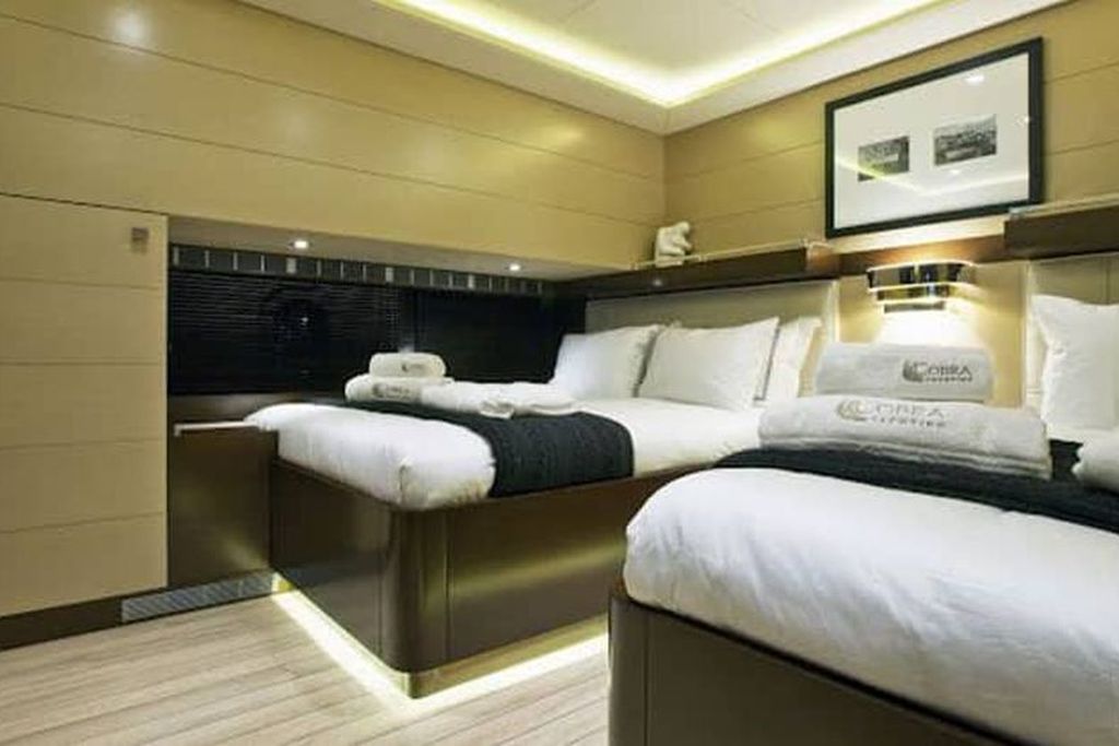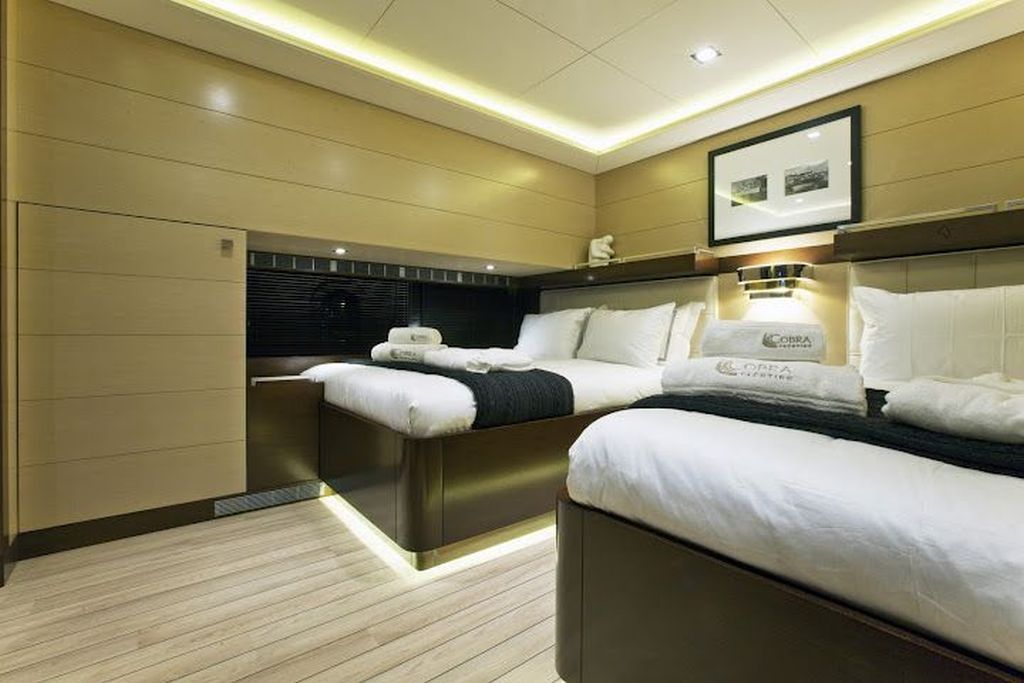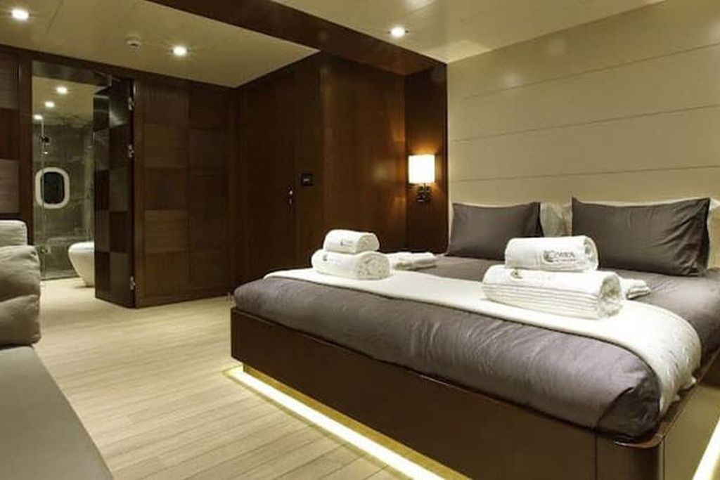 До 12 гостей; 1 VIP, 1 Master, 2 двухместные, 2 трехместные каюты, кондиционер, гардероб, душевая кабина и туалеты домашнего типа во всех каютах, отдельные каюты для экипажа. |