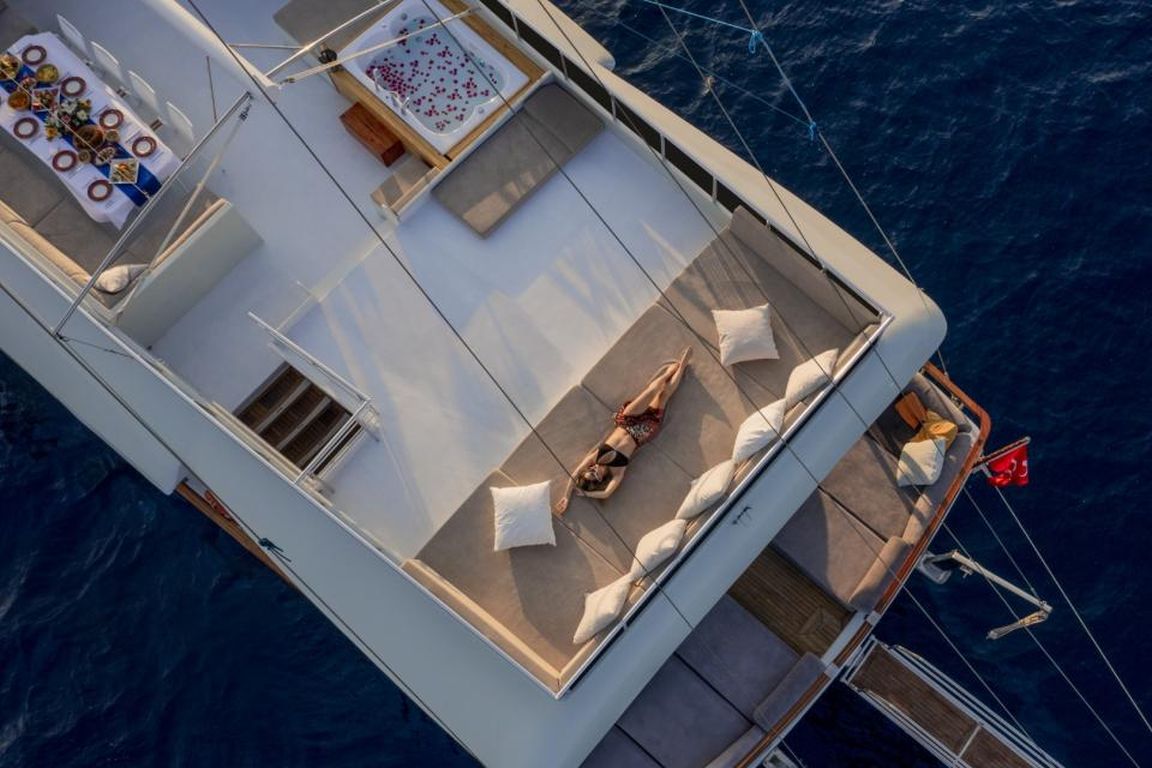 Есть каноэ, трубки, маски, ласты и простые рыболовные снасти, чтобы сделать время, проведенное вами в море, более приятным, а чтобы сделать время, проведенное вами на палубе, более веселым, есть набор для игры в рамми, нарды, игральные карты, DVD-плеер, музыкальная система и кондиционер. Наш опытный персонал на лодке будет к вашим услугам для приготовления пищи, обслуживания, ежедневной уборки и решения всех вопросов, которые могут вам понадобиться во время синего путешествия. Его капитан и команда, имеющие опыт в парусном спорте, отправятся в плавание, когда позволит погода, и вы сможете насладиться удовольствием от парусного синего круиза по Эгейскому морю. Чтобы испытать экономичный и приятный синий тур в турецких территориальных водах, мы приглашаем вас в синее путешествие на нашем Freedom Гулет и яхта.