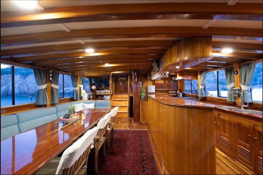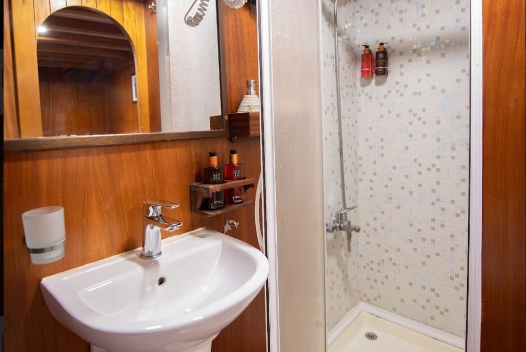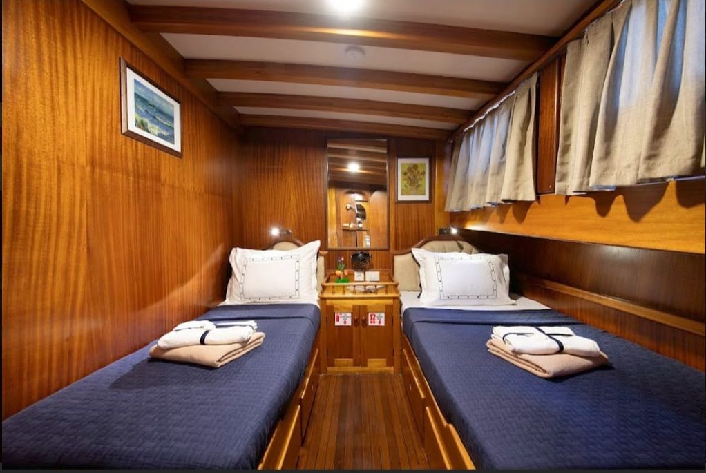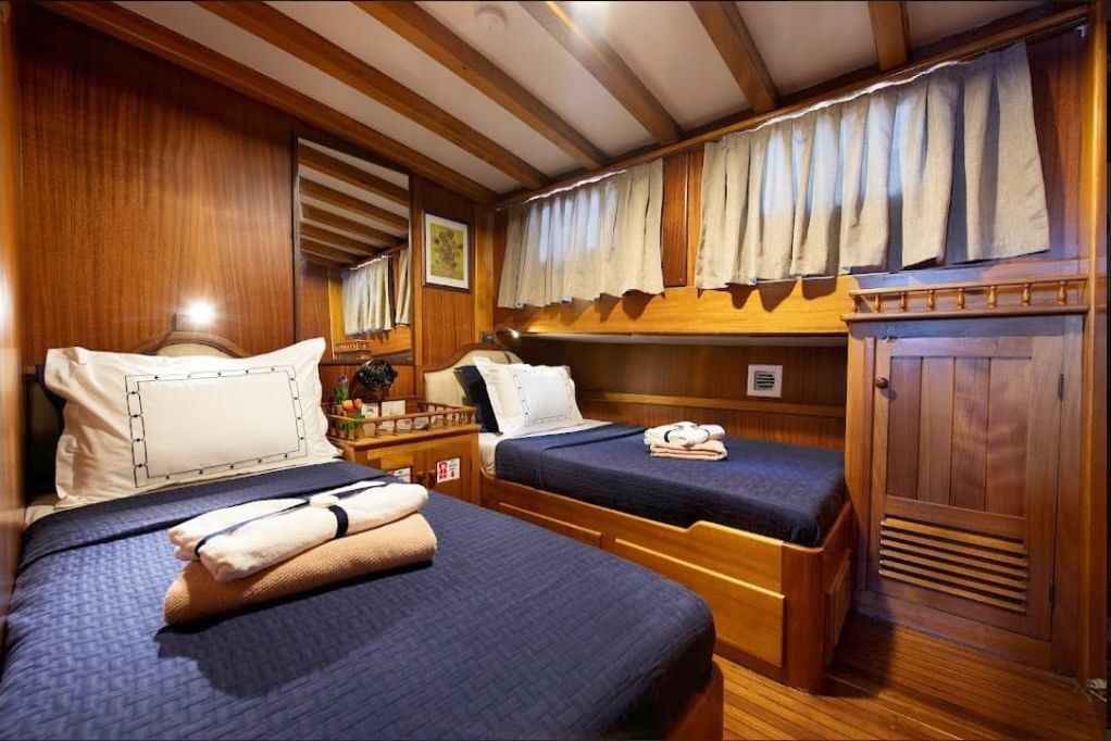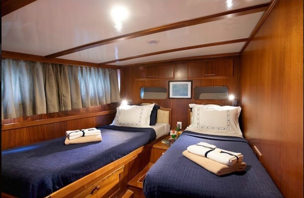 | вместимость до 12 гостей; 3 двухместные, 3 двухместные каюты, душевая кабина и туалеты домашнего типа во всех каютах, отдельные каюты экипажа. |