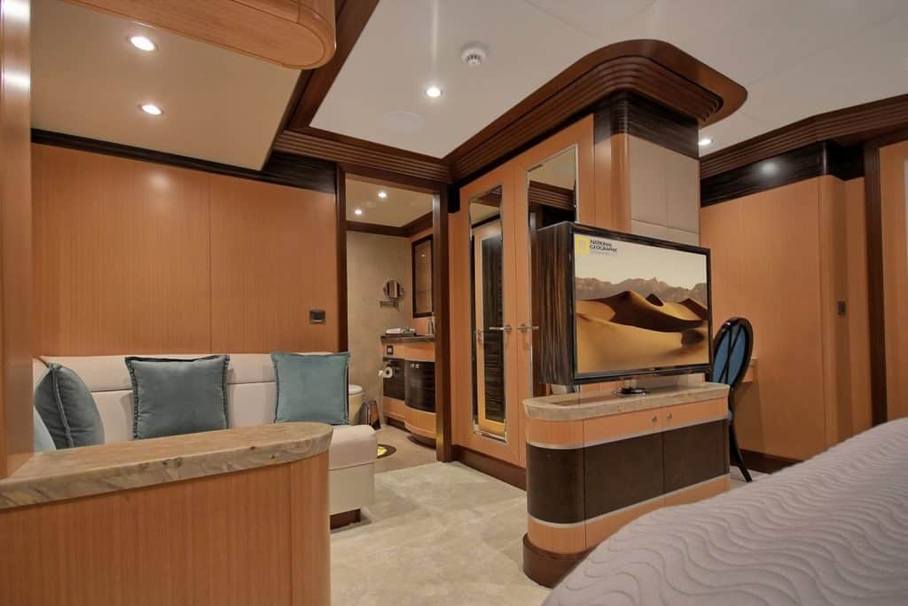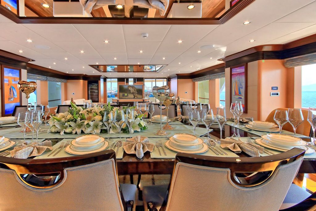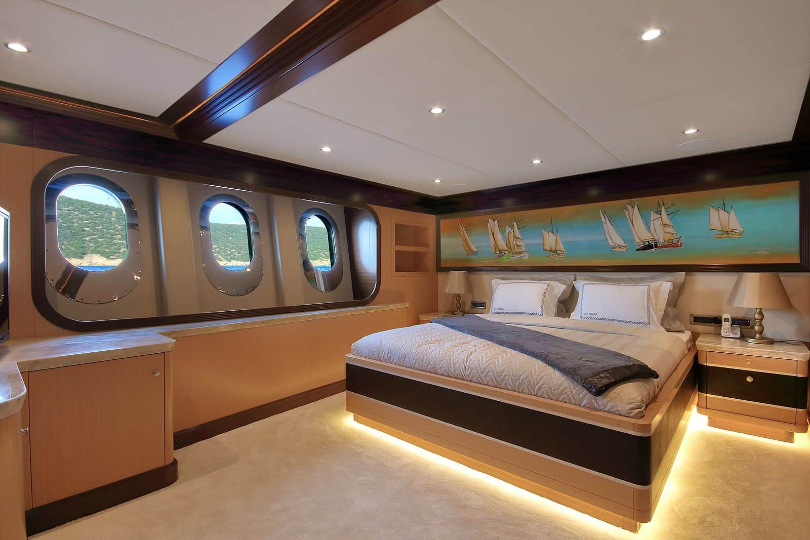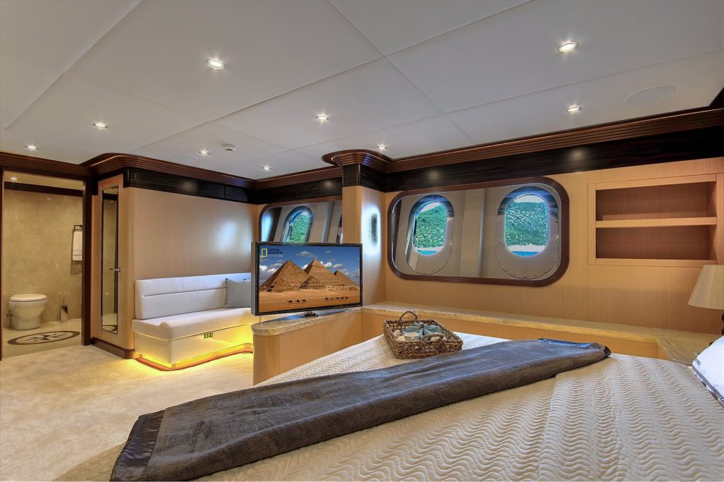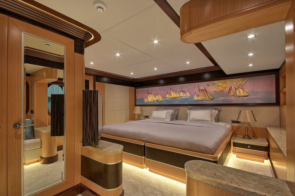 До 12 гостей; 1 главная, 3 двухместные, 2 двухместные каюты, кондиционер, гардероб, душевая кабина и туалеты домашнего типа во всех каютах, отдельные каюты для экипажа. |