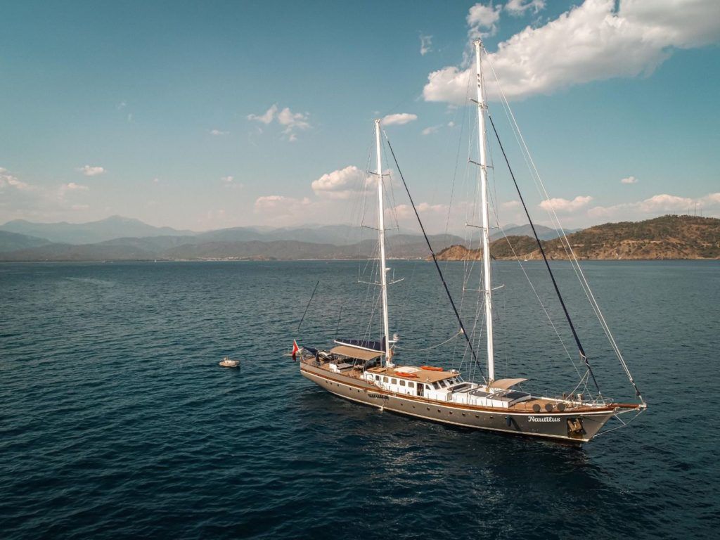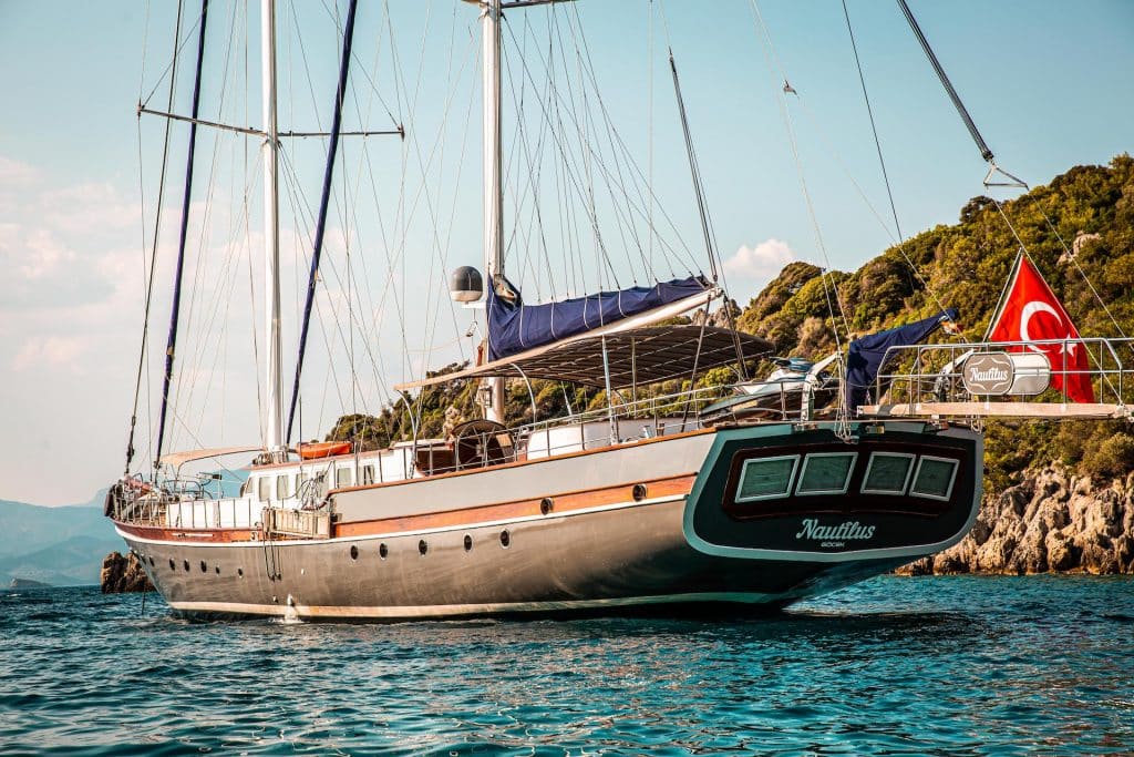 Nautilus Гулет и яхта были построены в 2006. Он предлагает вам тур Blue Voyage длиной 38 метров. Есть 6 двухместных кают, каждая с собственным душем, туалетом и кондиционером. Вы можете спланировать приятный и развлекательный круиз Blue Cruise на нашей лодке Nautilus по любому из маршрутов Бодрума, Гёджека, Мармариса и Фетхие. Наша лодка Nautilus имеет отдельные обеденные зоны на палубе и в гостиной, полностью оборудованную кухню, американский бар и отдельные жилые зоны для экипажа. На палубе есть зоны для загара, где могут легко загорать 12 человек.