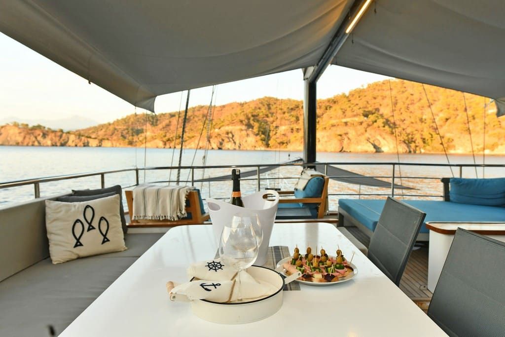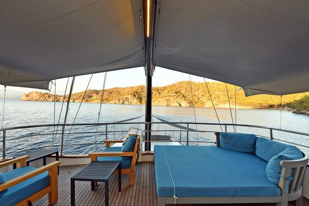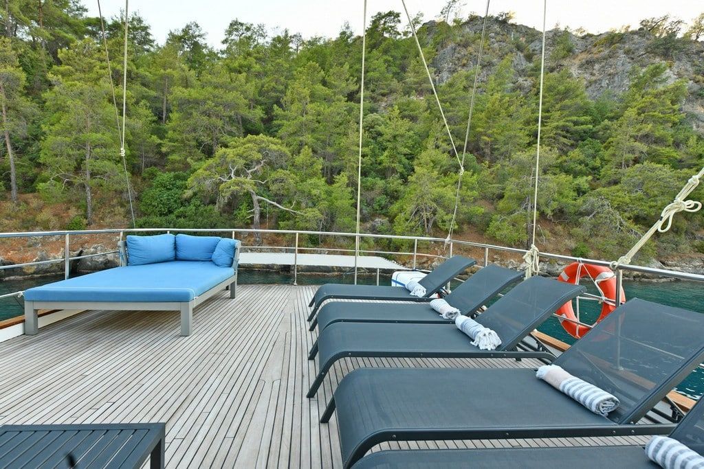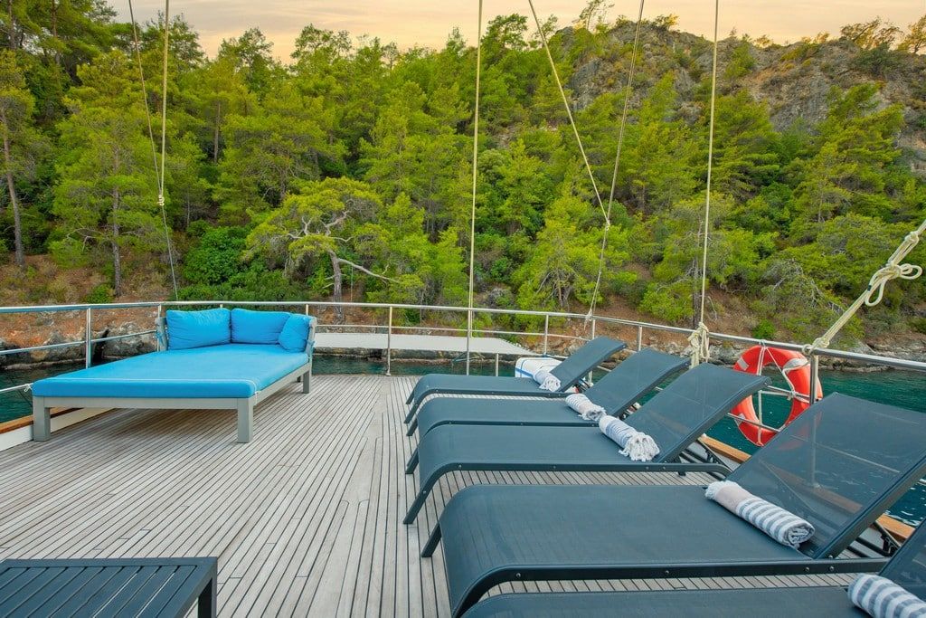 Есть каноэ, трубки, маски, ласты и простые рыболовные снасти, чтобы сделать время, проведенное вами в море, более приятным, а чтобы сделать время, проведенное вами на палубе, более веселым, есть набор для игры в рамми, нарды, игральные карты, DVD-плеер, музыкальная система и кондиционер. Наш опытный персонал на лодке будет к вашим услугам для приготовления пищи, обслуживания, ежедневной уборки и всех вопросов, которые могут вам понадобиться во время синего путешествия. Его капитан и команда, имеющие опыт в парусном спорте, отправятся в плавание, когда позволит погода, и вы сможете испытать удовольствие от парусного синего круиза по Эгейскому морю. Чтобы испытать экономичный и приятный синий тур в турецких территориальных водах, мы приглашаем вас в синее путешествие на нашем Nayk 2 Гулет и яхта.