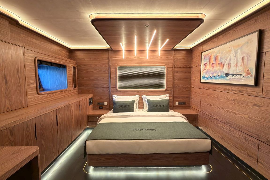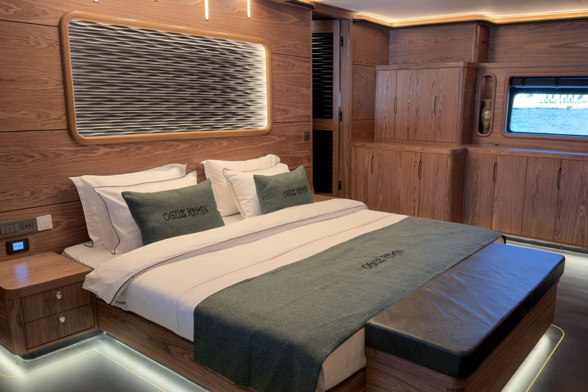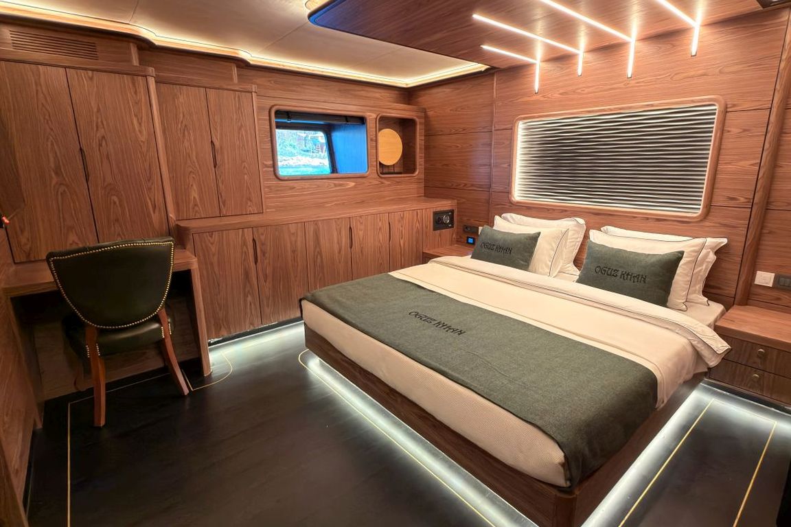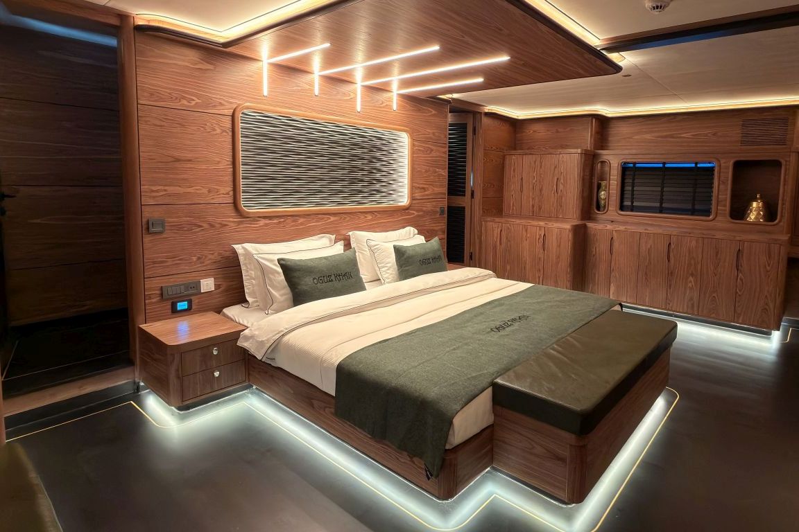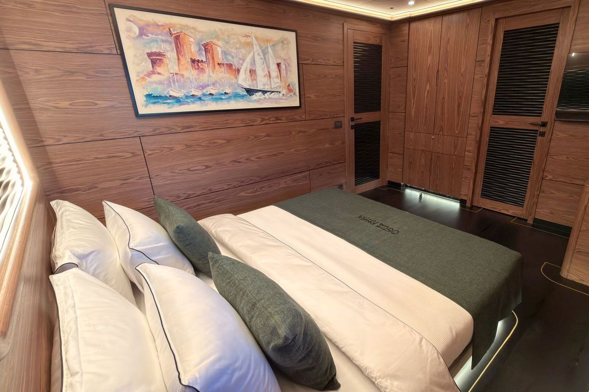 | Вместимость до 12 гостей; 1 мастер-каюта, 4 двухместные каюты, 1 каюта с двумя односпальными кроватями, кондиционер, шкаф для одежды, душевая кабина и туалеты домашнего типа во всех каютах, отдельные каюты для экипажа. |