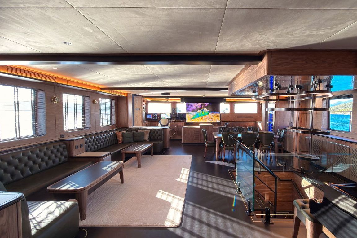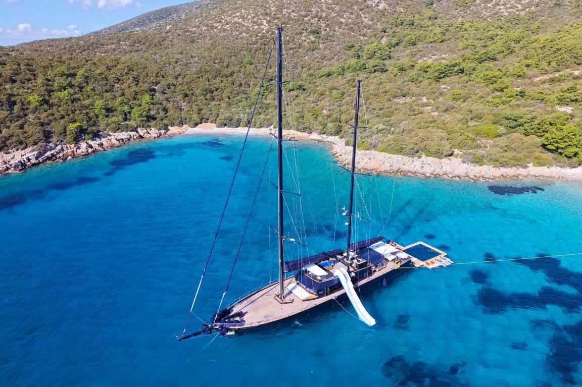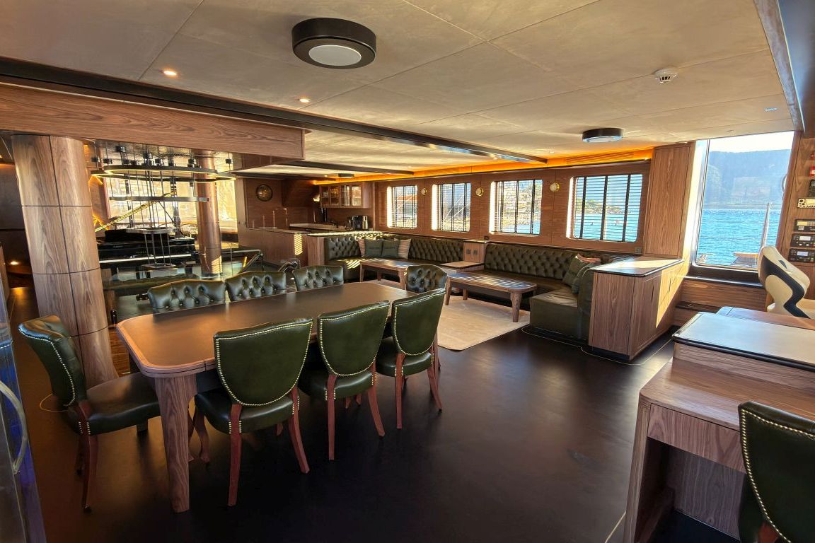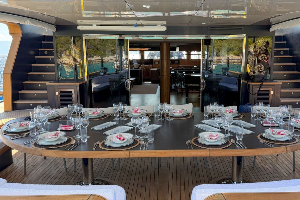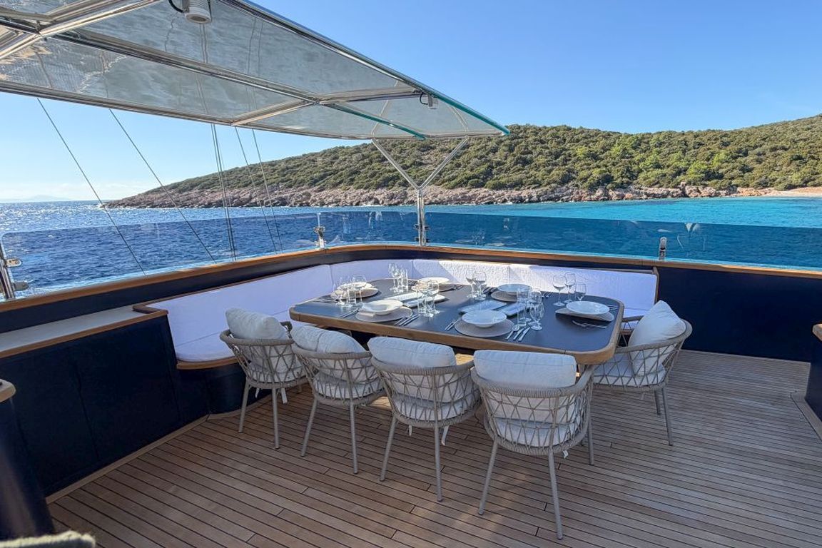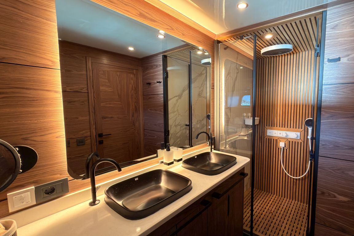 | Вместимость до 12 гостей; 1 мастер-каюта, 4 двухместные каюты, 1 каюта с двумя односпальными кроватями, кондиционер, шкаф для одежды, душевая кабина и туалеты домашнего типа во всех каютах, отдельные каюты для экипажа. |