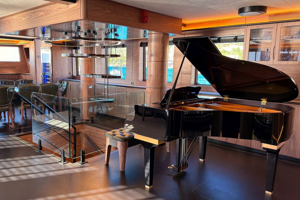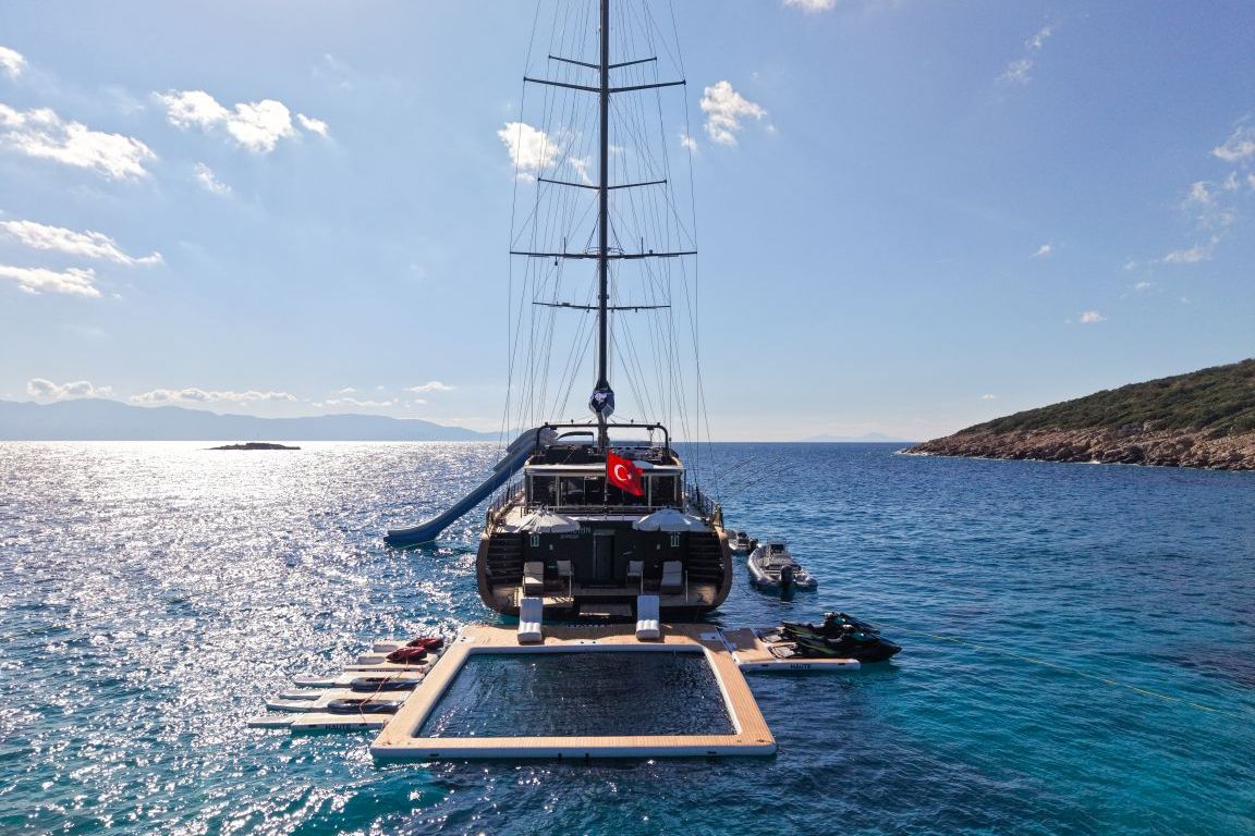 | Тендер длиной 5,80 метра с подвесным мотором 130 л.с., сервисный катер длиной 4,20 метра с подвесным мотором 60 л.с., 2 гидроцикла, 2 сибоба, 2 фойла, 2 доски для падлбординга, 2 каноэ, маски и снаряжение для дайвинга, надувной плавающий бассейн в кормовой части, надувная водная горка, смарт-телевизор, Wi-Fi, музыкальная система Bluetooth, опреснитель воды, полностью оборудованный камбуз. |