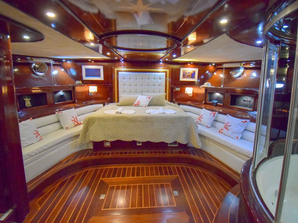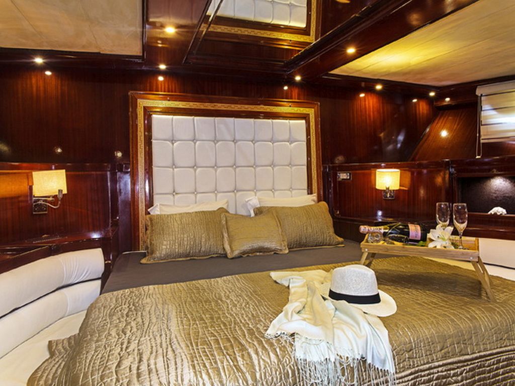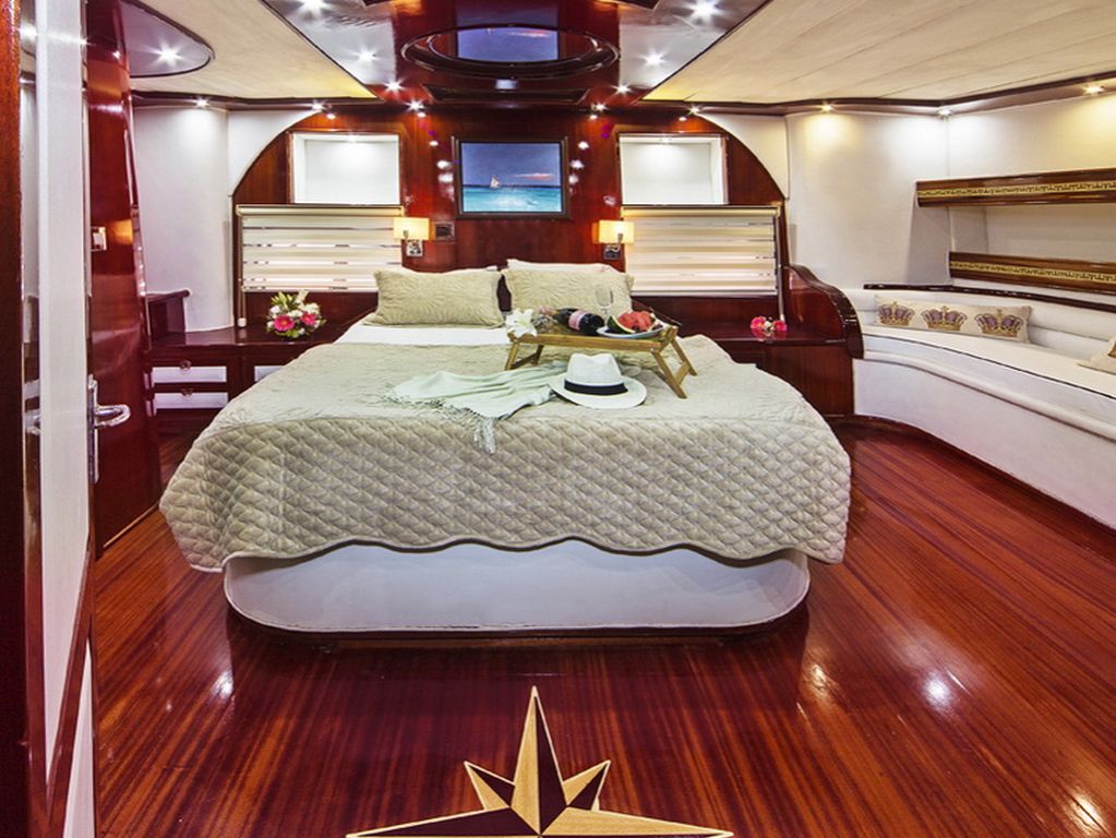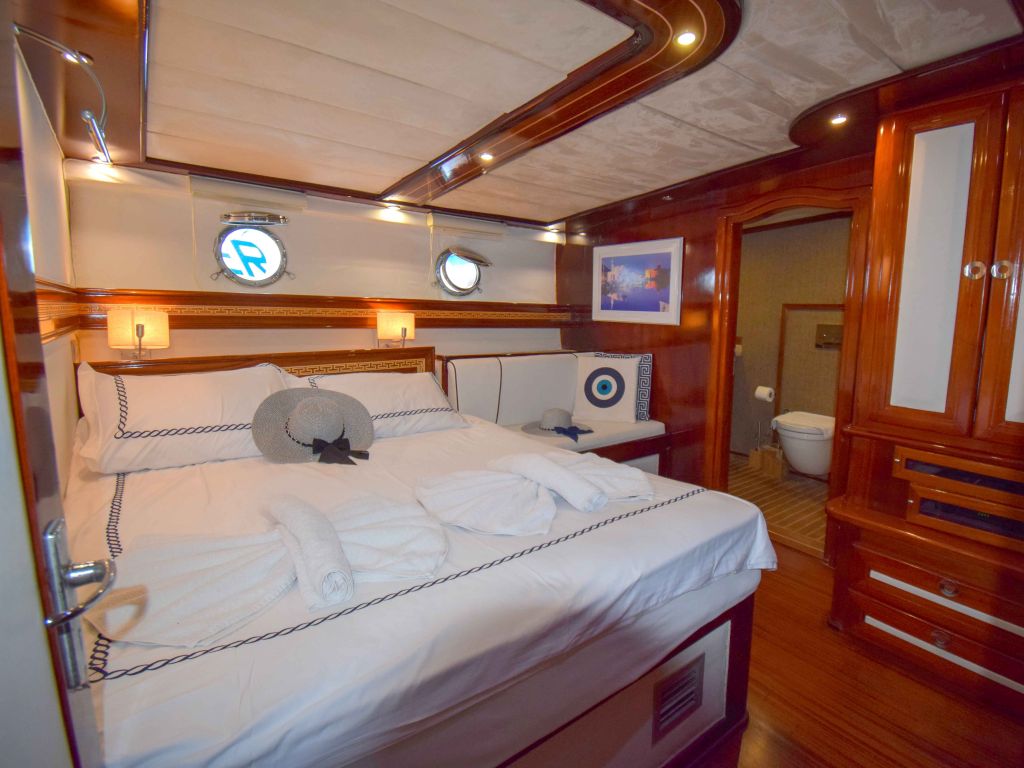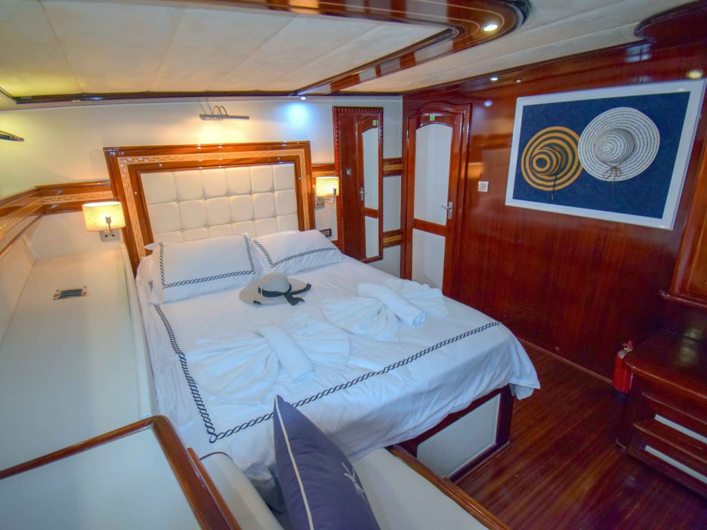 вместимость до 12 гостей; 2 мастер-каюты, 2 двухместные, 2 двухместные каюты, кондиционер, душевая кабина и туалеты домашнего типа во всех каютах, отдельные каюты экипажа. |