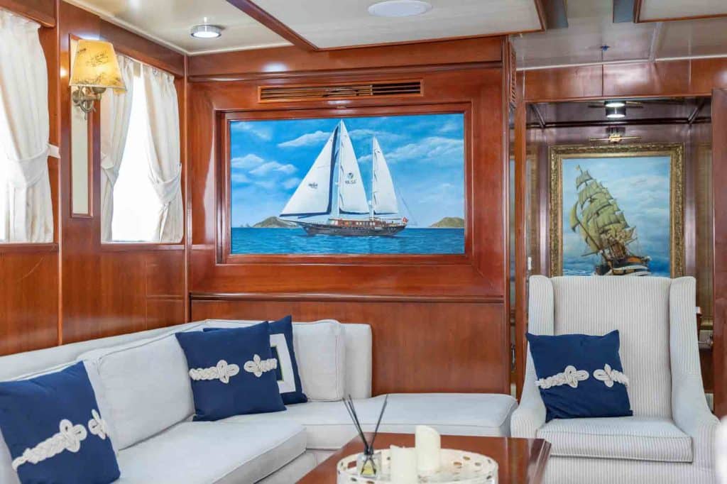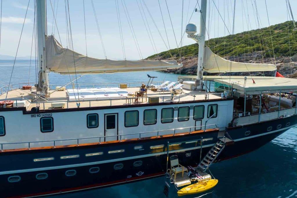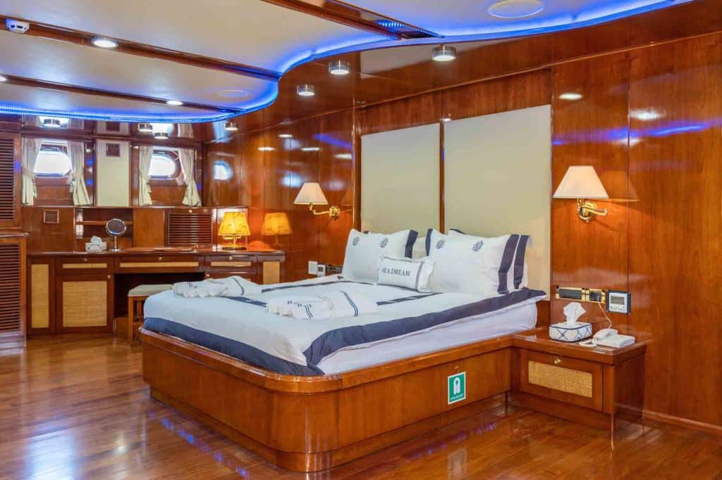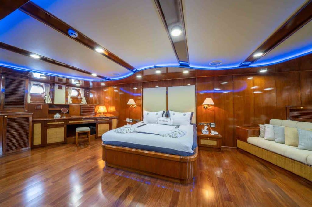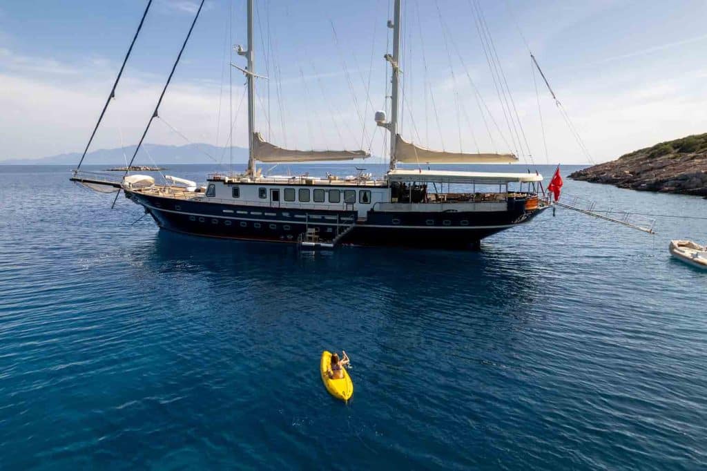 Есть каноэ, трубки, маски, ласты и простые рыболовные снасти, чтобы сделать время, проведенное вами в море, более приятным, а чтобы сделать время, проведенное вами на палубе, более веселым, есть набор для игры в рамми, нарды, игральные карты, DVD-плеер, музыкальная система и кондиционер. Наш опытный персонал на лодке будет к вашим услугам для приготовления пищи, обслуживания, ежедневной уборки и решения всех вопросов, которые могут вам понадобиться во время синего путешествия. Его капитан и команда, имеющие опыт в парусном спорте, отправятся в плавание, когда позволит погода, и вы сможете насладиться удовольствием от парусного синего круиза по Эгейскому морю. Чтобы испытать экономичный и приятный синий тур в турецких территориальных водах, мы приглашаем вас в синее путешествие на нашем Sea Dream Гулет и яхта.