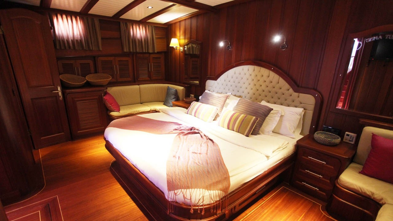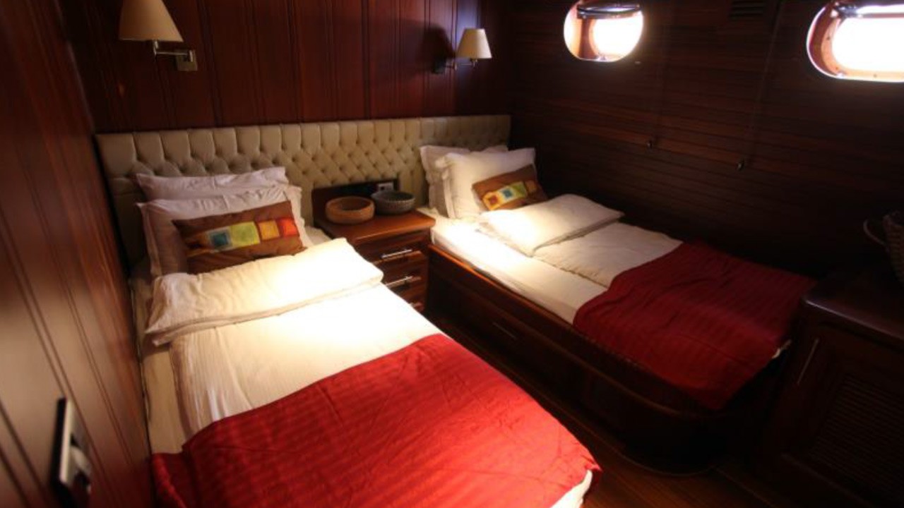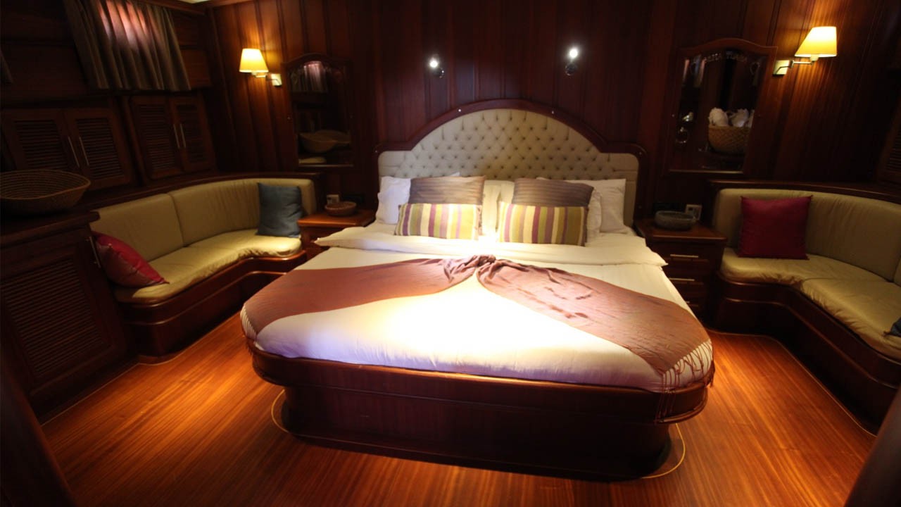 6 кают, в том числе: 2 главные каюты с двуспальной кроватью размера «queen-size», 2 каюты с двуспальной кроватью и 2 каюты с двумя односпальными кроватями. Максимальная вместимость — 12 гостей. Во всех каютах есть ванная комната с душем с сильным напором воды, индивидуальный кондиционер с дистанционным управлением и туалеты со смывом. Отдельные каюты для экипажа. |