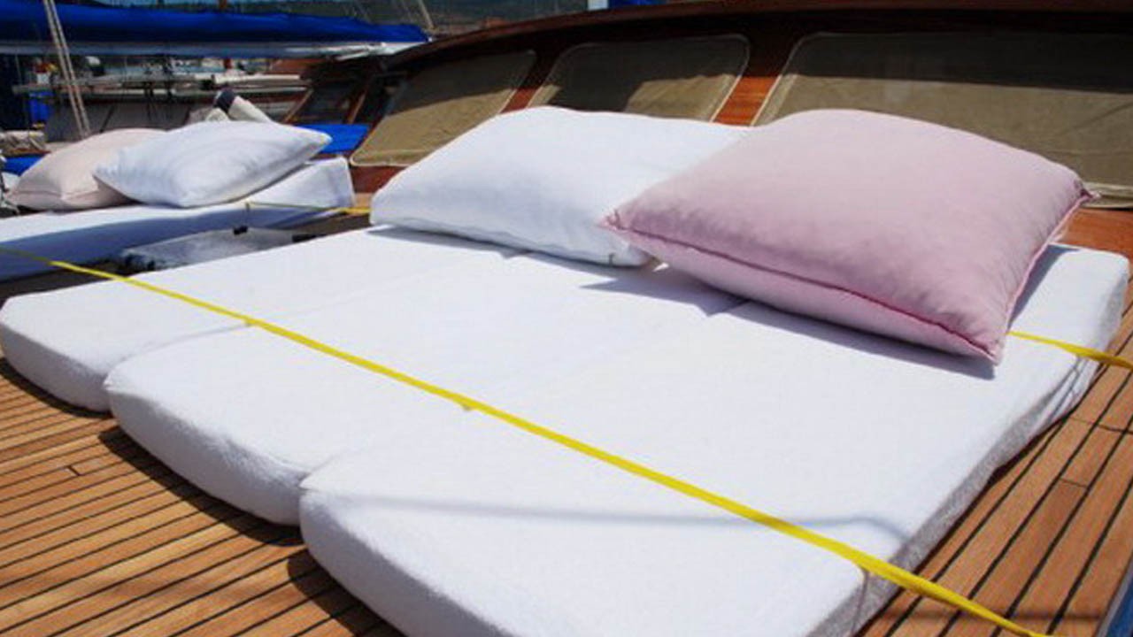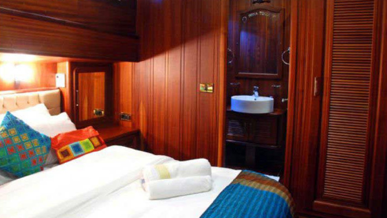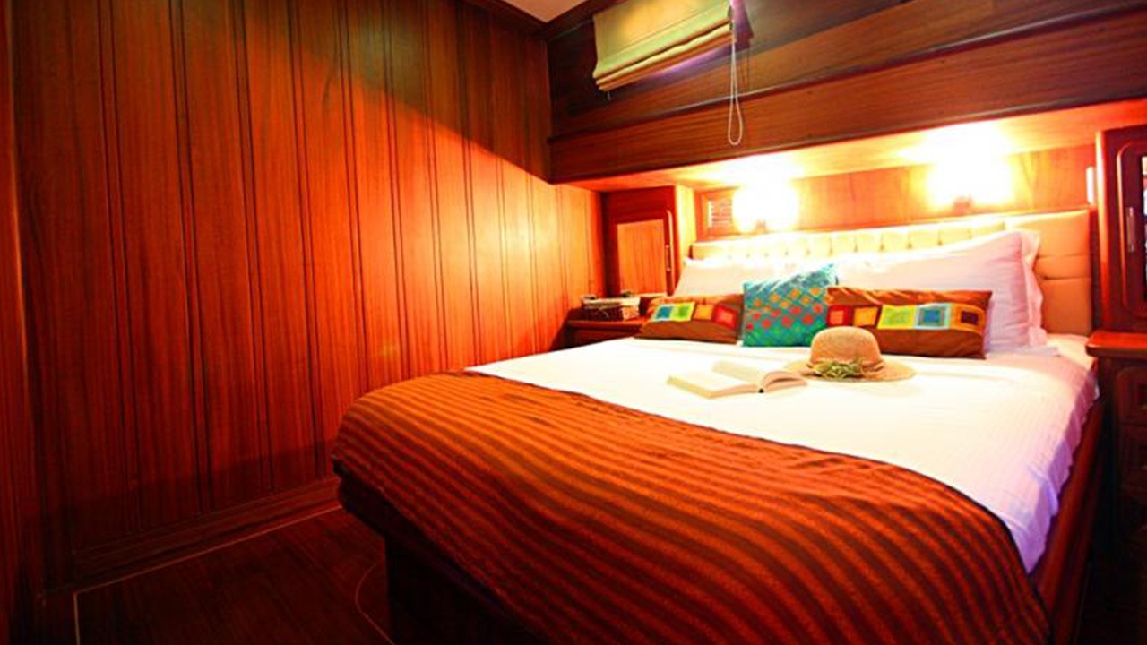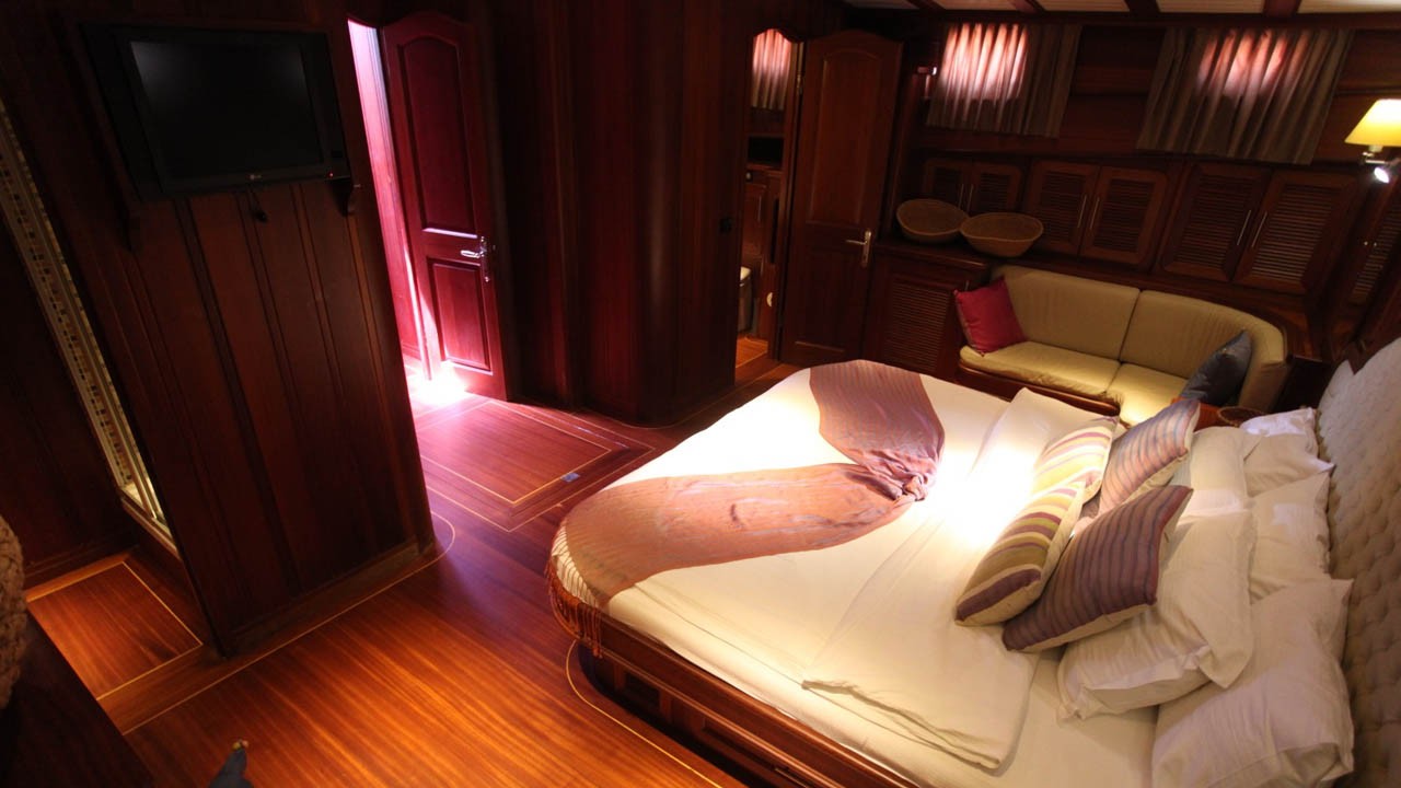 6 кают, в том числе: 2 главные каюты с двуспальной кроватью размера «queen-size», 2 каюты с двуспальной кроватью и 2 каюты с двумя односпальными кроватями. Максимальная вместимость — 12 гостей. Во всех каютах есть ванная комната с душем с сильным напором воды, индивидуальный кондиционер с дистанционным управлением и туалеты со смывом. Отдельные каюты для экипажа. |
