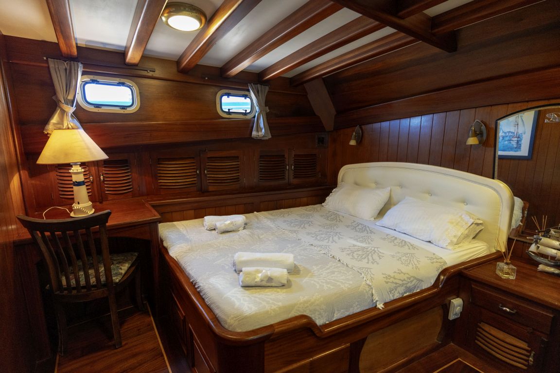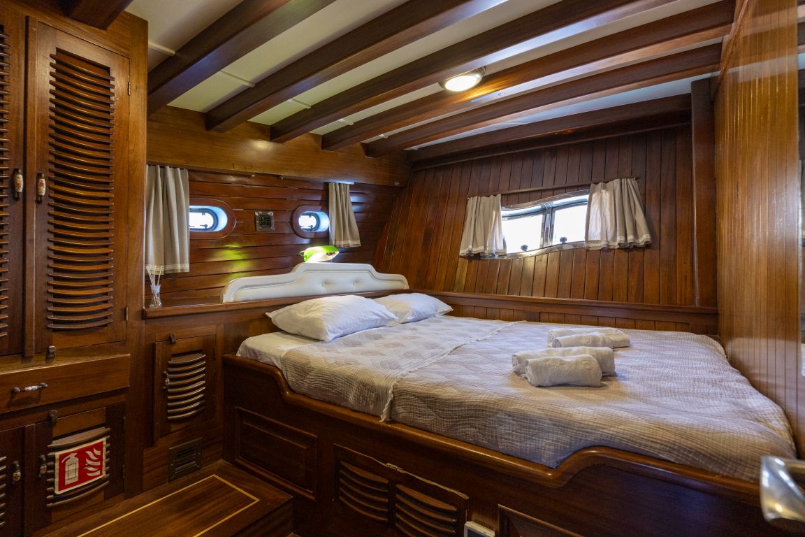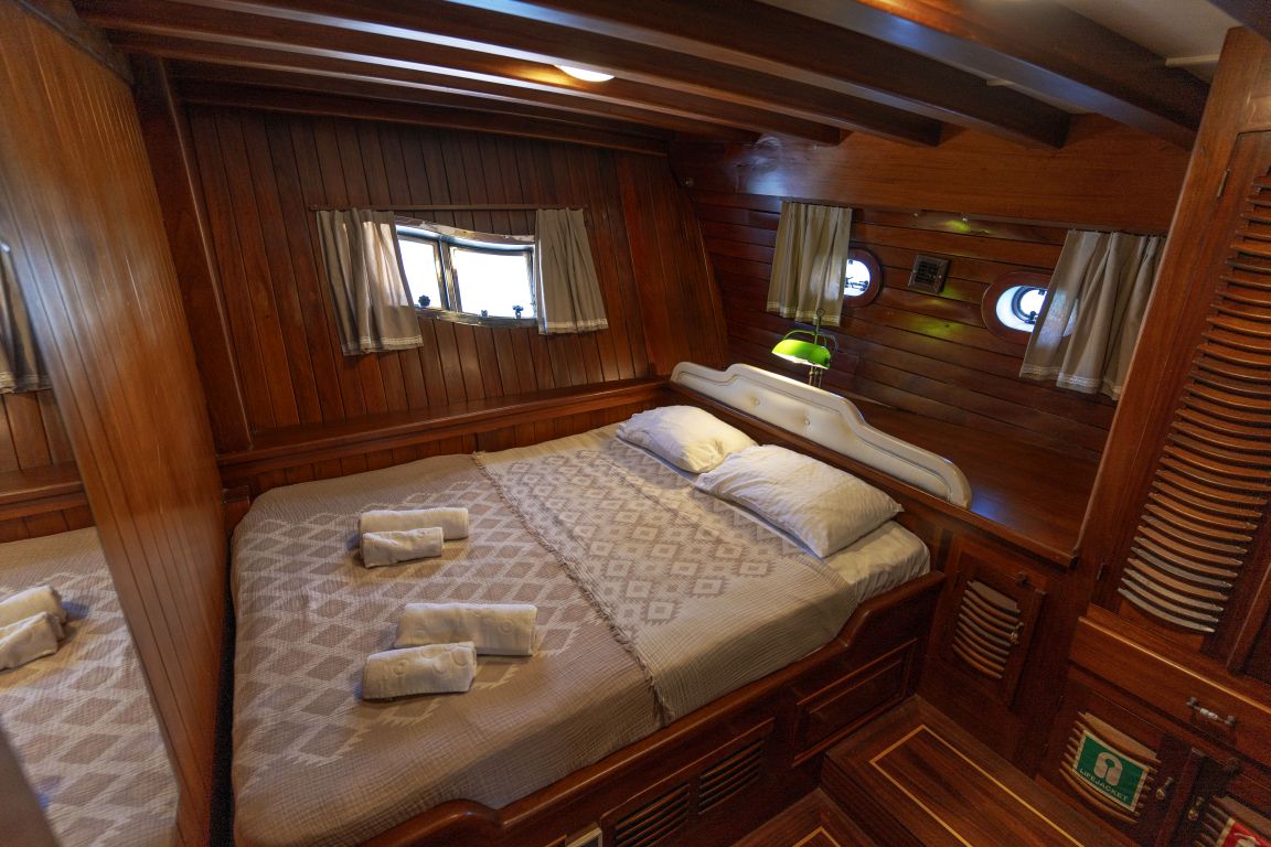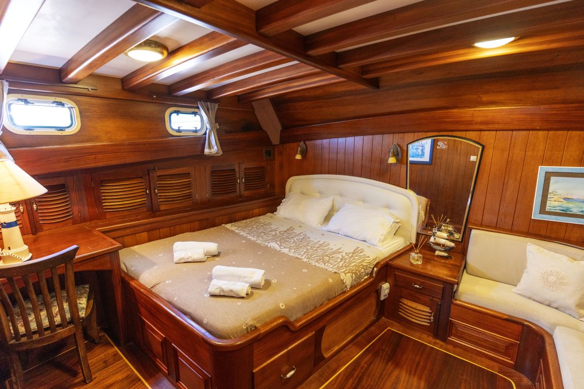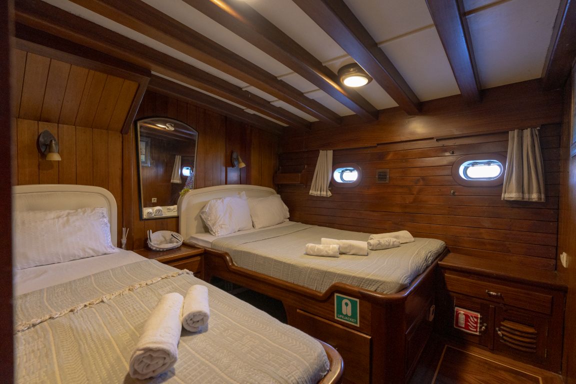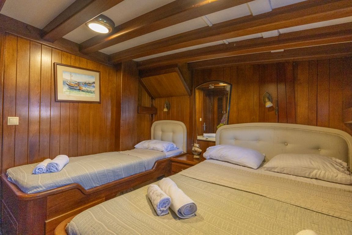 Вместимость до 12 гостей; 1 главная каюта, 2 двухместные каюты с двуспальными кроватями, 2 двухместные каюты с двумя односпальными кроватями, 1 трехместная каюта, душевая кабина и туалеты во всех каютах, отдельные каюты для экипажа. |