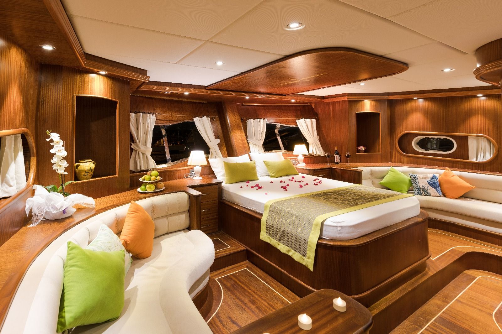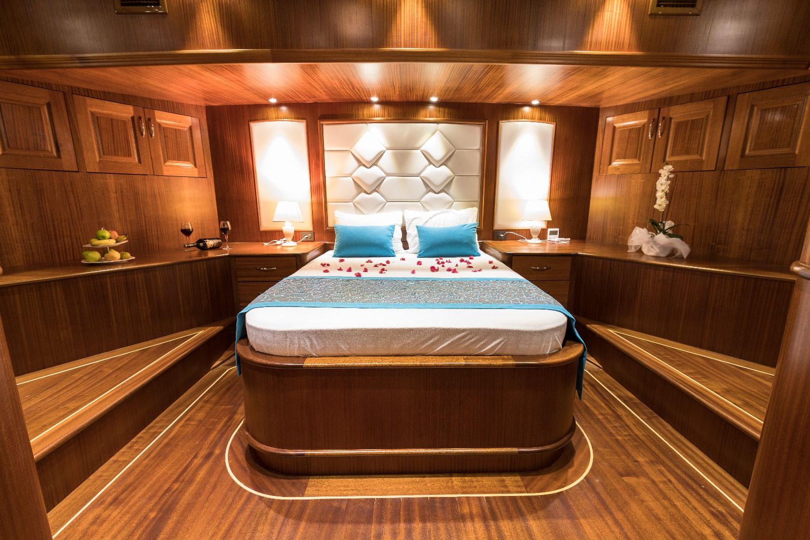 | Вместимость до 12 гостей; 2 Master, 3 Double, 1 Twin Cabin с душем и туалетом, Кондиционер: 10 часов кондиционирования воздуха включены в стоимость в день, Удобства во всех каютах: гардероб, электричество 24 В/220, Информация о постельных принадлежностях: постельное белье включено в стоимость, Доплата за дополнительную смену постельного белья: нет, Обслуживание кают: ежедневная уборка кают и ванных комнат, Туалеты: туалет домашнего типа во всех каютах, Душевые: душевая кабина, Удобства во всех ванных комнатах: шампунь, туалетная бумага, мыло, Пляжные полотенца: 1 на человека в неделю, Банные полотенца: 2 полотенца для рук и 2 больших полотенца на человека в неделю, Дополнительные пляжные или банные полотенца: по запросу |