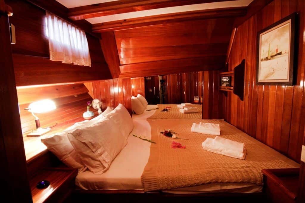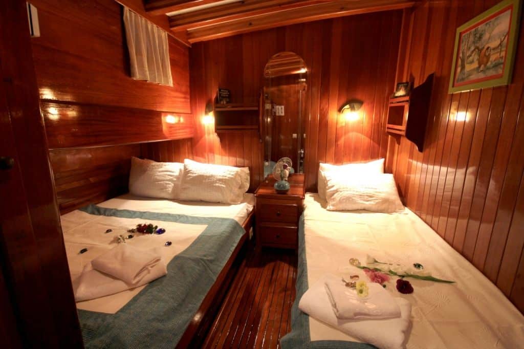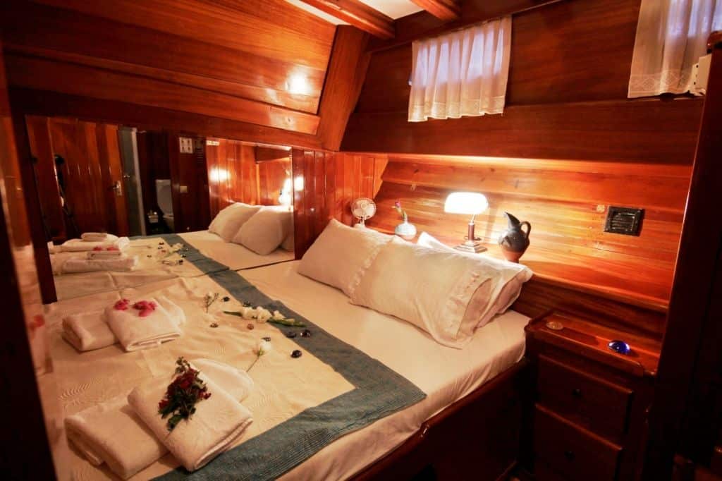 До 14 гостей; 2 двухместные, 3 трехместные, 2 двухместные каюты с двумя кроватями, кондиционер, гардероб, душевая кабина и туалеты домашнего типа во всех каютах, отдельные каюты для экипажа. |