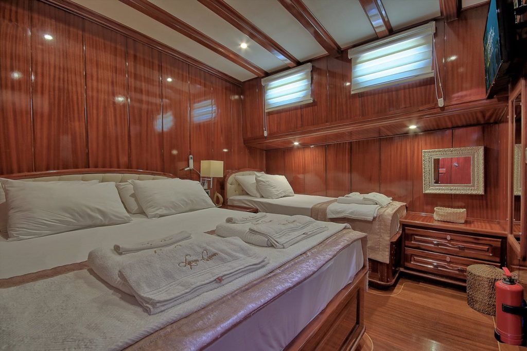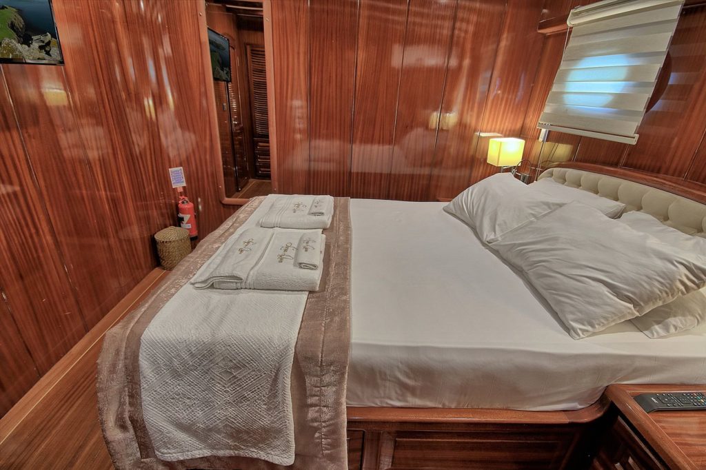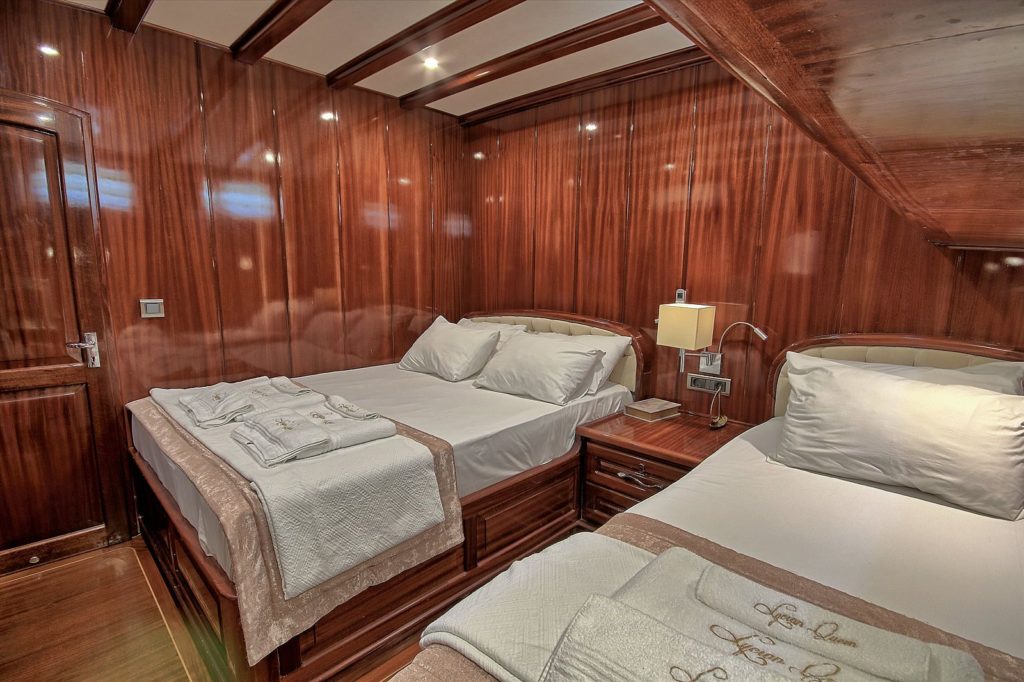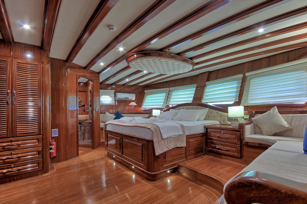 До 14 гостей; 1 VIP, 1 Master, 4 двухместные, 2 трехместные каюты, кондиционер, гардероб, душевая кабина и туалеты домашнего типа во всех каютах, отдельные каюты для экипажа. |