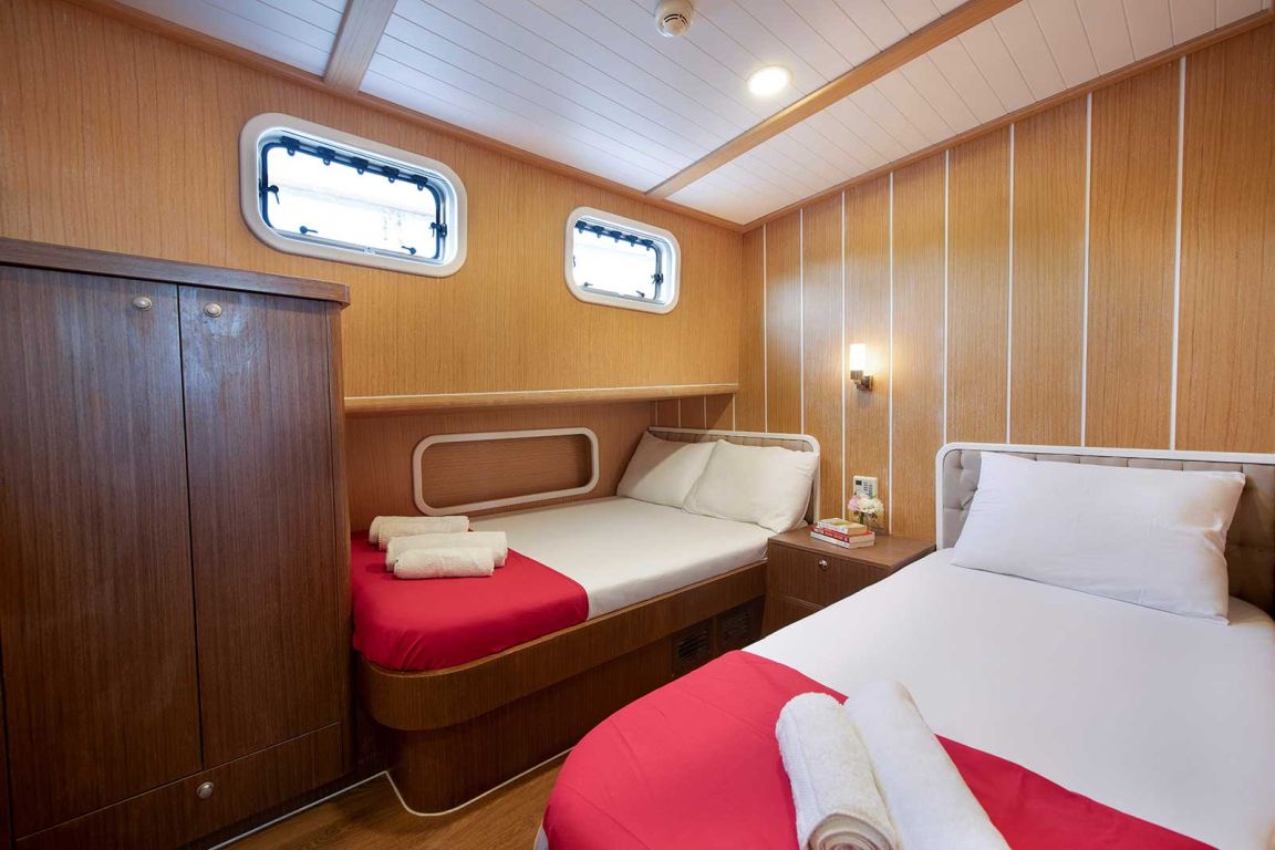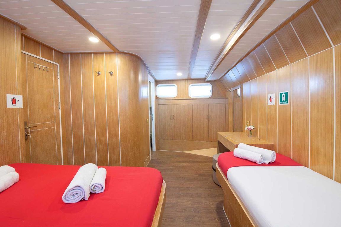 8 кают на 16 гостей Вместимость: 2 Master Suite с дополнительной 1 односпальной кроватью, 4 двуспальными кроватями с дополнительной 1 односпальной кроватью, 2 двуспальными кроватями, кондиционером, душевой кабиной и туалетами домашнего типа во всех каютах, отдельные каюты для экипажа. Круглосуточный кондиционер |