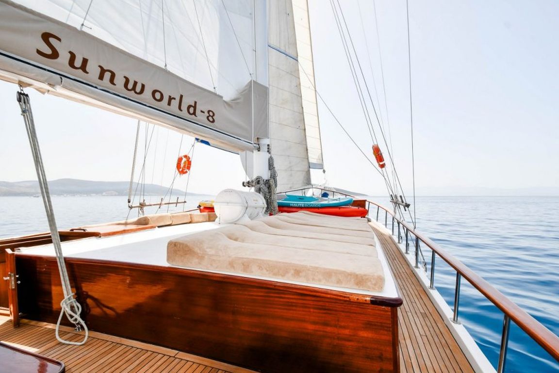 | Гулет Sunworld 8 — это 30-метровый гулет, построенный в 2001 году и полностью обновлённый в 2024 году. Судно располагает восемью каютами: пять двухместных и три трёхместные, вместимостью до 19 гостей. Каждая каюта оснащена отдельной ванной комнатой и кондиционером (работает по 10 часов в день). Ширина корпуса 6,8 метра гарантирует просторные палубы с обеденной зоной под тентом, мягкими лаунджами и местами для загара. Салон спроектирован для комфорта, включает обеденную зону и камбуз. Для водных развлечений предлагаются тендер мощностью 50 л.с., водные лыжи, каноэ, снаряжение для снорклинга, рыбалки и виндсёрфинг. Судно оснащено двигателем Iveco мощностью 360 л.с. и генератором 33 кВА, позволяющим развивать скорость 9 узлов. Sunworld 8 идеально подойдёт для больших групп, предлагая сочетание комфорта и активного отдыха. |