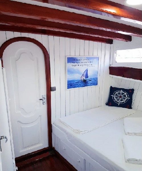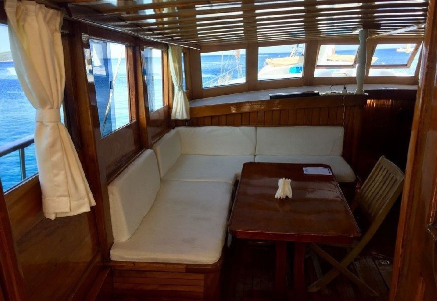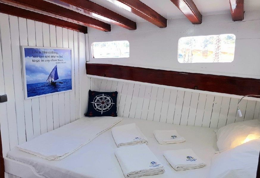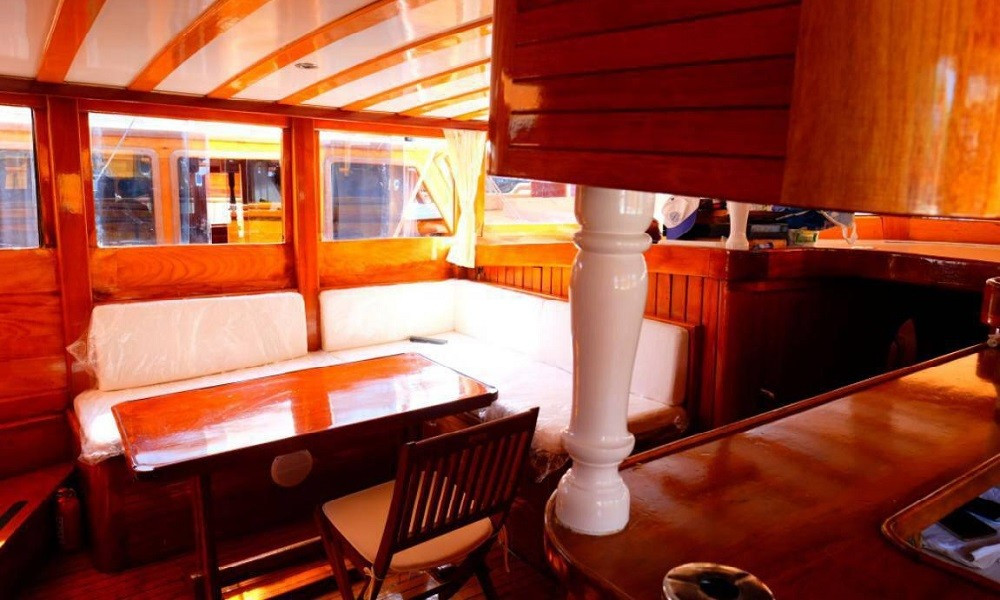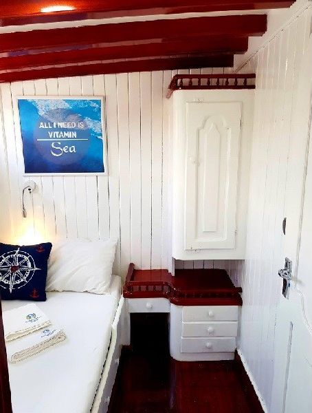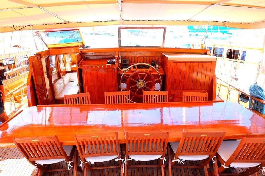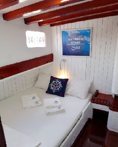 | Гулет Techne — это 24-метровый гулет, построенный в 1996 году и обновлённый в 2022 году. Судно располагает восемью двухместными каютами, рассчитанными на шестнадцать гостей. Каждая каюта оснащена кондиционером (работает четыре часа в день) и отдельной ванной комнатой. Палуба включает обеденную зону под тентом, лаунджи и просторные места для загара. Салон уютный, с обеденным столом и камбузом. Для водных развлечений предлагаются тендер мощностью 25 л.с., SUP-доска, банан, каноэ, снаряжение для снорклинга и рыбалки. Судно оснащено двигателем Scania мощностью 360 л.с. и генератором 17 кВА, что позволяет развивать скорость 8 узлов. Для спокойного отдыха на гулете Techne — это отличный выбор. |
