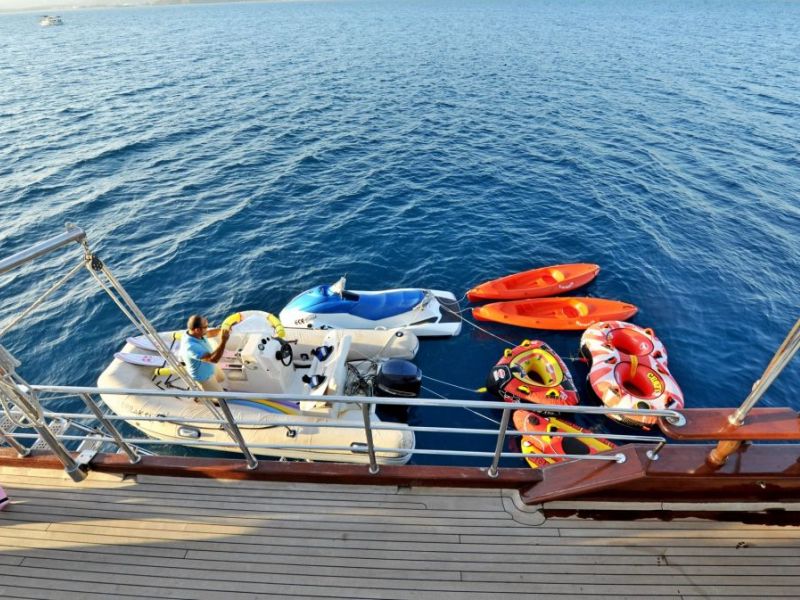 В Siniy Kruiz все лодки имеют служебную лодку, любительское рыболовное снаряжение, игральные карты, черные окорки, ласты, трубку и маски. Лодки категории Deluxe также имеют водные лыжи, гидроцикл, банан и виндсерфинг; Вы можете использовать их, заплатив только дополнительное топливо. Мы также можем организовать различные водные виды спорта в центрах водных видов спорта.
